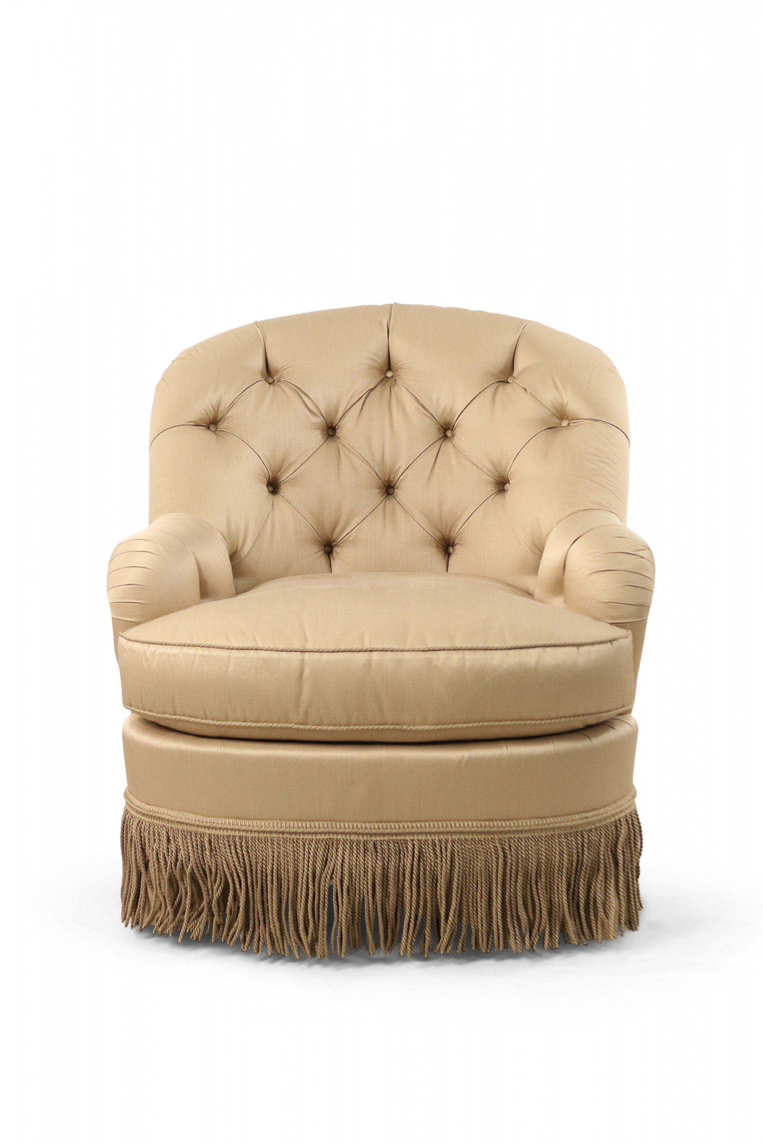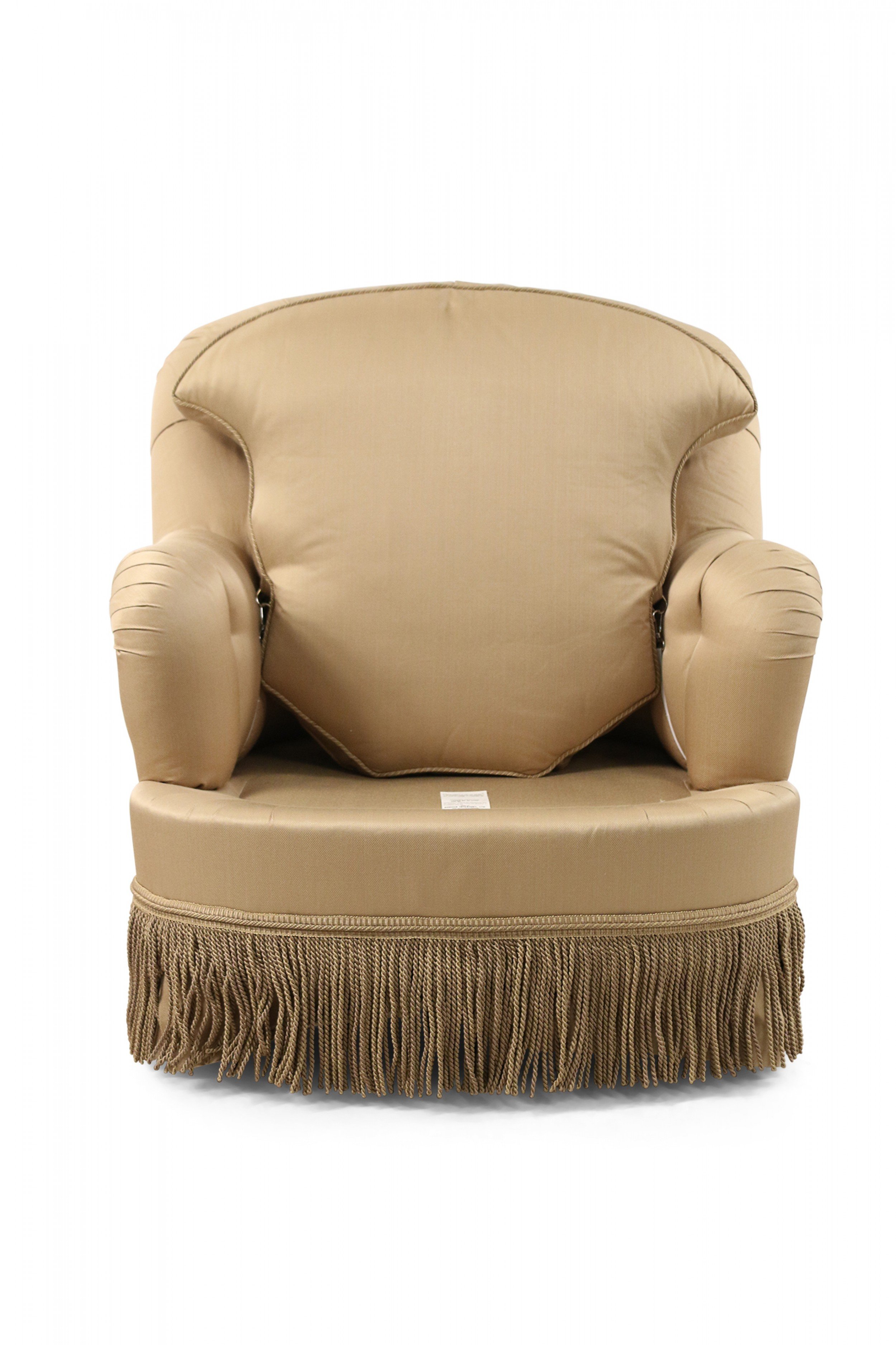 English Victorian-style beige tufted upholstered tub armchair with gold fringe around the base.