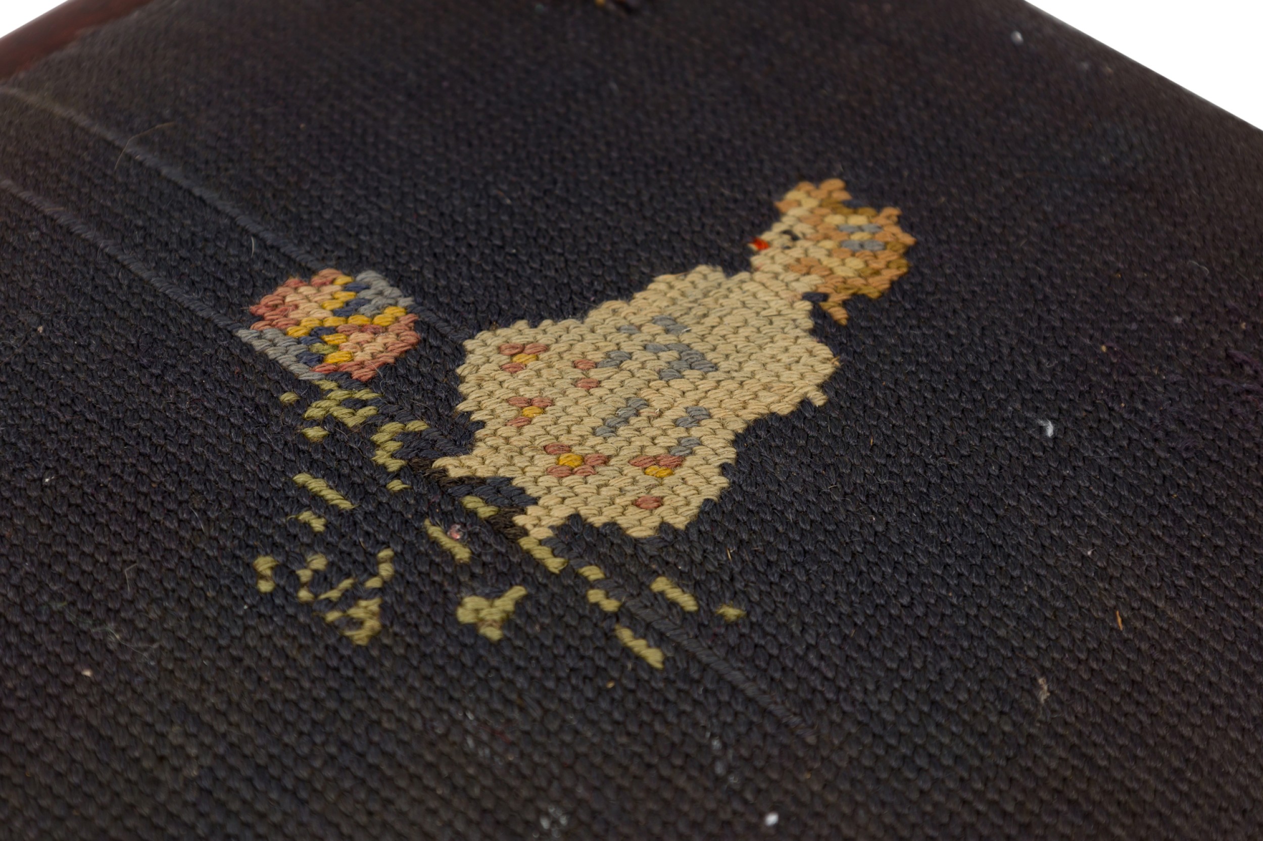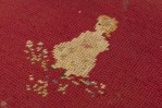 PAIR of American Victorian child's chairs with a needlepoint seat with one being red and the other being black, both with a small girl in the center (PRICED AS PAIR)