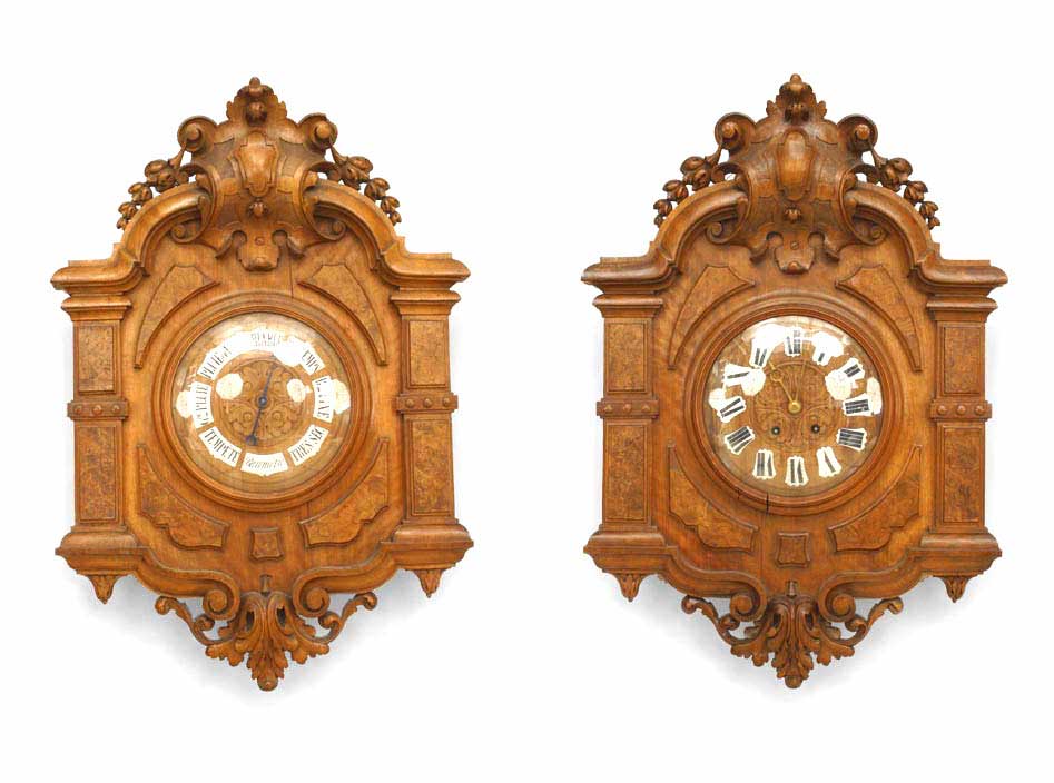 Pair of English Victorian Walnut Wall Clock & Barometer