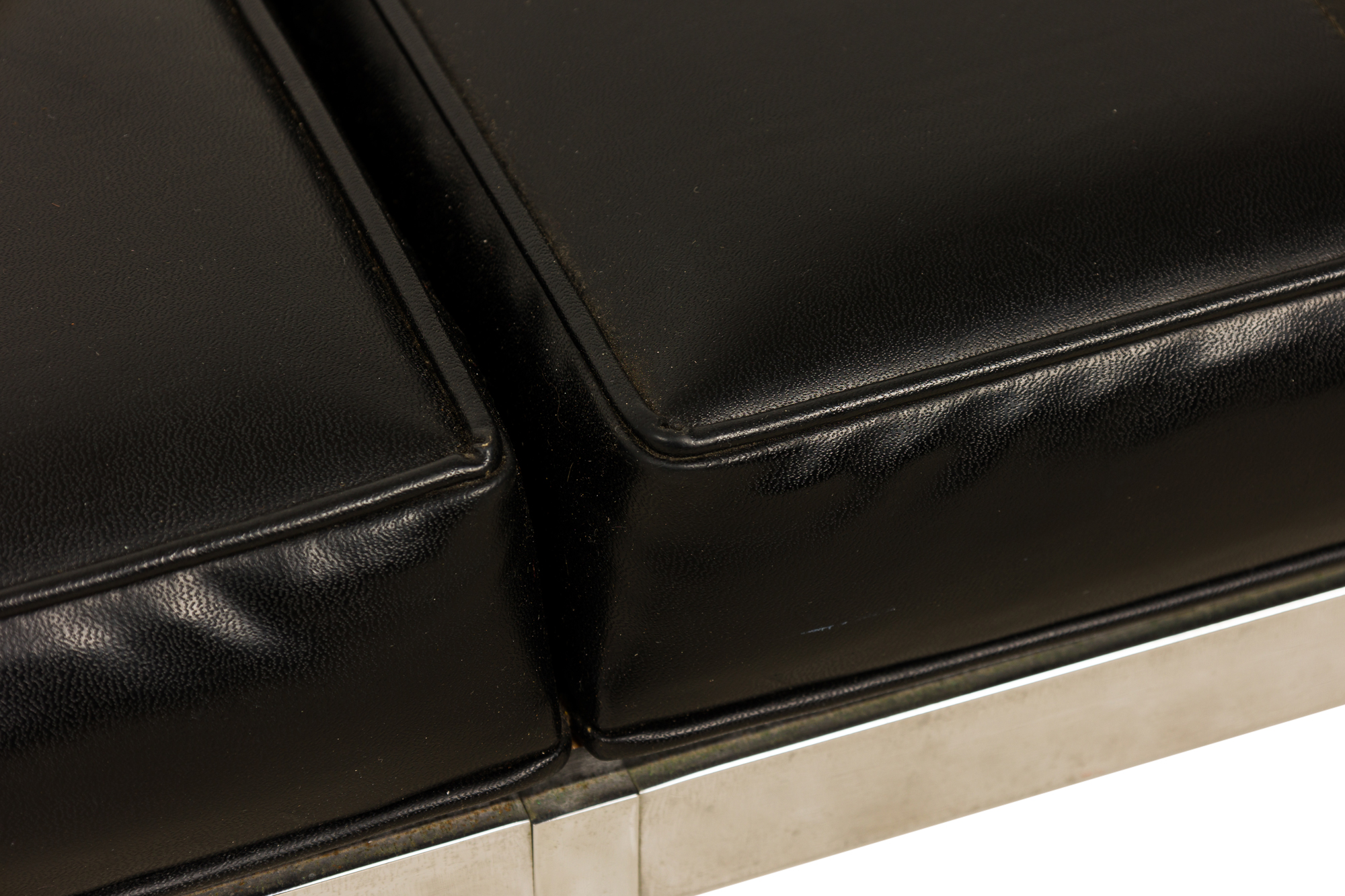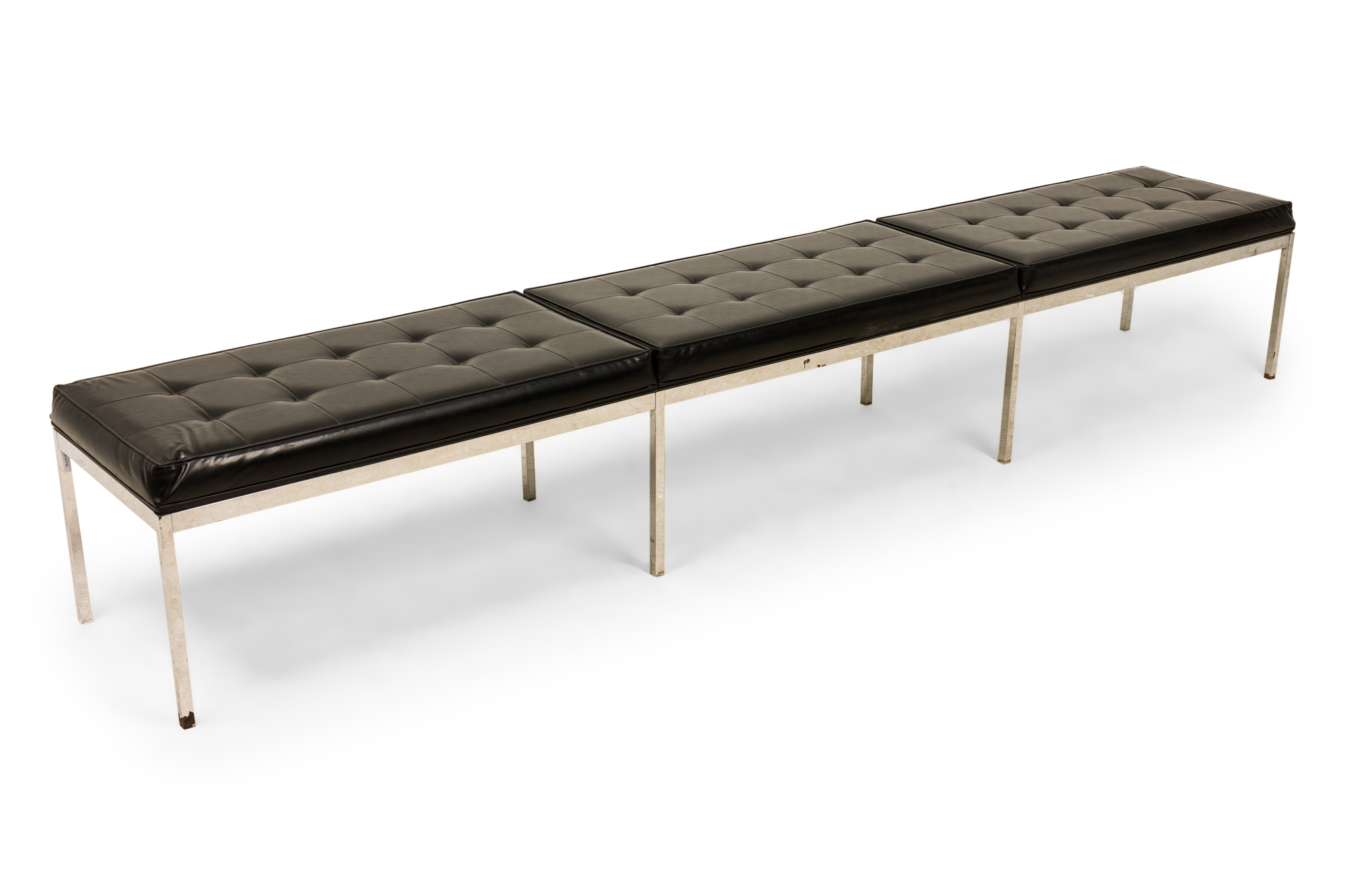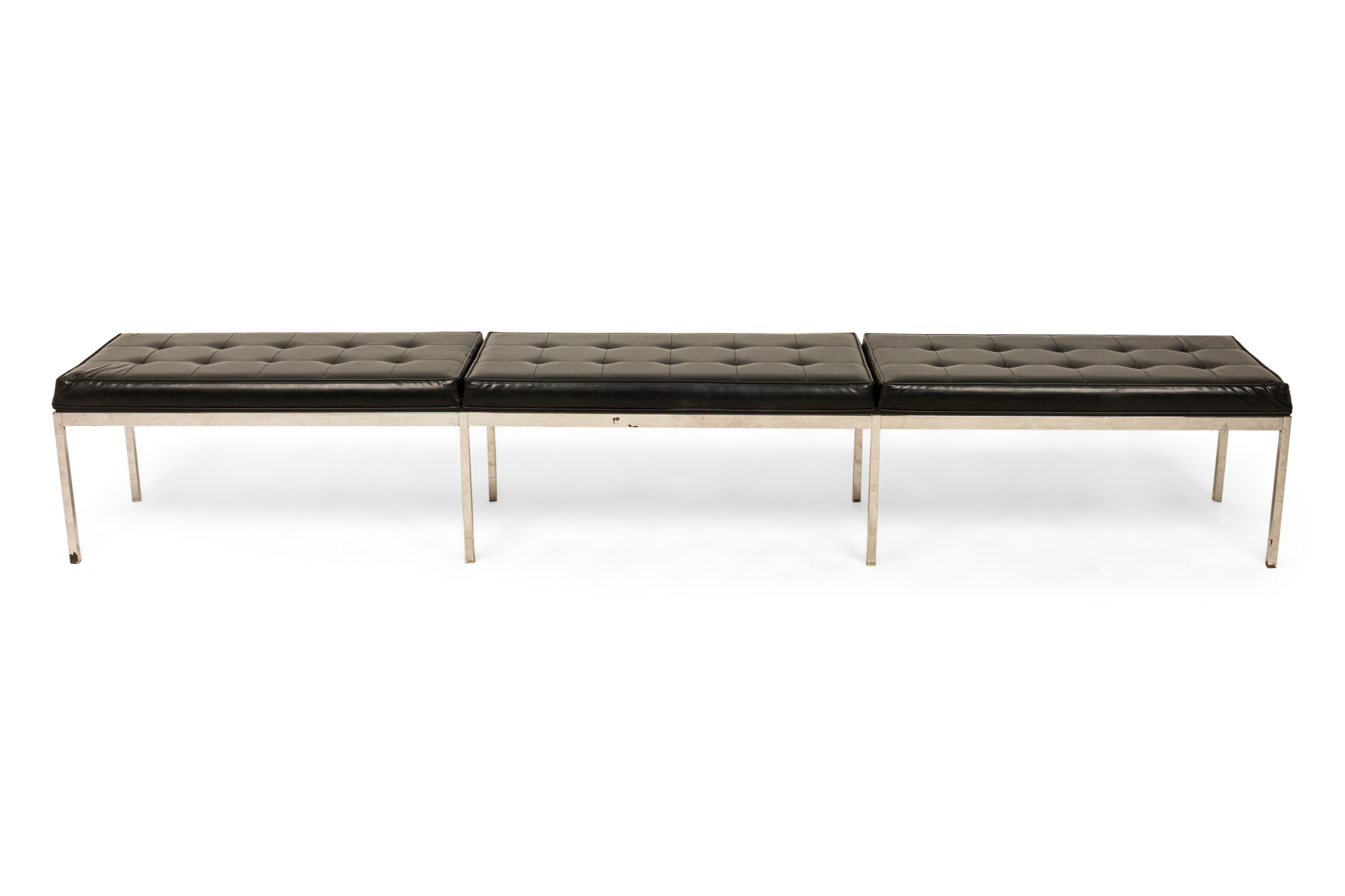PAIR of American Mid-Century museum benches with a black leather upholstered seats with button tufting, resting on square tube chrome bases. (FLORENCE KNOLL FOR KNOLL INTERNATIONAL)(PRICED AS PAIR).