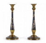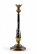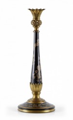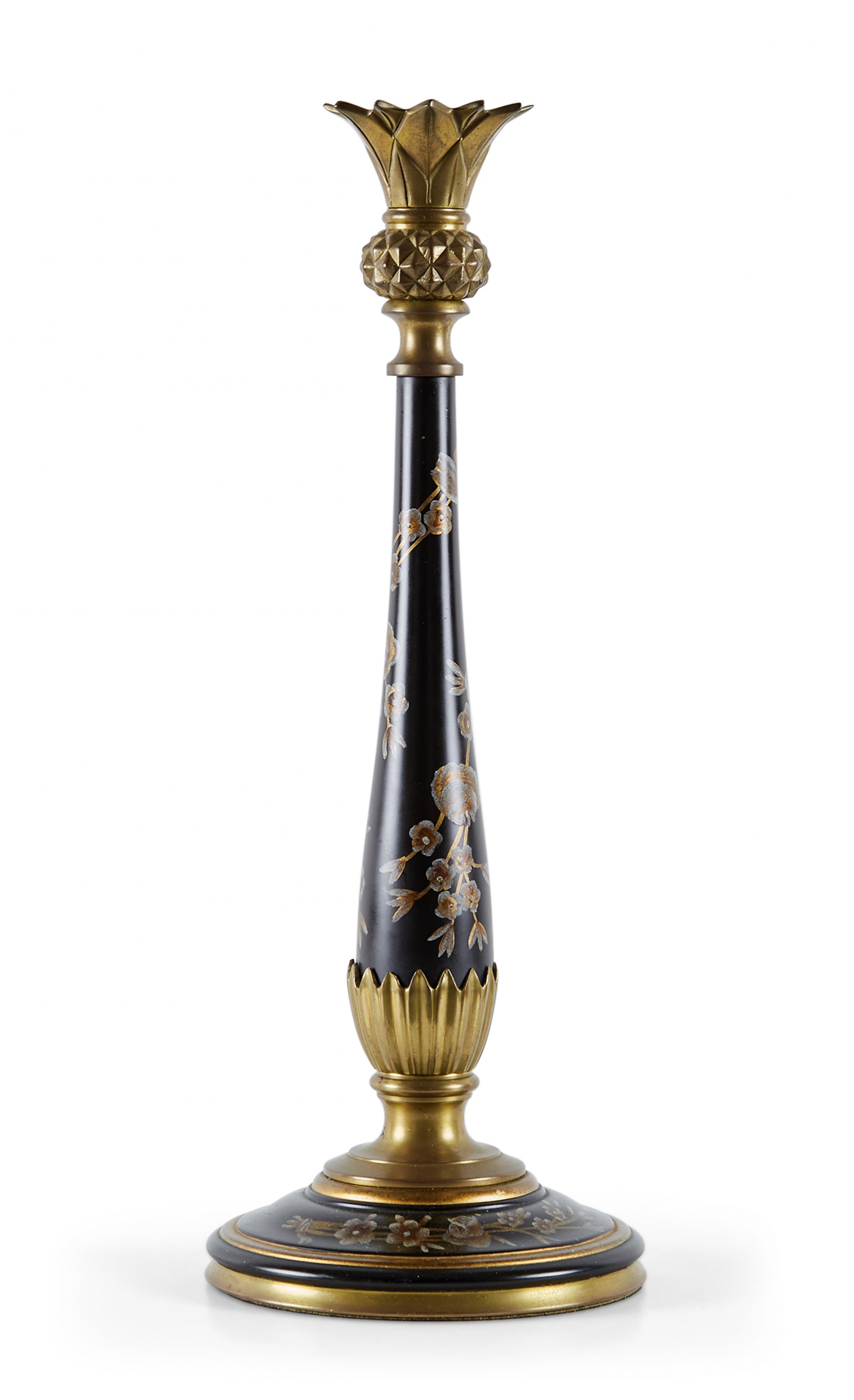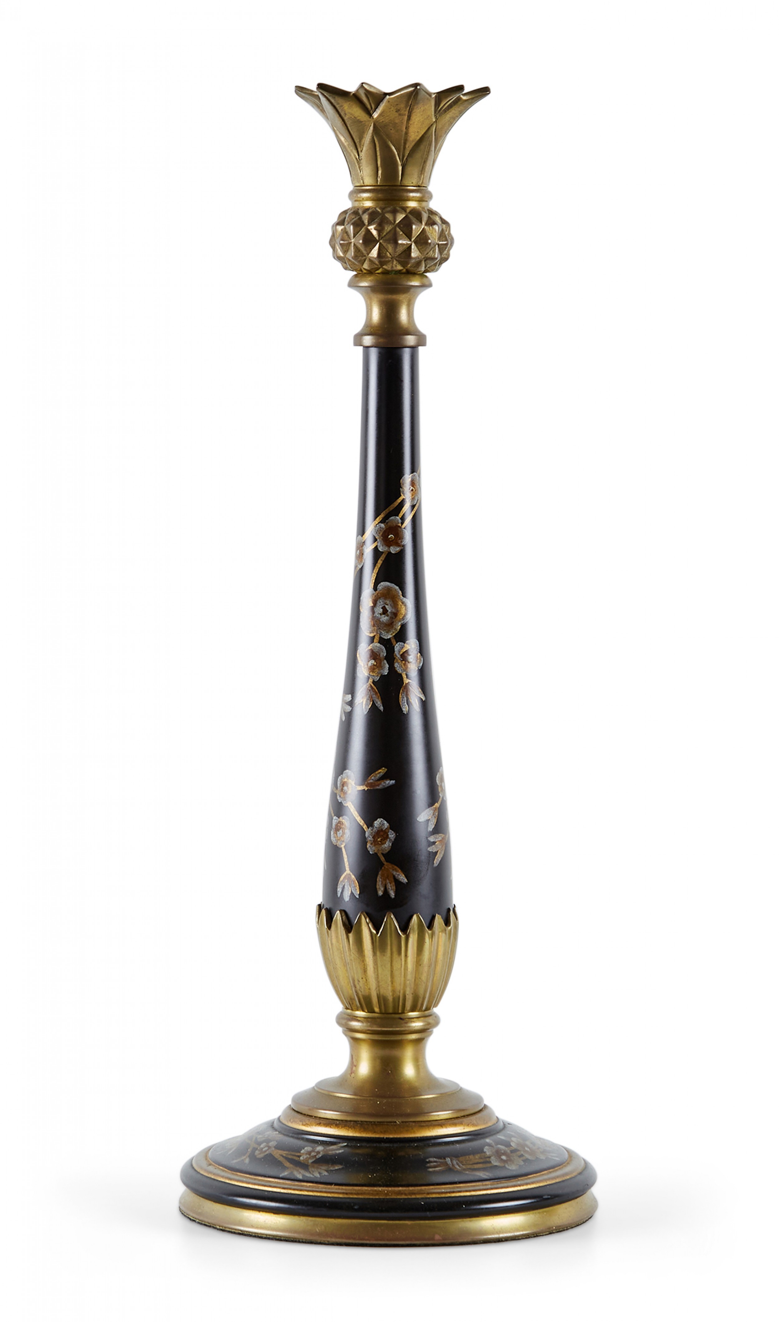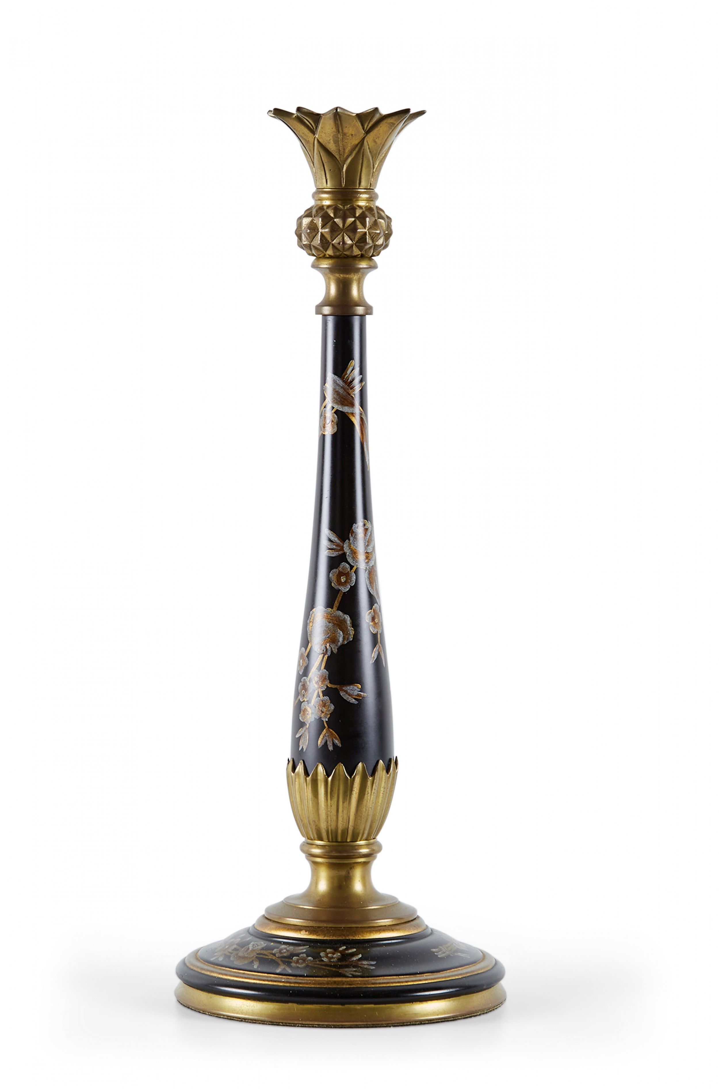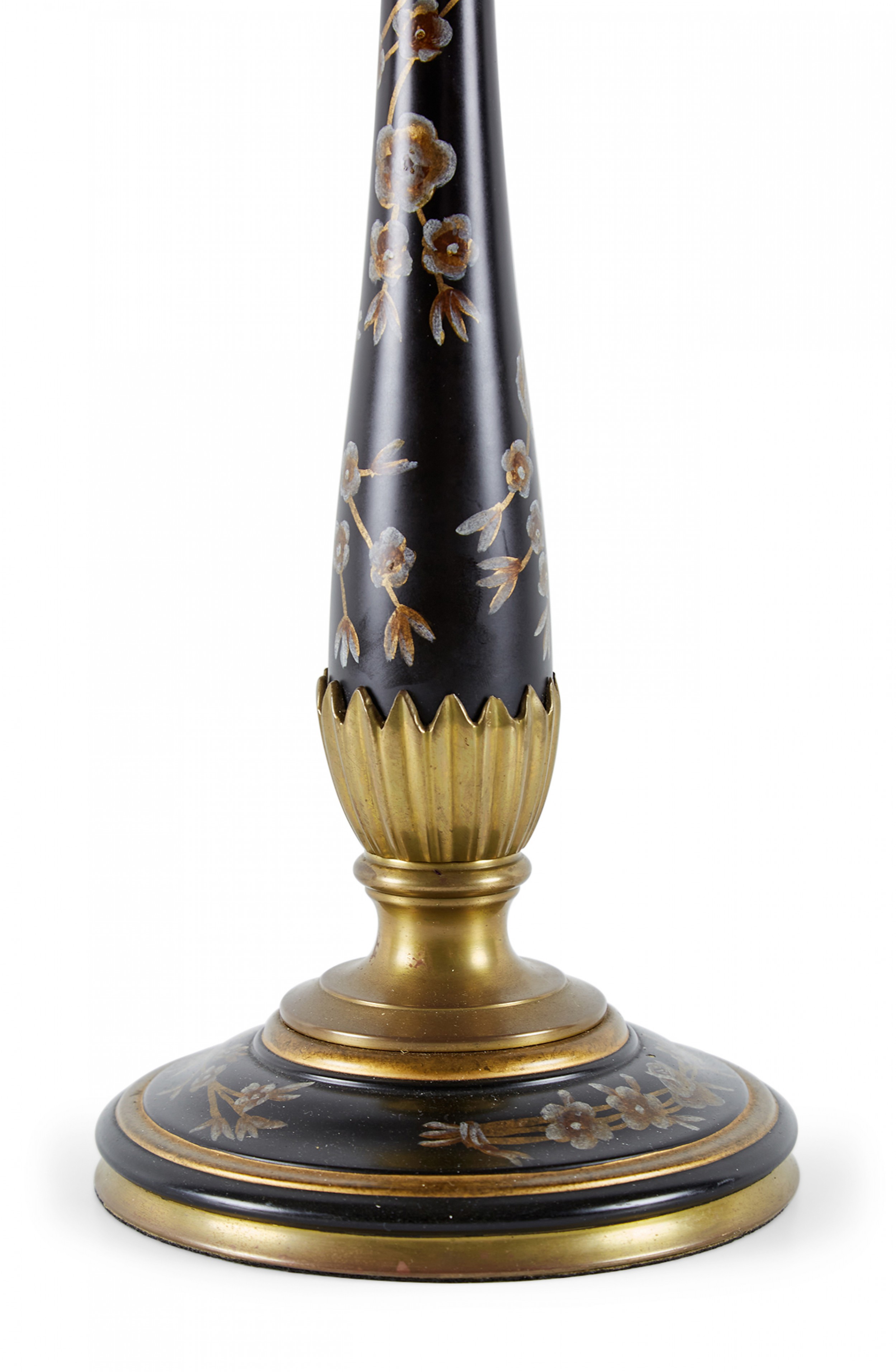 PAIR of French Victorian -style bronze and wood candlesticks with fluted and faceted tops above turned and tapered posts with hand-painted gold and silver florals on a black background above similarly painted stepped wood and brass circular bases (PRICED AS PAIR).
