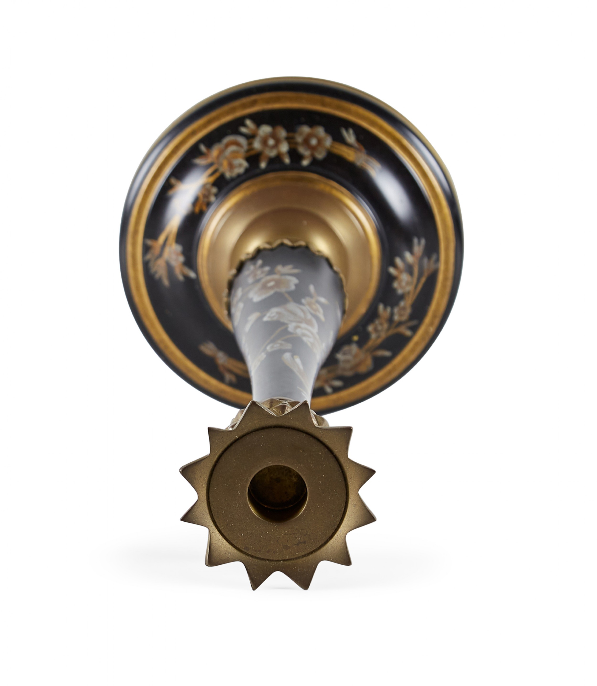 Pair of French Victorian Style Bronze and Hand-Painted Floral Patterned Wood Candlesticks