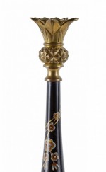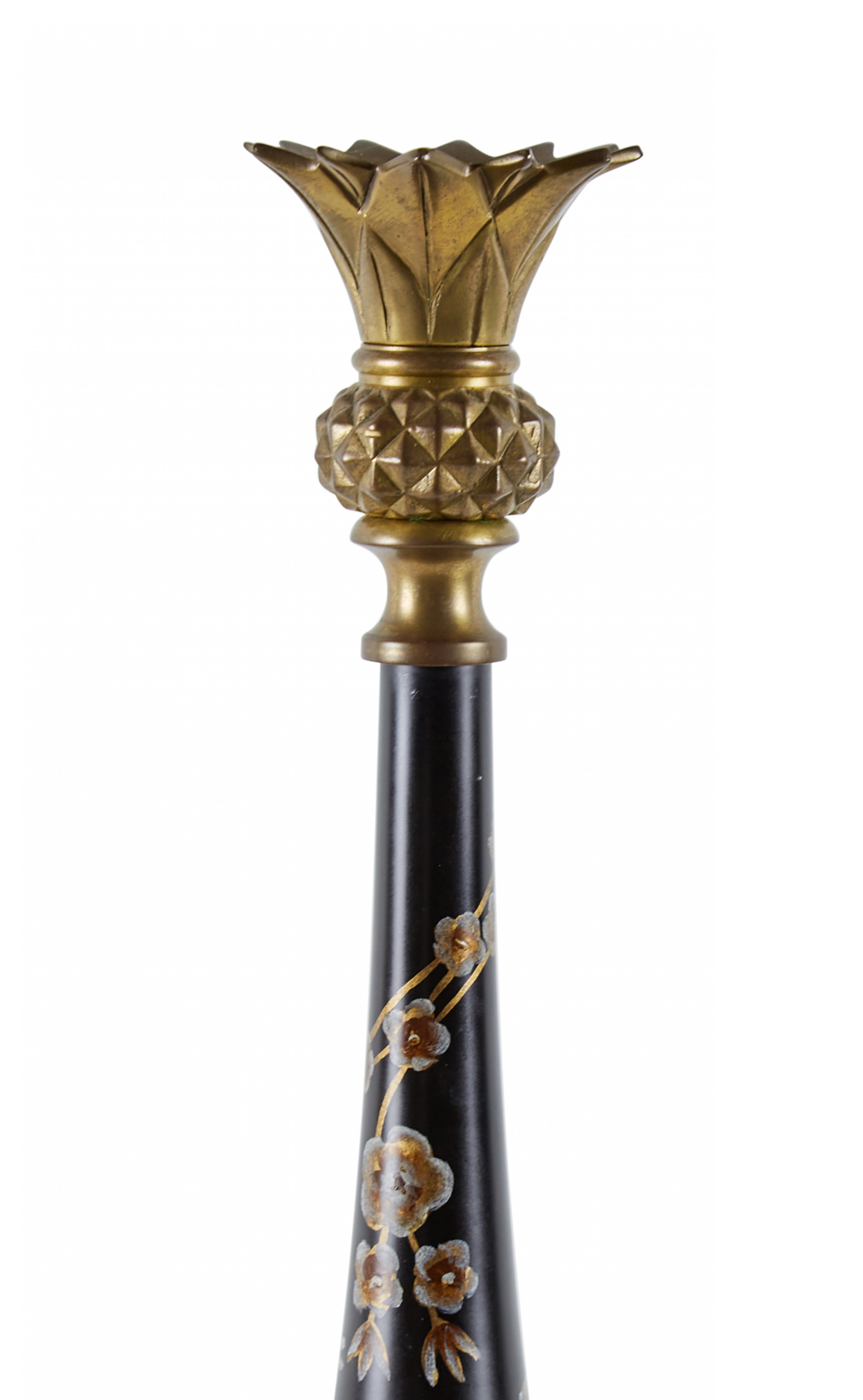 PAIR of French Victorian -style bronze and wood candlesticks with fluted and faceted tops above turned and tapered posts with hand-painted gold and silver florals on a black background above similarly painted stepped wood and brass circular bases (PRICED AS PAIR)