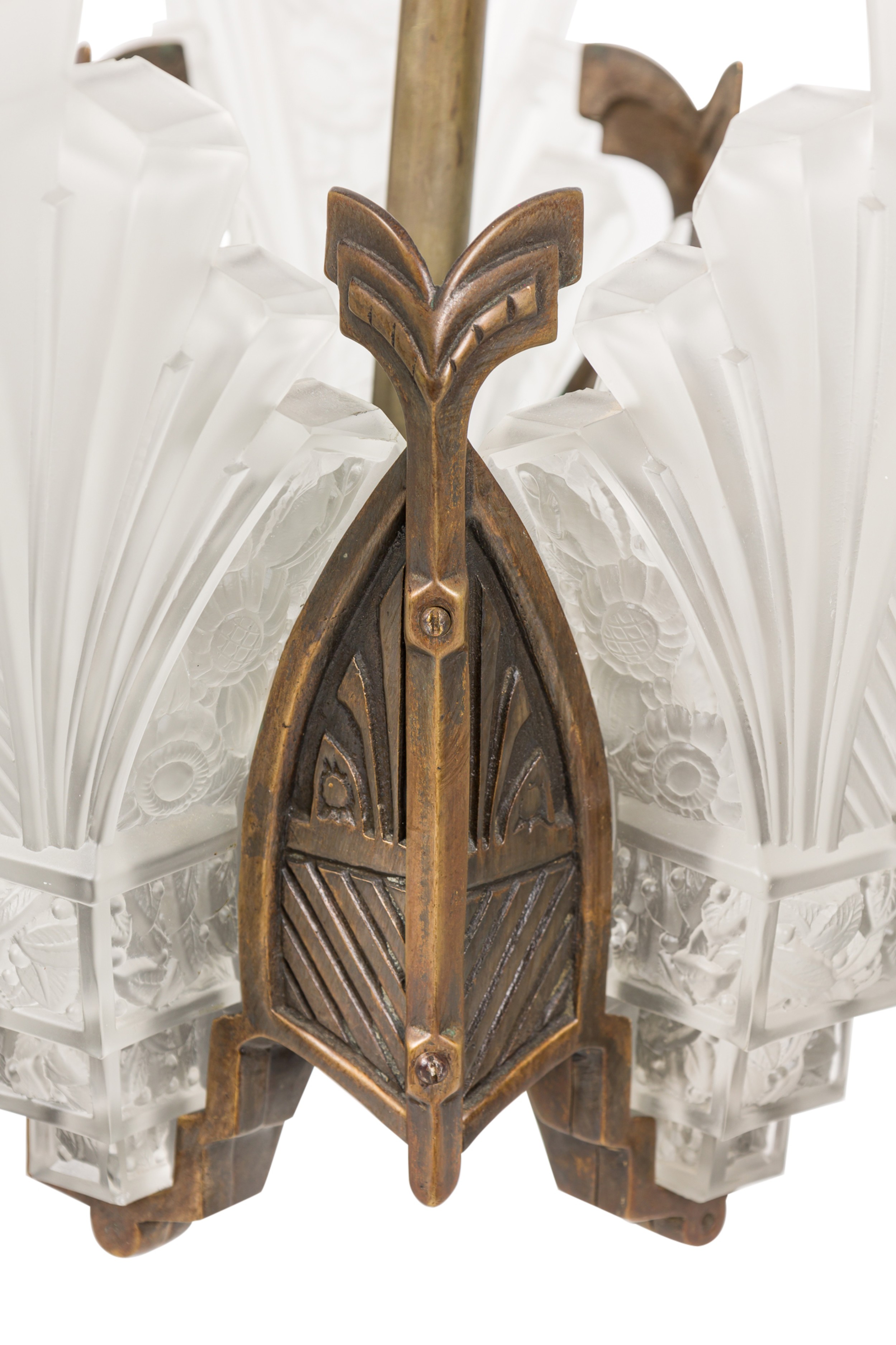 2 French Art Deco metal chandelier with 5 frosted molded glass panels in a geometric shape and floral design and having a beige marble sphere centered on a hanging column (PRICED EACH).