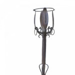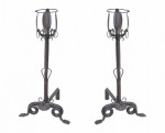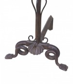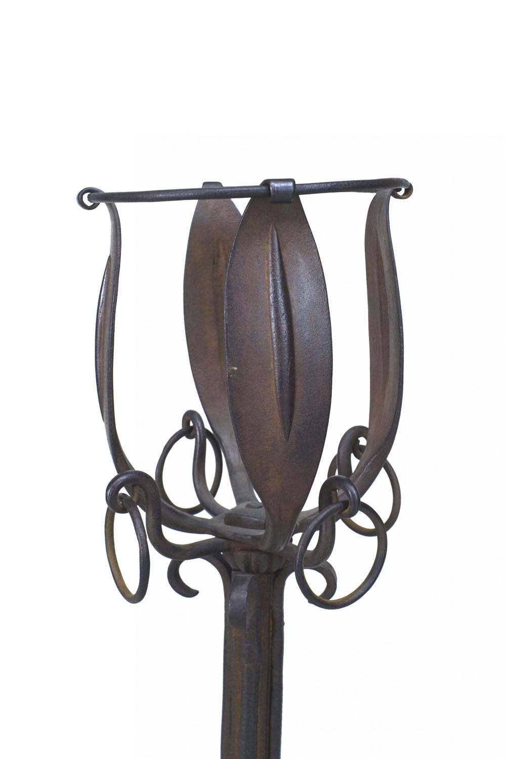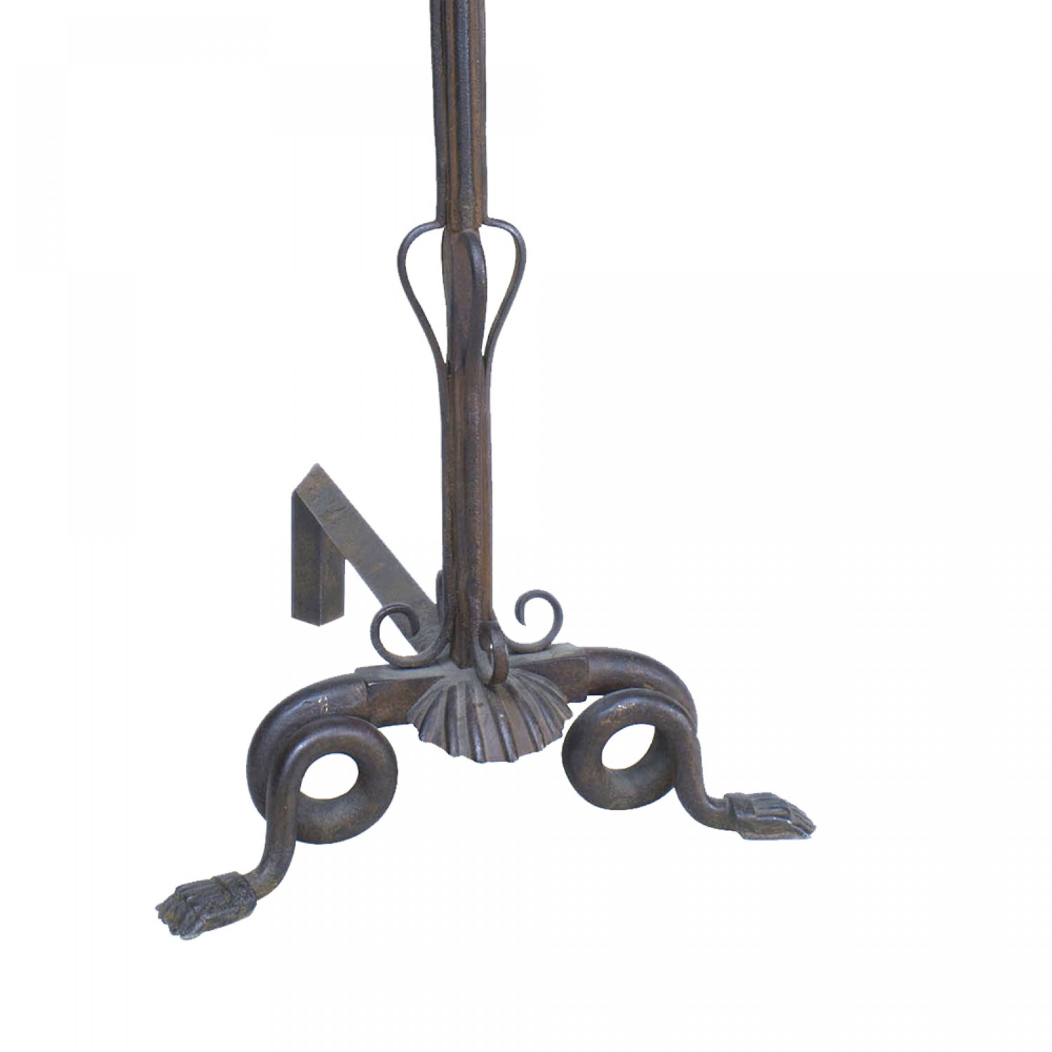 PAIR of French Art Nouveau iron andirons with 2 claw feet centering a shell with a basket form top having 4 rings. (PRICED AS PAIR)