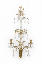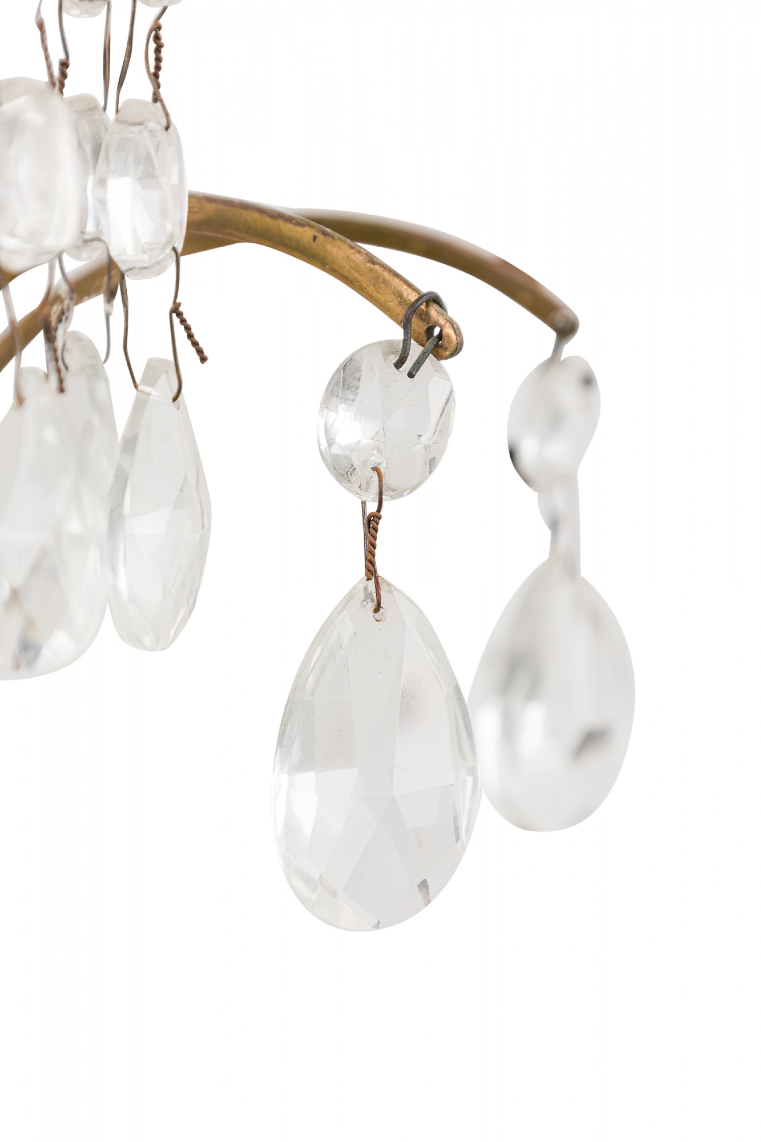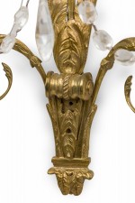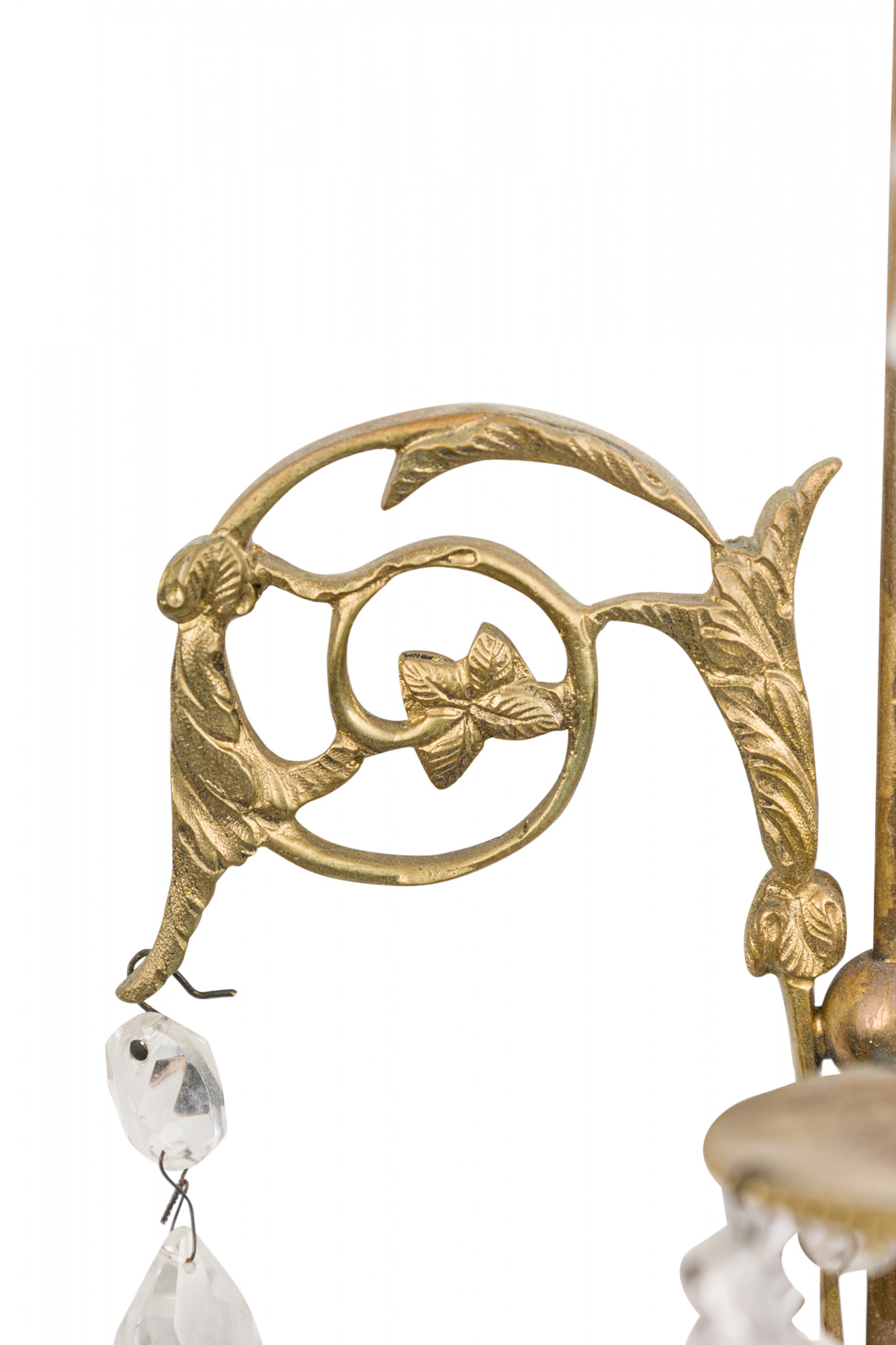 PAIR of French Charles X style (19/20th Century) gilt bronze wall sconces with two candle holder arms a central pyramidal crystal, and dangling faceted teardrop crystals throughout. (PRICED AS PAIR).