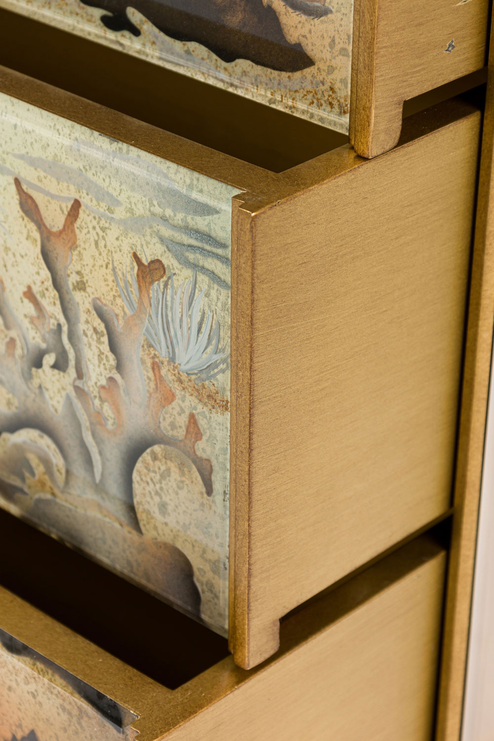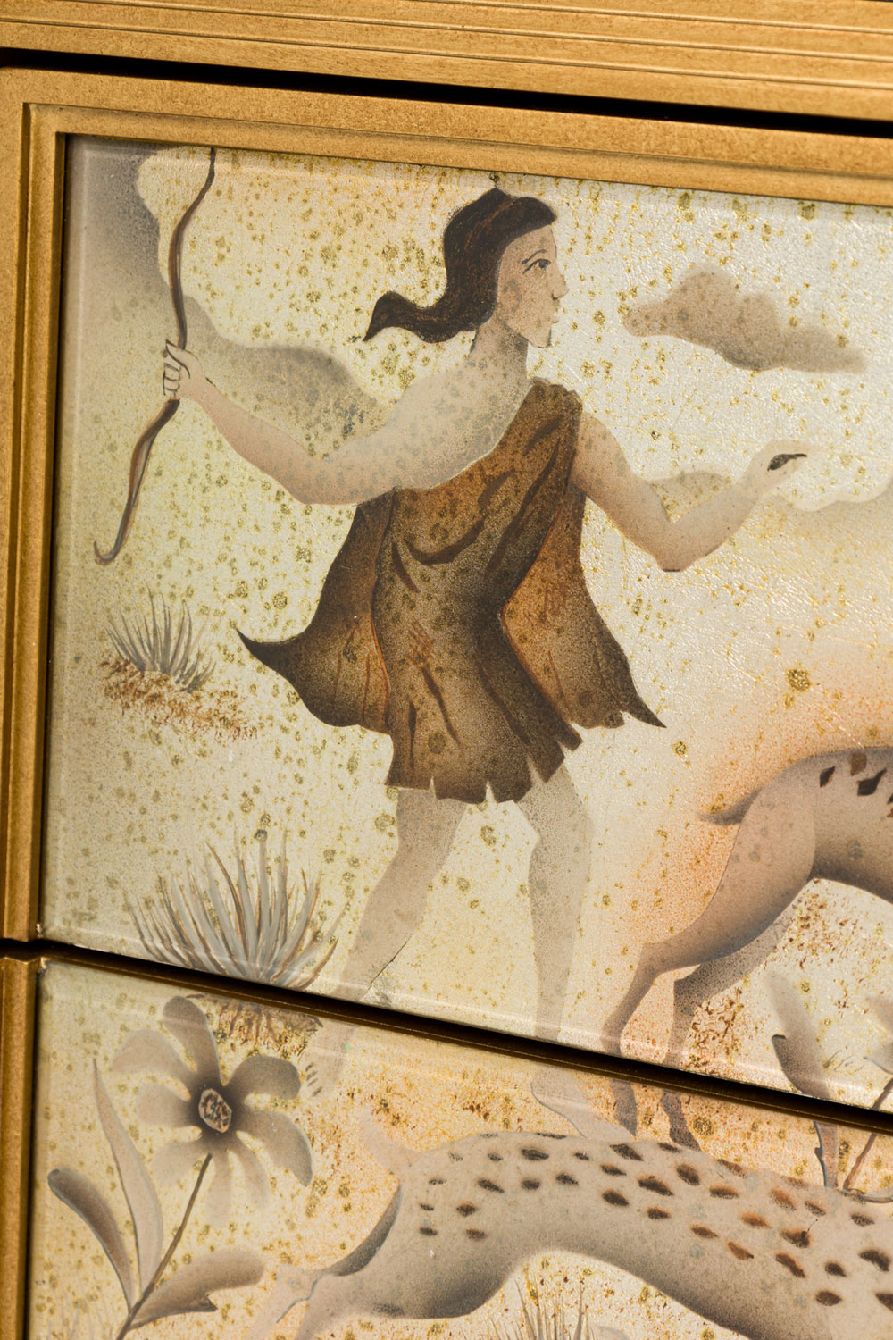 PAIR of French contemporary custom mirrored and gilt wood commodes / chests with mirrored sides and legs with back painted eglomise decorated front 3 drawers with a depiction of Poseidon and Diana (PRICED AS PAIR) (Jean De Merry)
