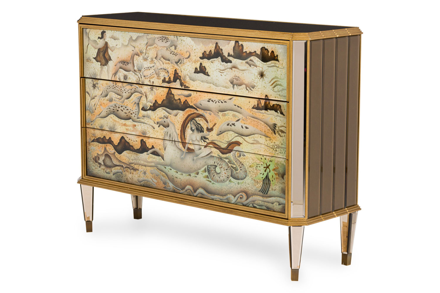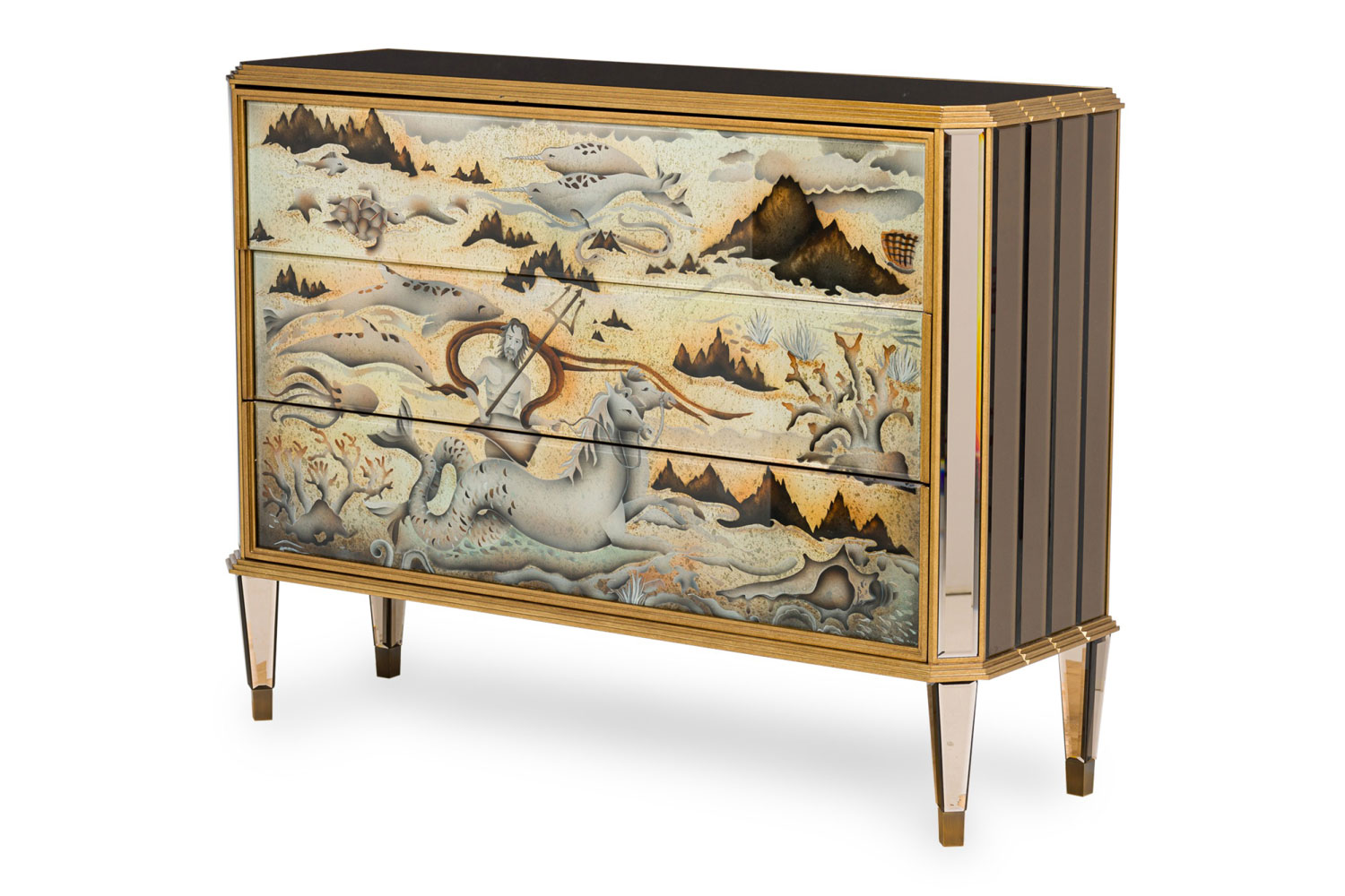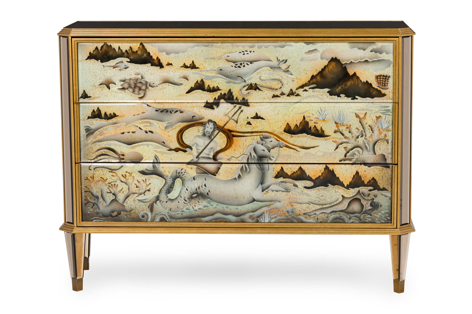 PAIR of French contemporary custom mirrored and gilt wood commodes / chests with mirrored sides and legs with back painted eglomise decorated front 3 drawers with a depiction of Poseidon and Diana (PRICED AS PAIR) (Jean De Merry).