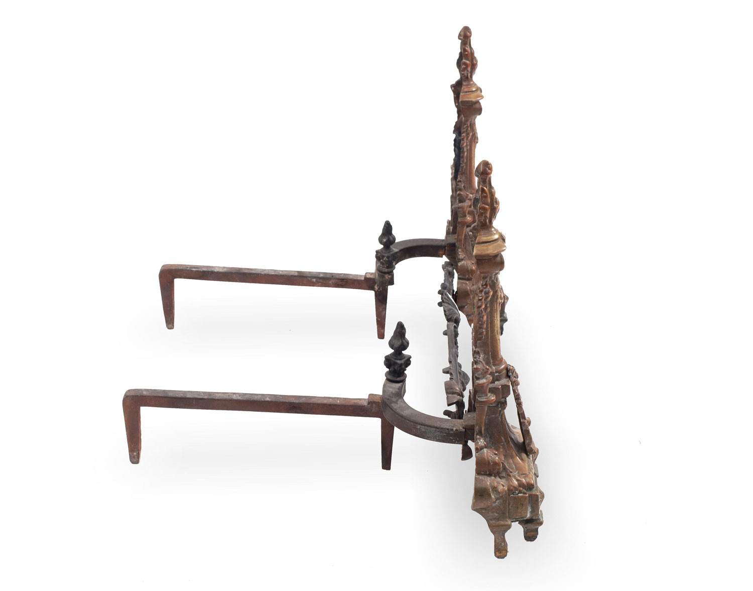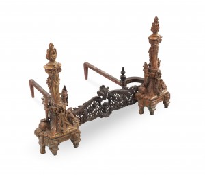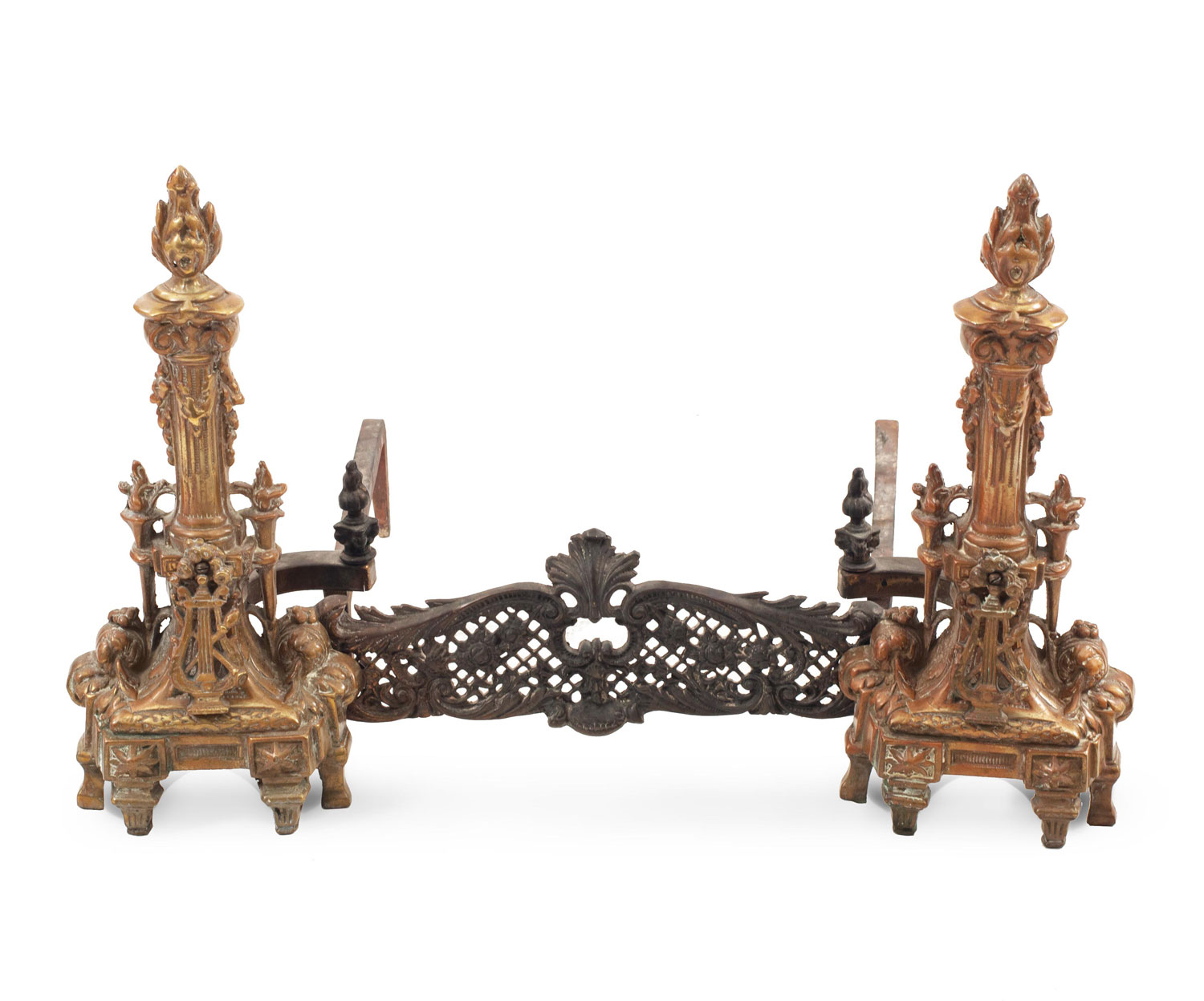 PAIR of French Directoire-style bronze andirons with filigree connector (PRICED AS PAIR)