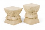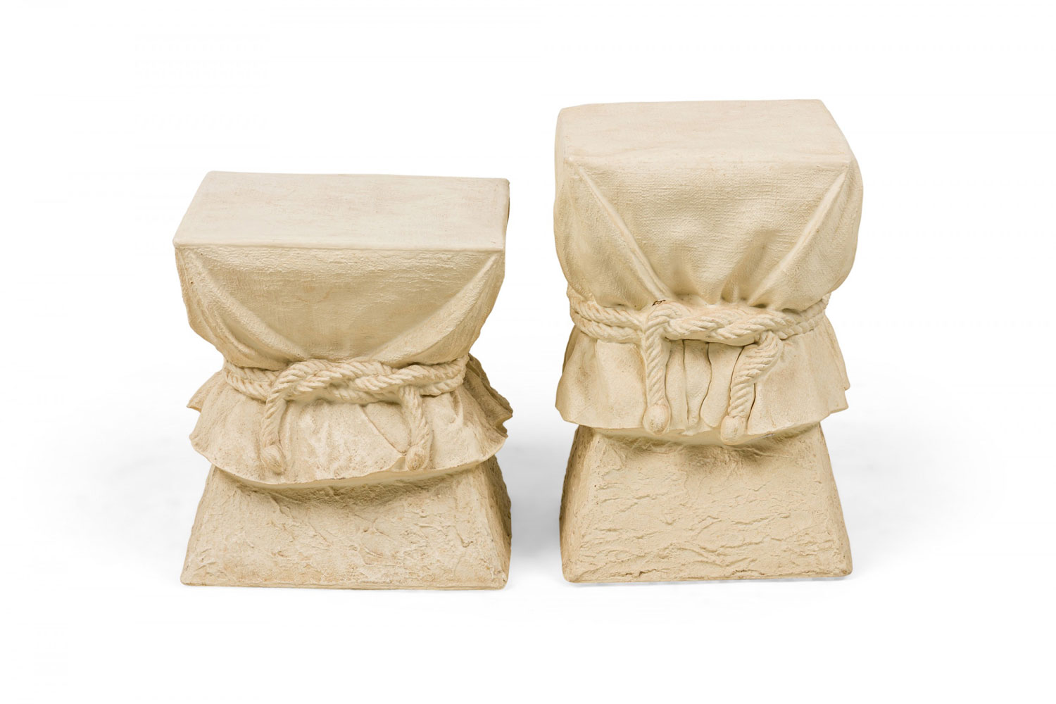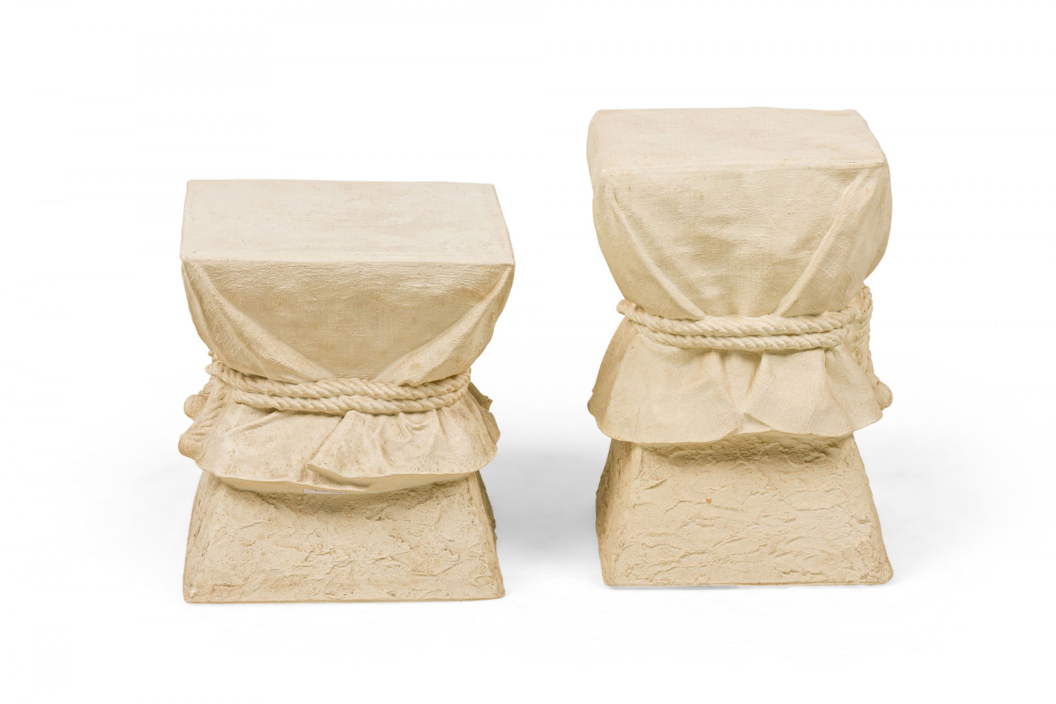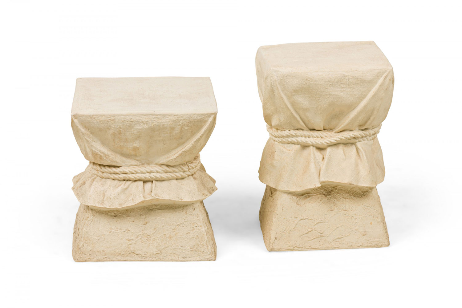 PAIR of Contemporary French (circa 1980) similar inverted pyramid form drapery and rope occasional pedestal tables made of white gesso and resin-infused burlap and jute over wood forms (manner of ALBERTO PINTO)