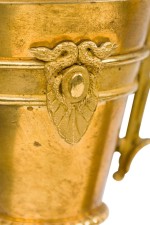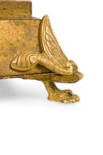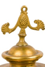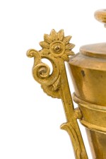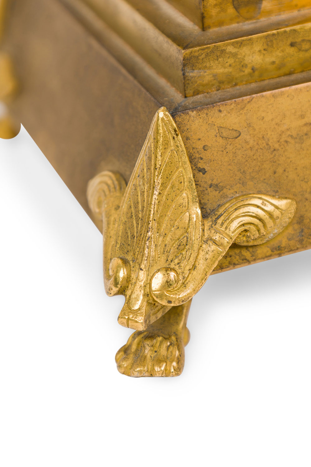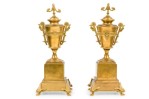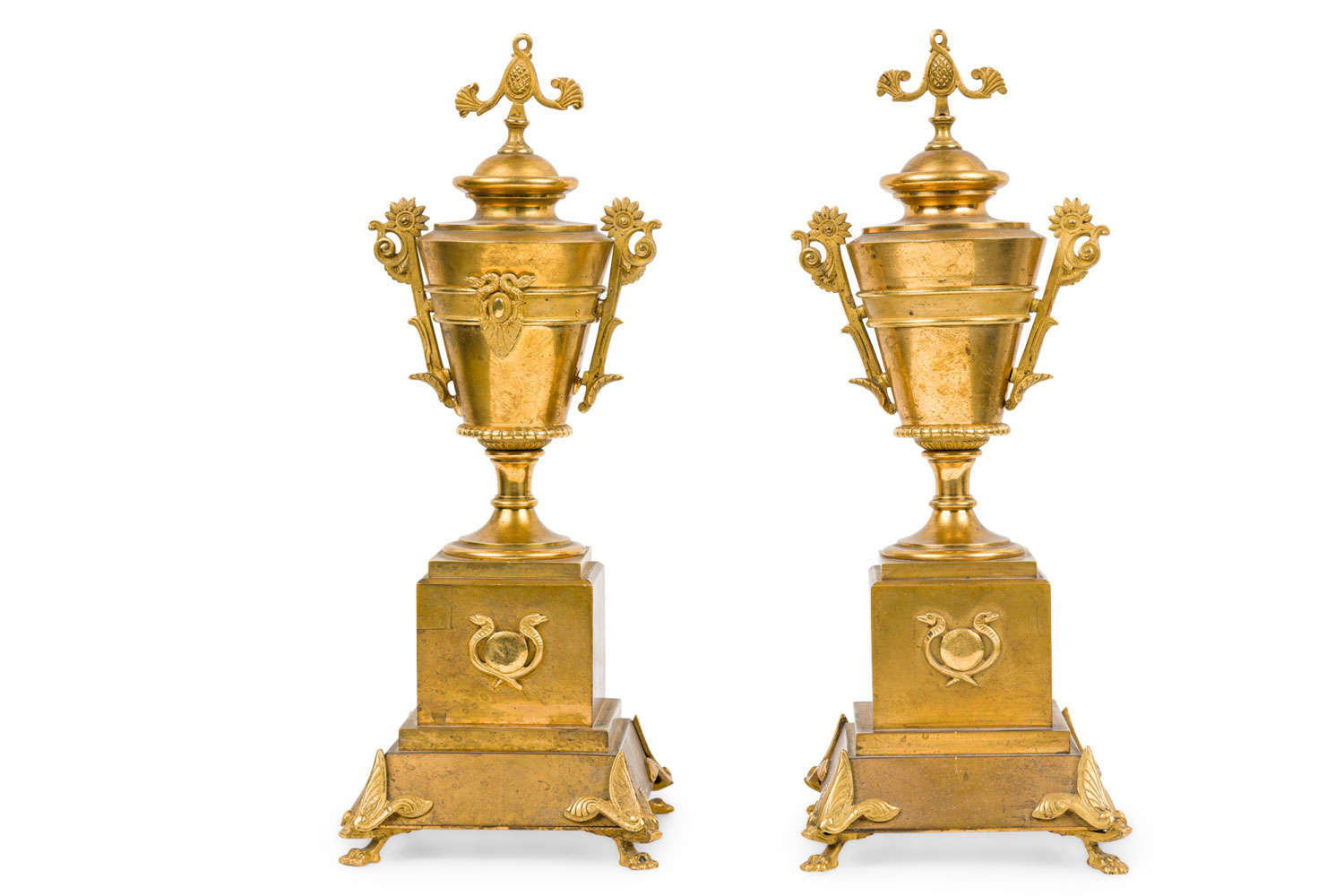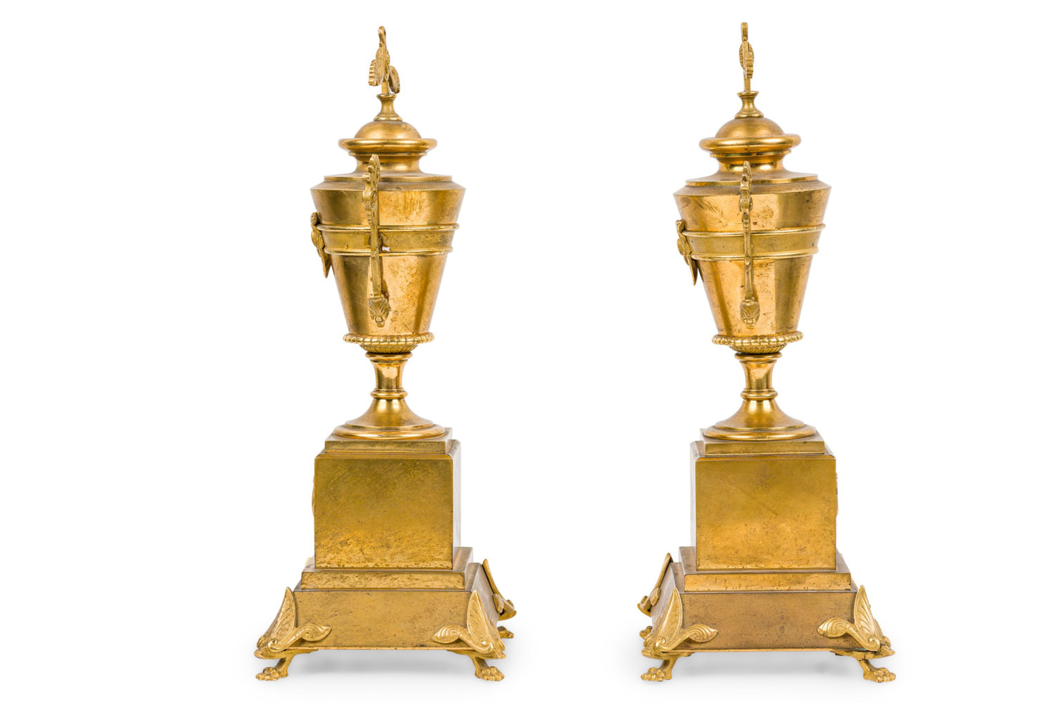 PAIR of French Empire style (19th Cent) gilt bronze urns with finial top and handles with claw feet on square base (matching clock: Inv. #032441) (PRICED AS PAIR).