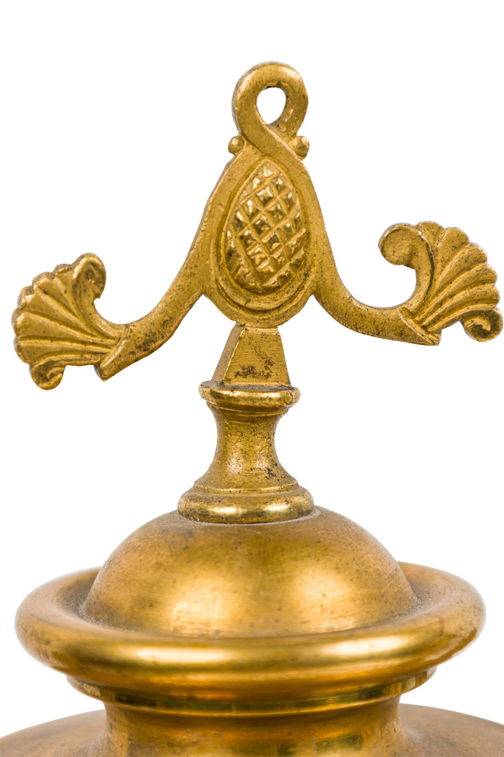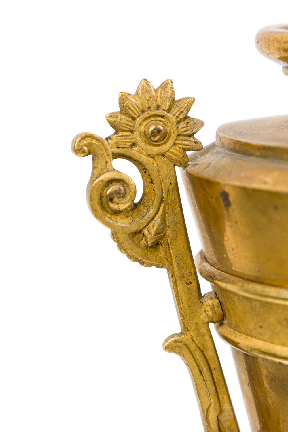 PAIR of French Empire style (19th Cent) gilt bronze urns with finial top and handles with claw feet on square base (matching clock: Inv. #032441) (PRICED AS PAIR)
