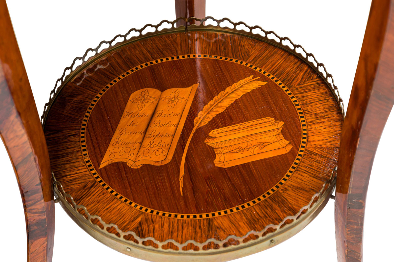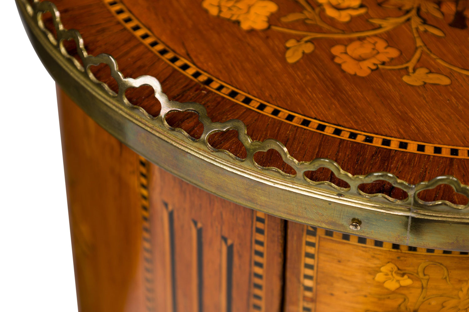 PAIR of French Louis XV style (19th Century) round 3-drawer bedside / end tables with 3 cabriole legs connected with a platform stretcher having illustrative inlay designs through out with brass escutcheons ending in sabre legs with brass sabots (PRICED AS PAIR)