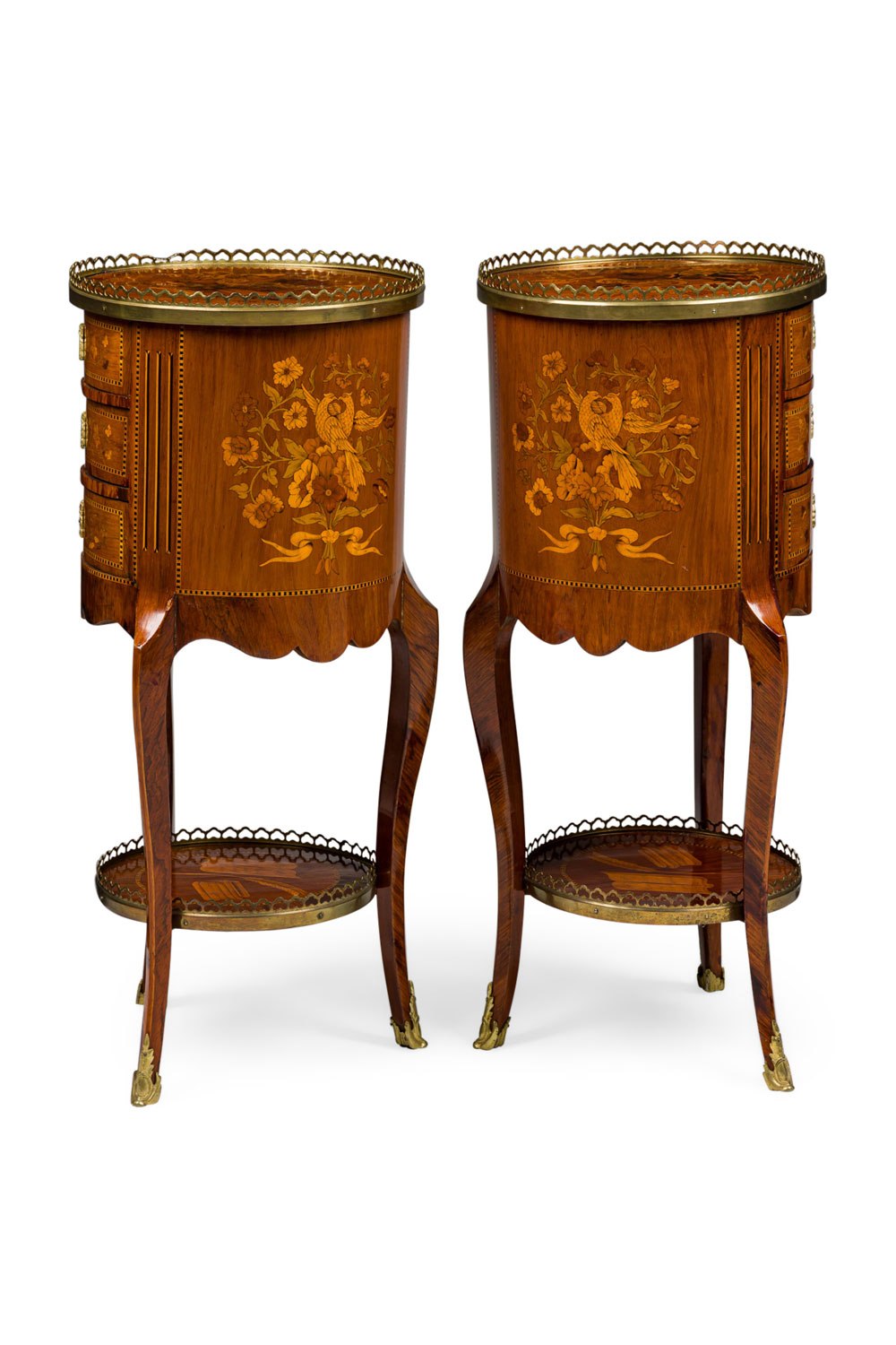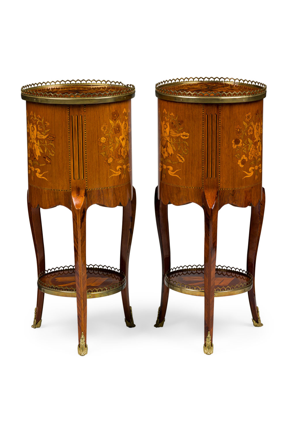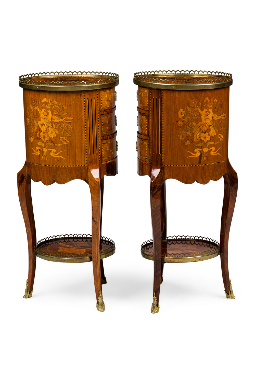 PAIR of French Louis XV style (19th Century) round 3-drawer bedside / end tables with 3 cabriole legs connected with a platform stretcher having illustrative inlay designs through out with brass escutcheons ending in sabre legs with brass sabots (PRICED AS PAIR).
