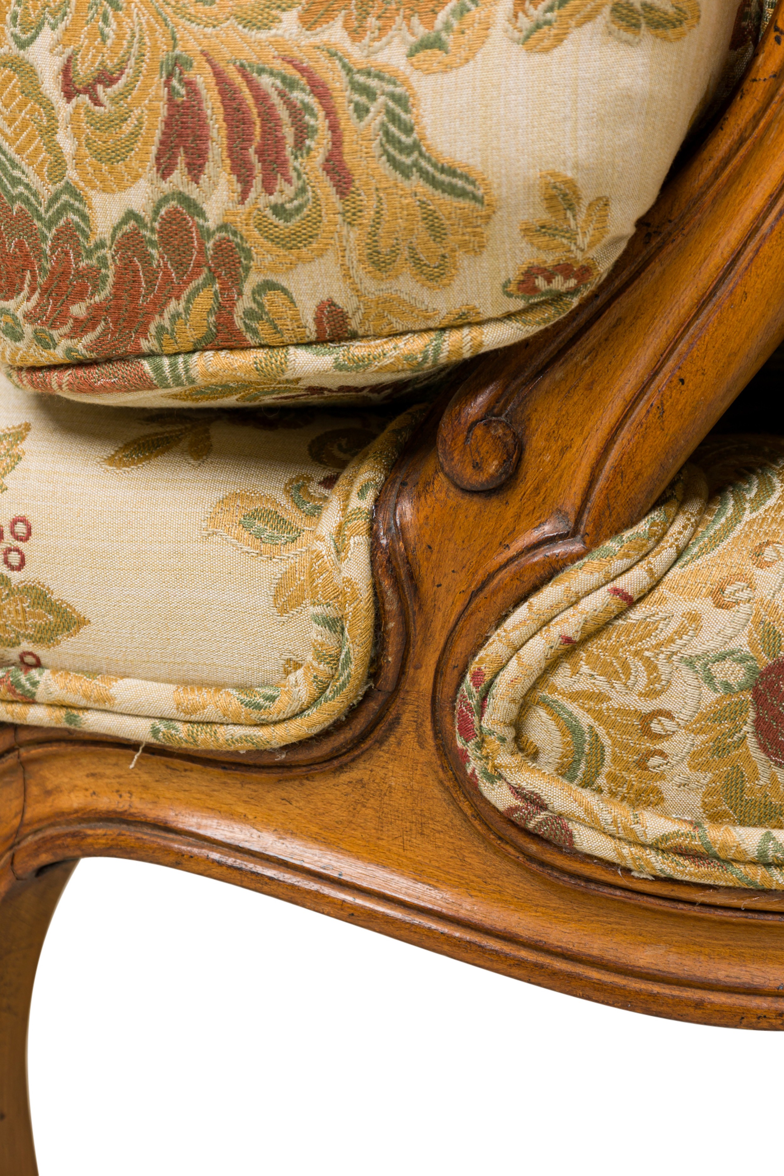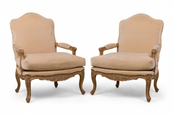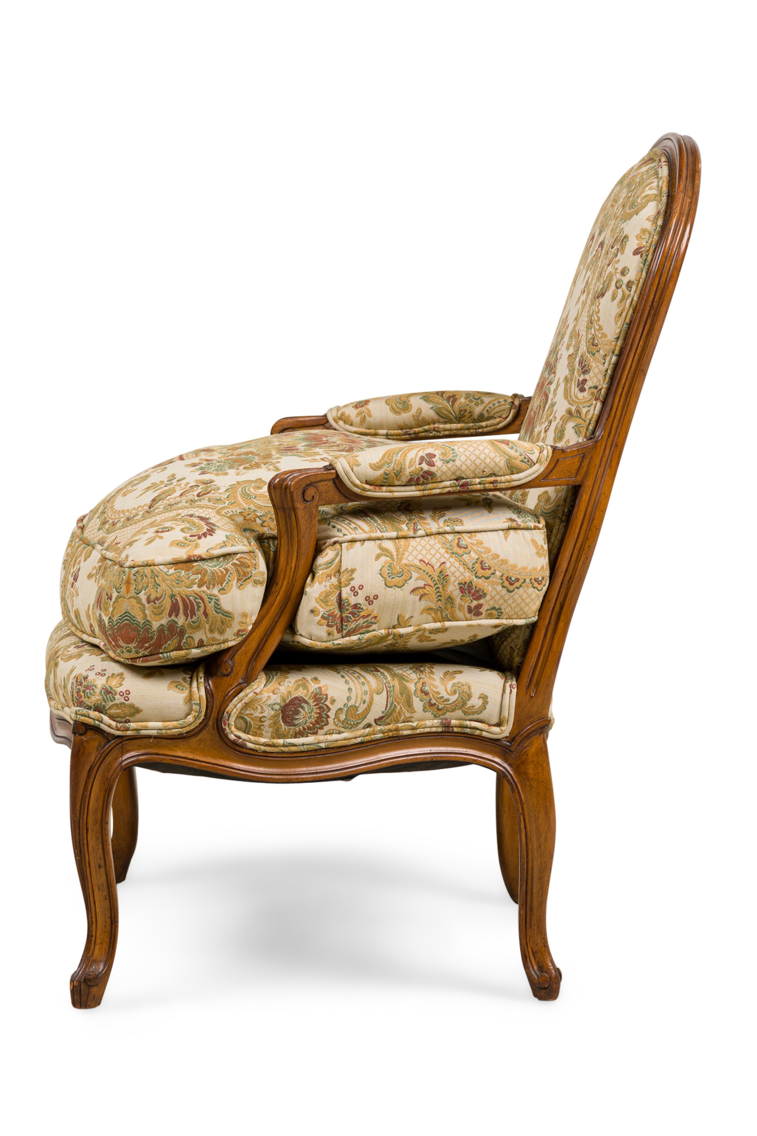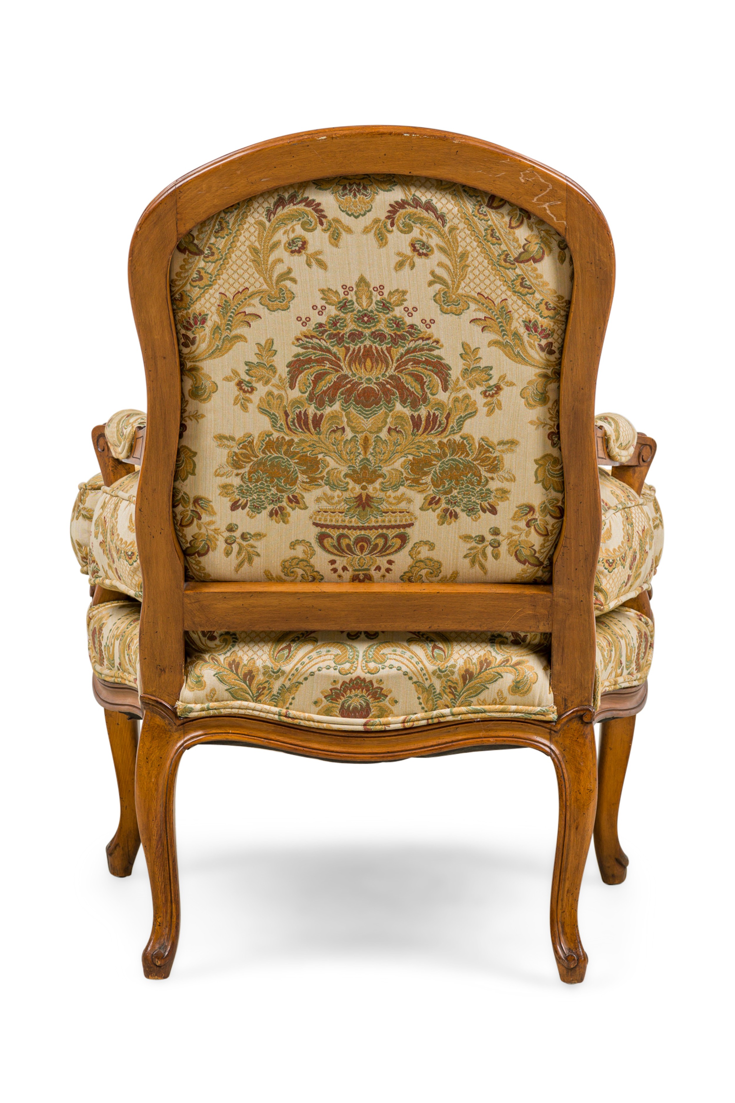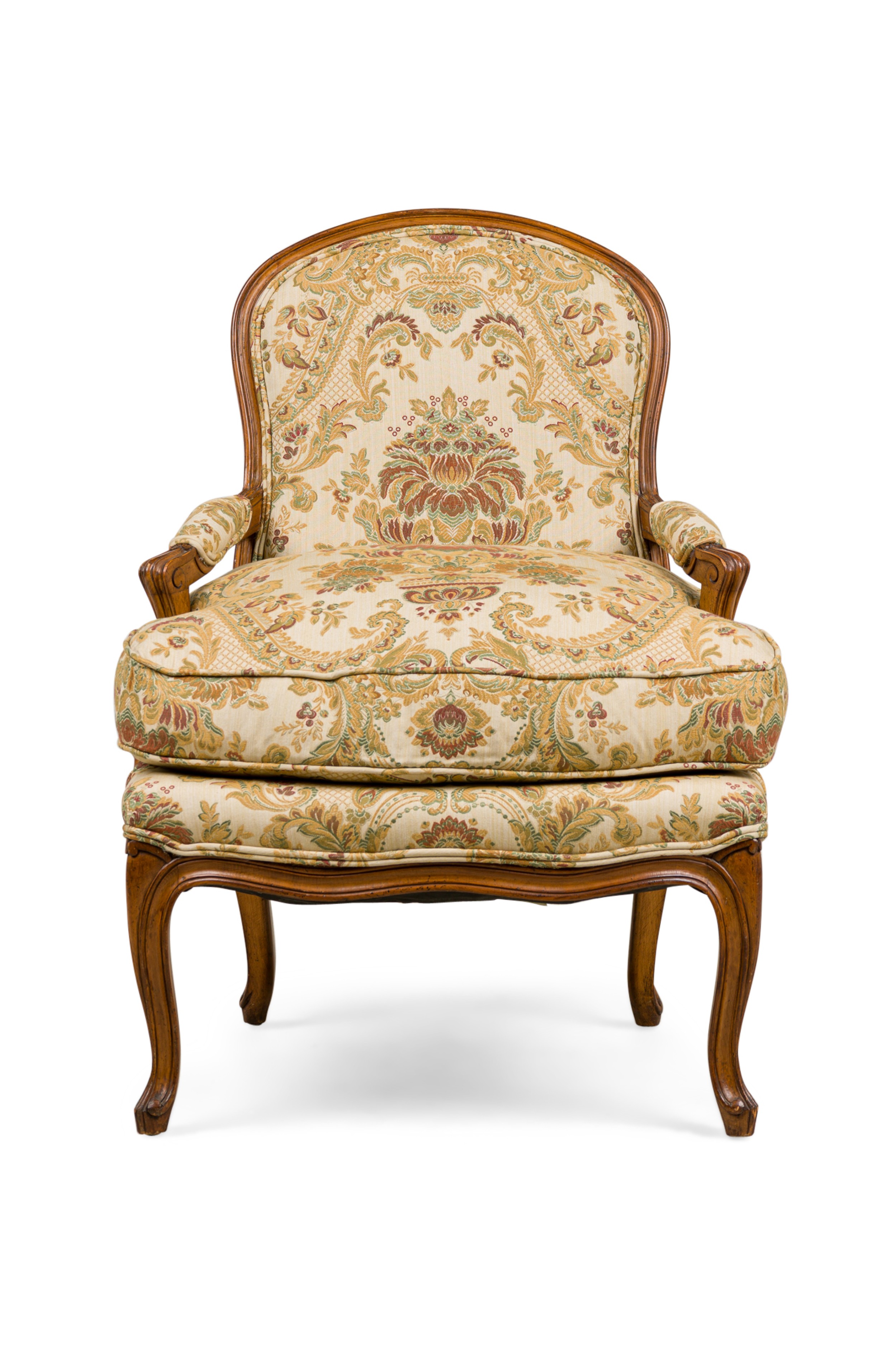 PAIR of French Louis XV style (20th Century) beige floral armchairs having a round back with a seat cushion (PRICED AS PAIR).