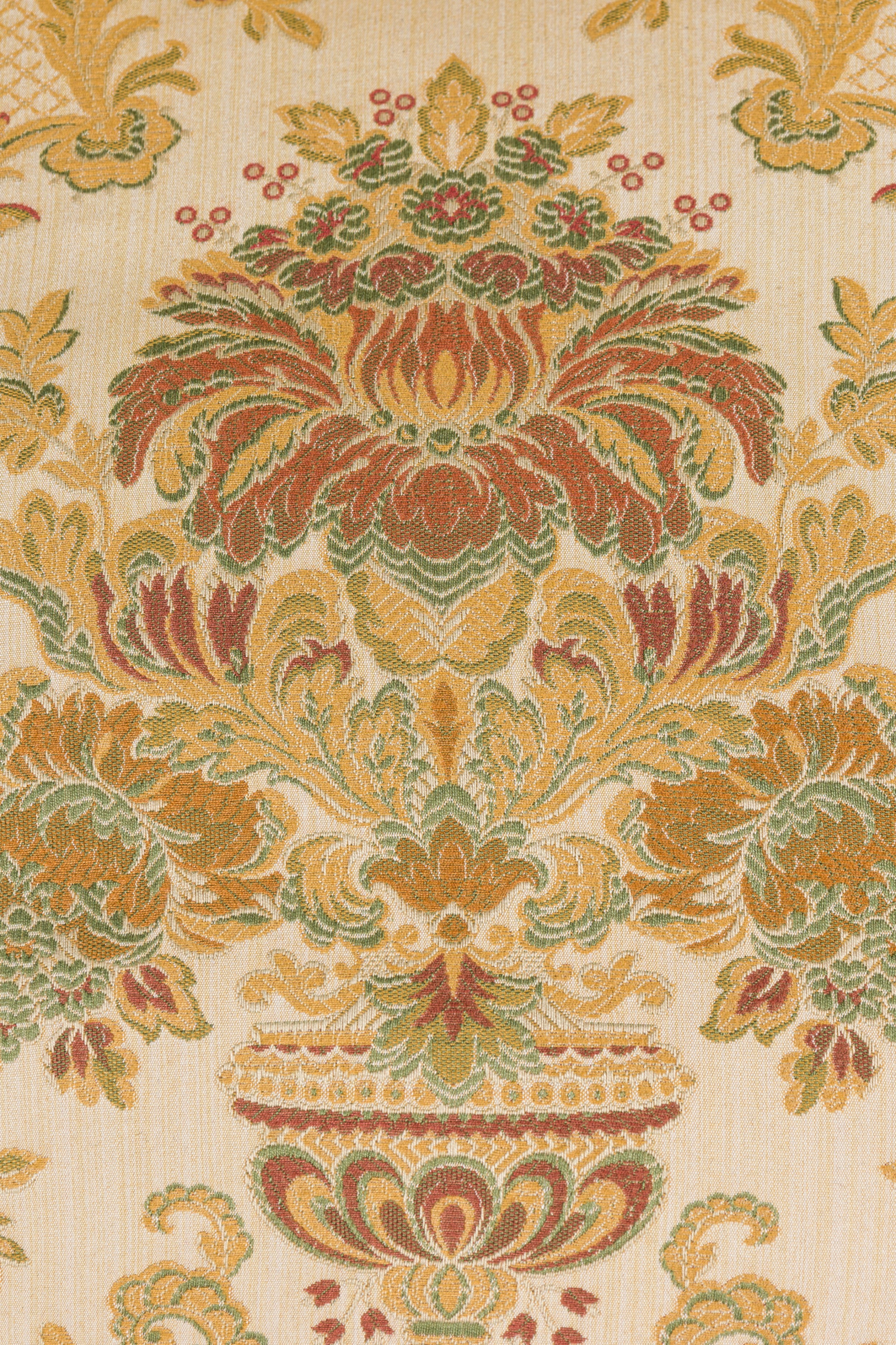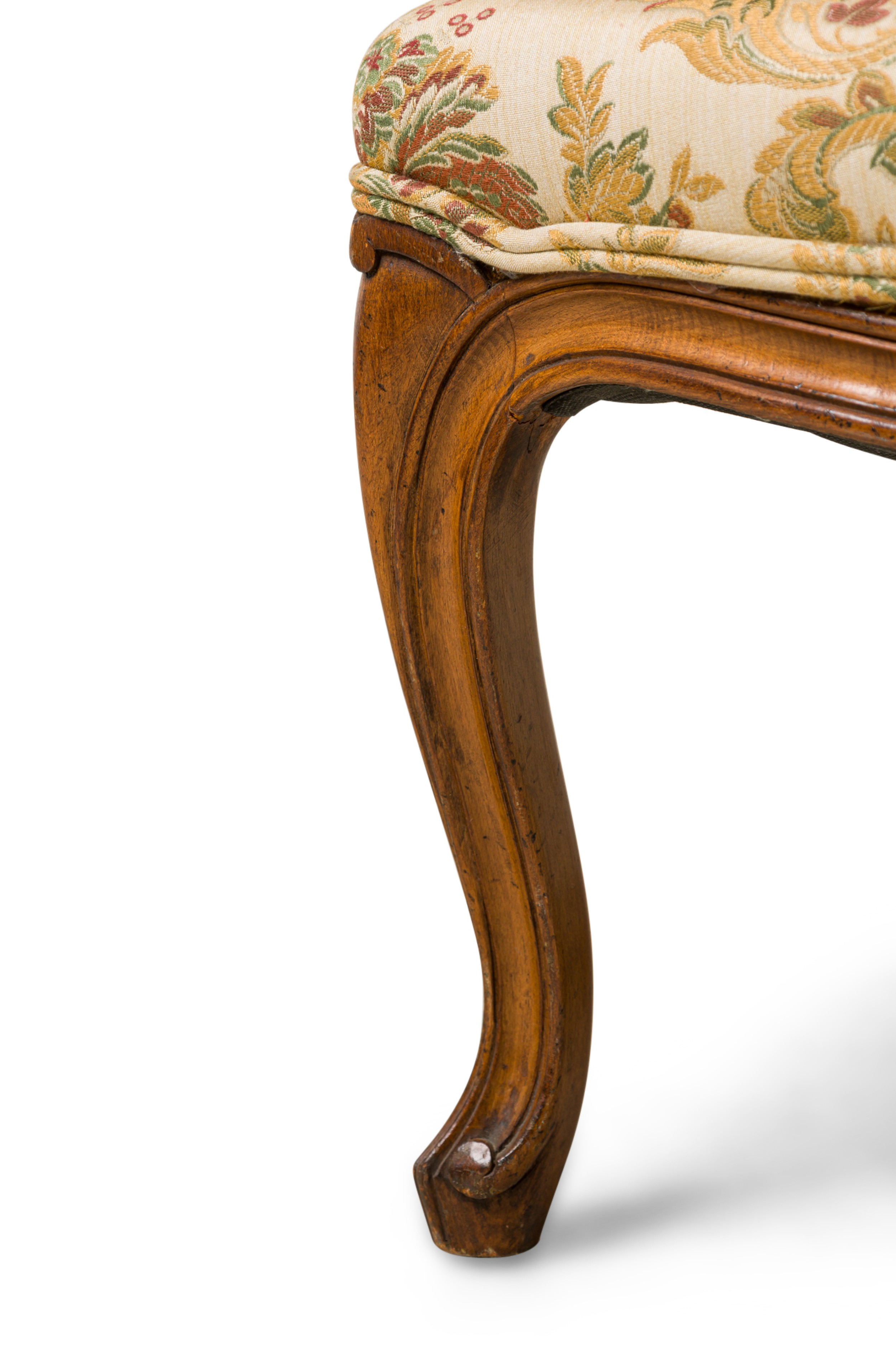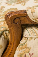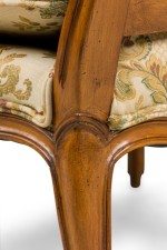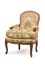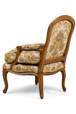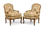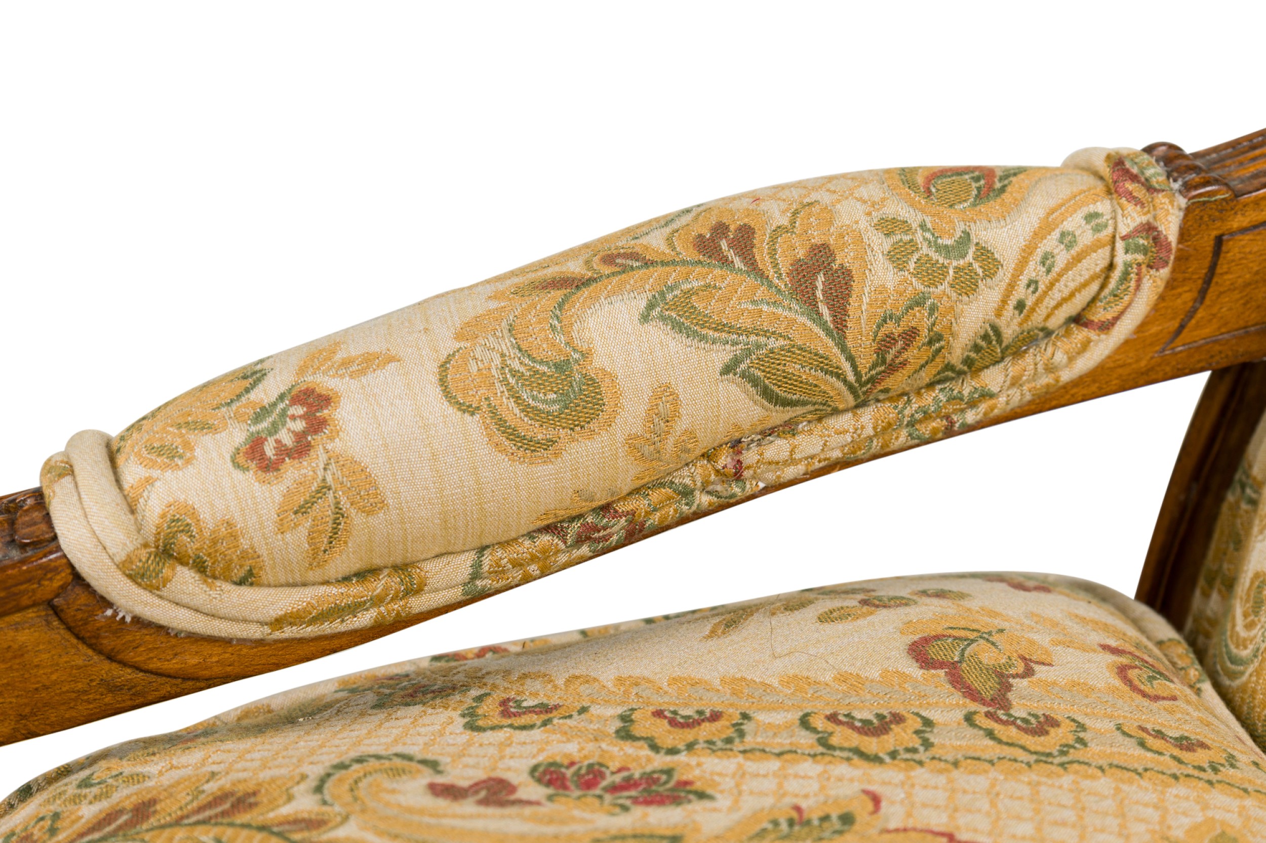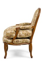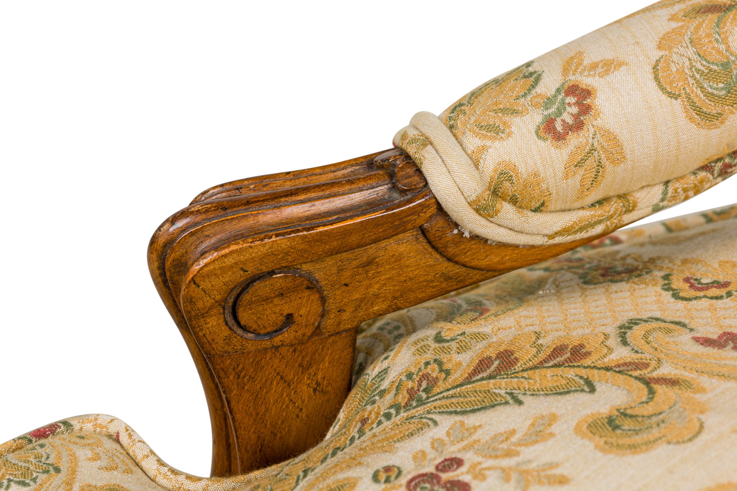 PAIR of French Louis XV style (20th Century) beige floral armchairs having a round back with a seat cushion (PRICED AS PAIR).