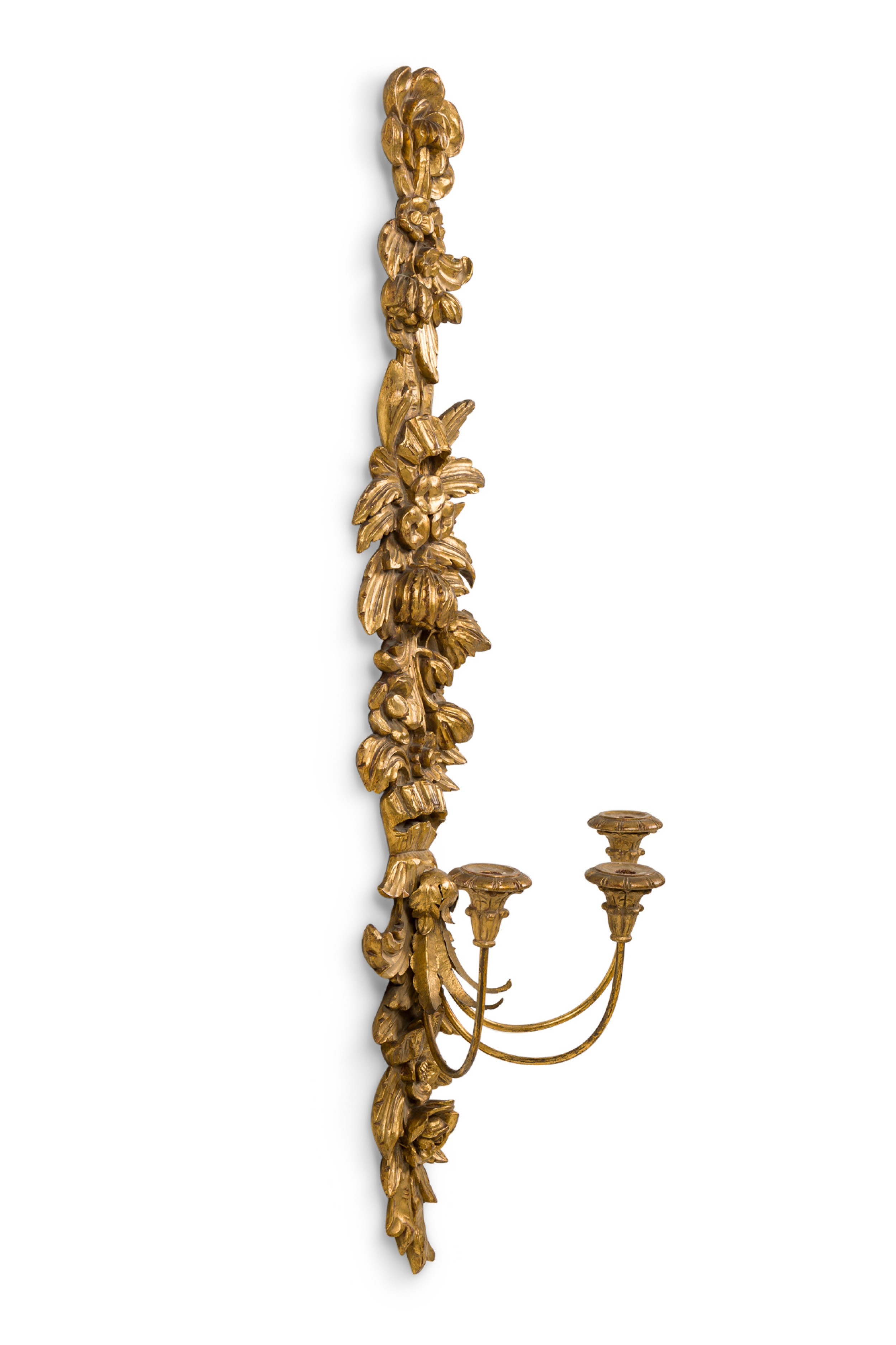 PAIR of French Louis XV style (19/20th Century) giltwood floral carved narrow wall sconce with 3 candle holders (PRICED AS PAIR)