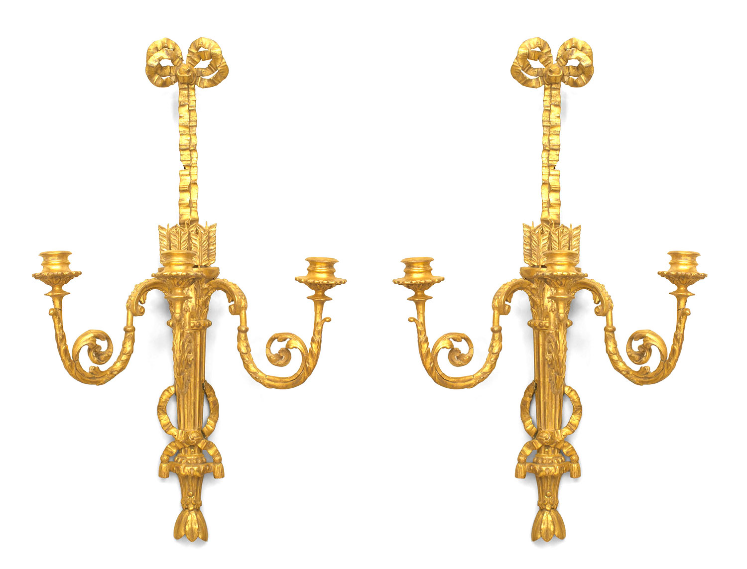 PAIR of French Louis XVI (circa 1785) gilt wood three scroll arm wall sconces with a bow knot top and a design with arrows in a quiver. (PRICED AS PAIR)