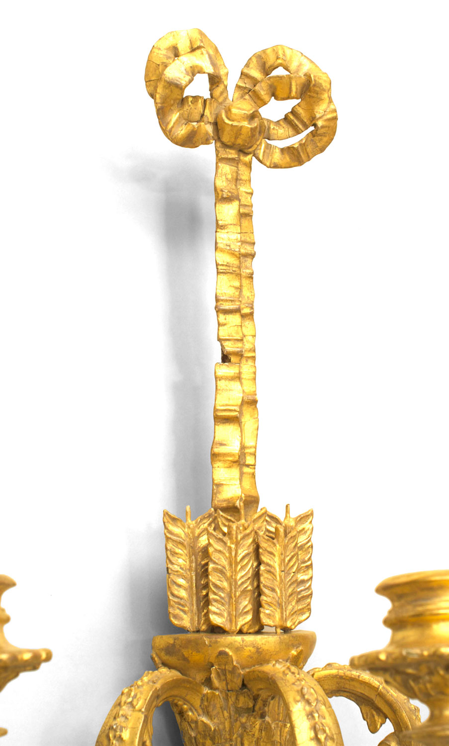PAIR of French Louis XVI (circa 1785) gilt wood three scroll arm wall sconces with a bow knot top and a design with arrows in a quiver. (PRICED AS PAIR).