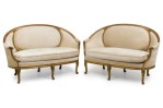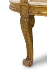 PAIR of French Louis XVI (18th Century) canapes / settees with a curved and carved giltwood frame with a circular panel in the backrest, which curves forward to create the settee's arms, upholstered in a beige ribbed velvet, and resting on five carved cabriole legs with acanthus leaf decorations (PRICED AS PAIR).