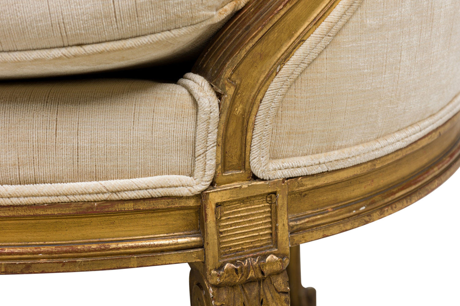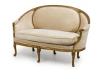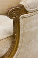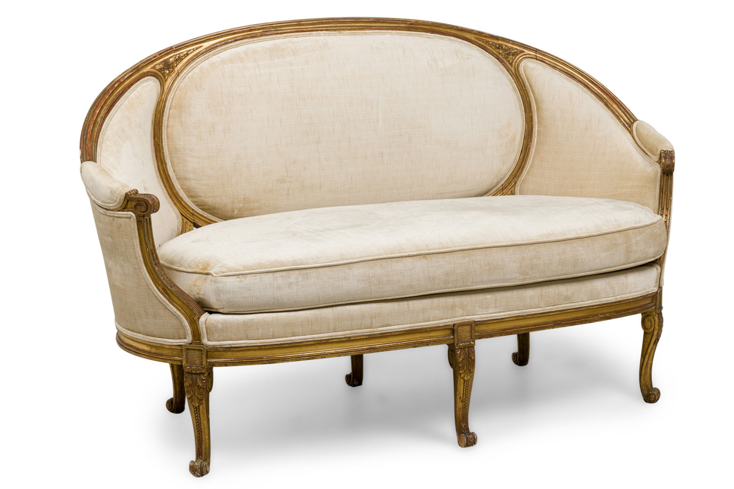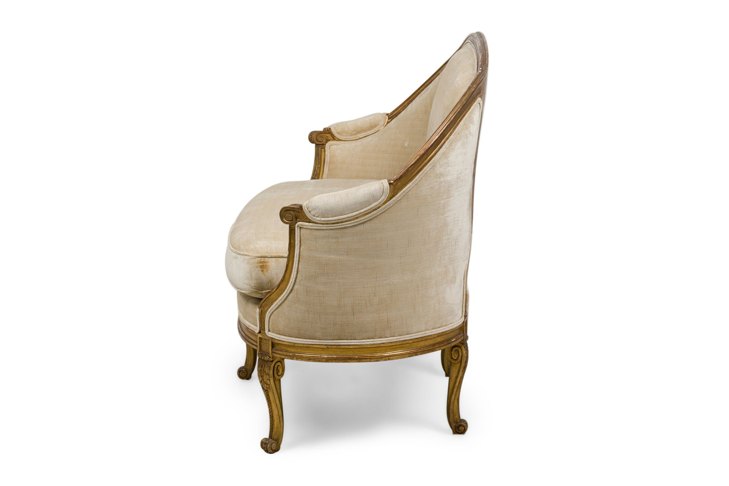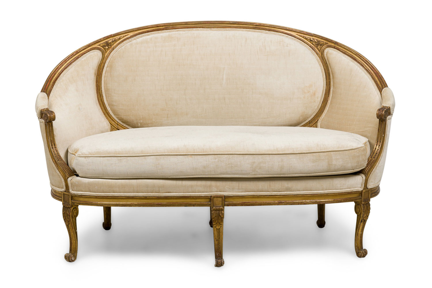 Style: French Materials & Techniques: Fabric, gilt / giltwood, upholstered, wood Category: Seating Condition: Some wear and losses to gilt finish, minor wear and staining to upholstery. Good; Wear consistent with age and use