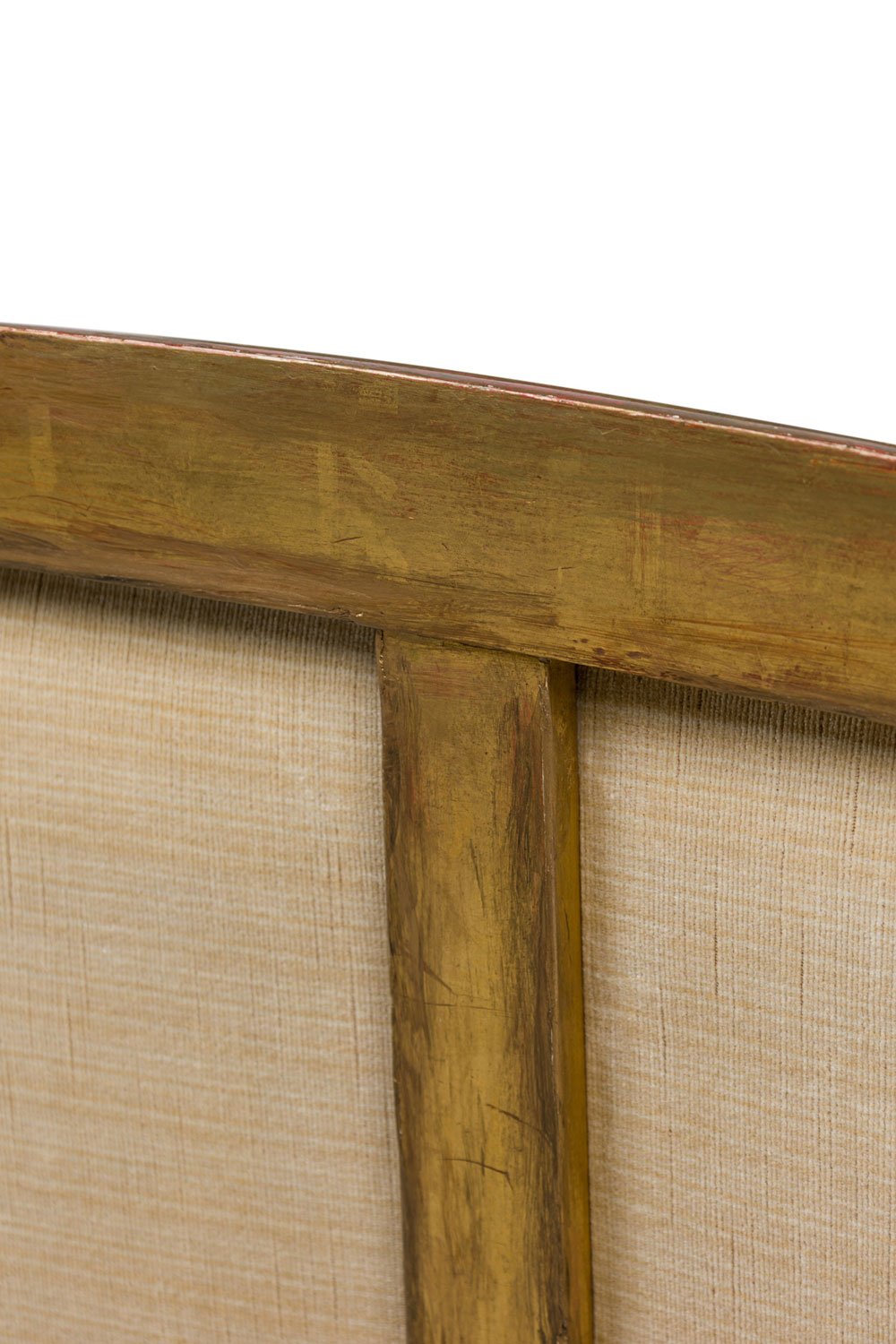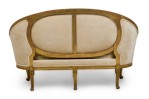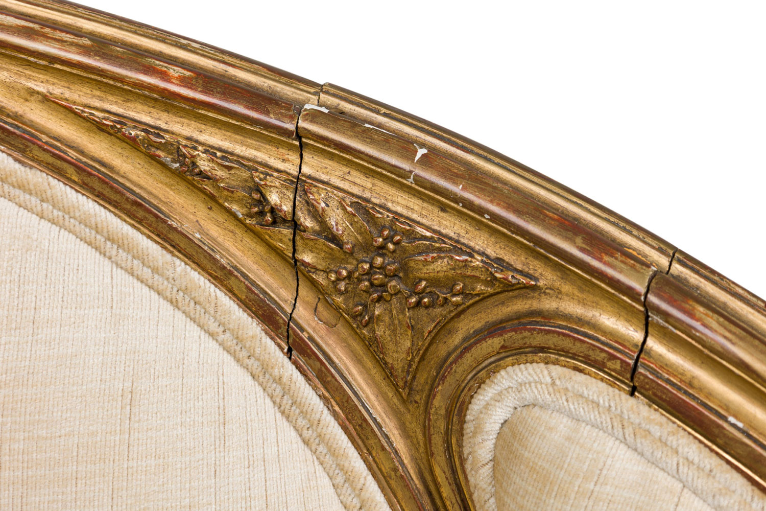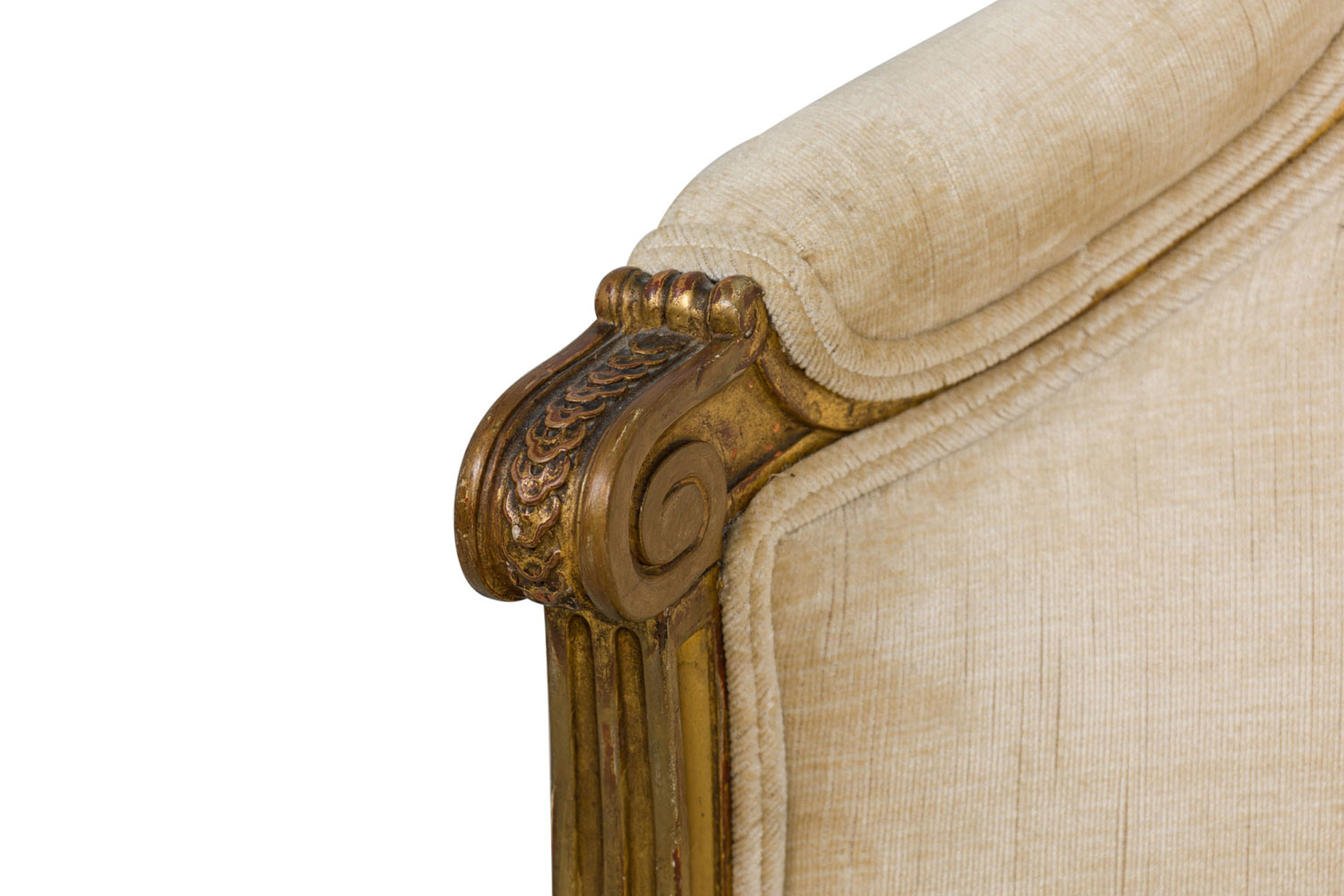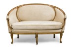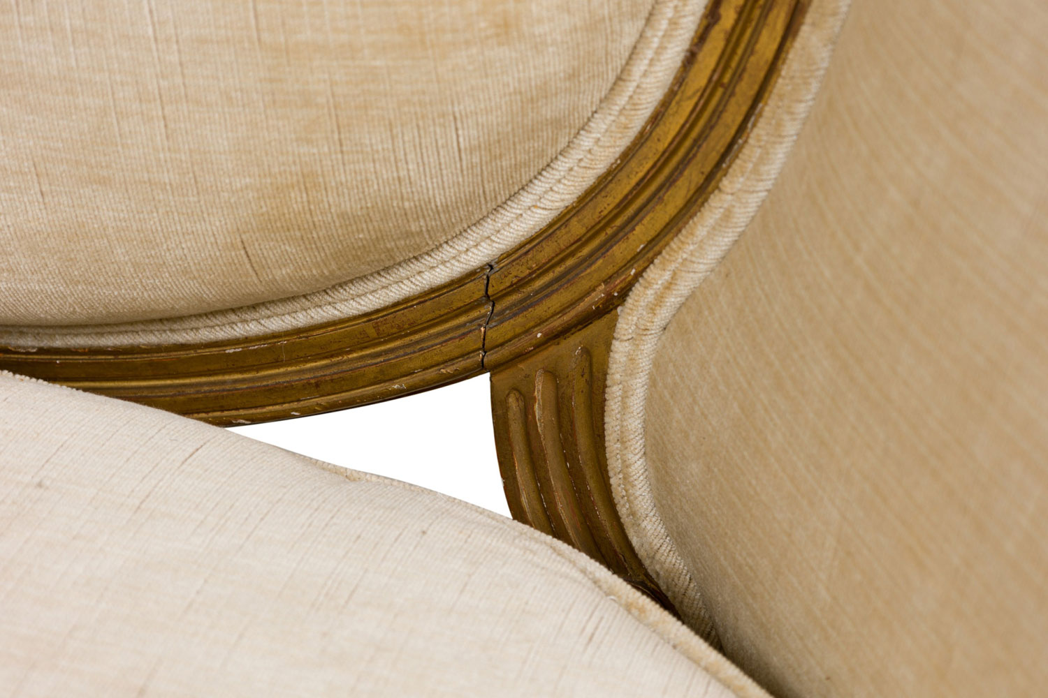 Style: French Materials & Techniques: Fabric, gilt / giltwood, upholstered, wood Category: Seating Condition: Some wear and losses to gilt finish, minor wear and staining to upholstery. Good; Wear consistent with age and use