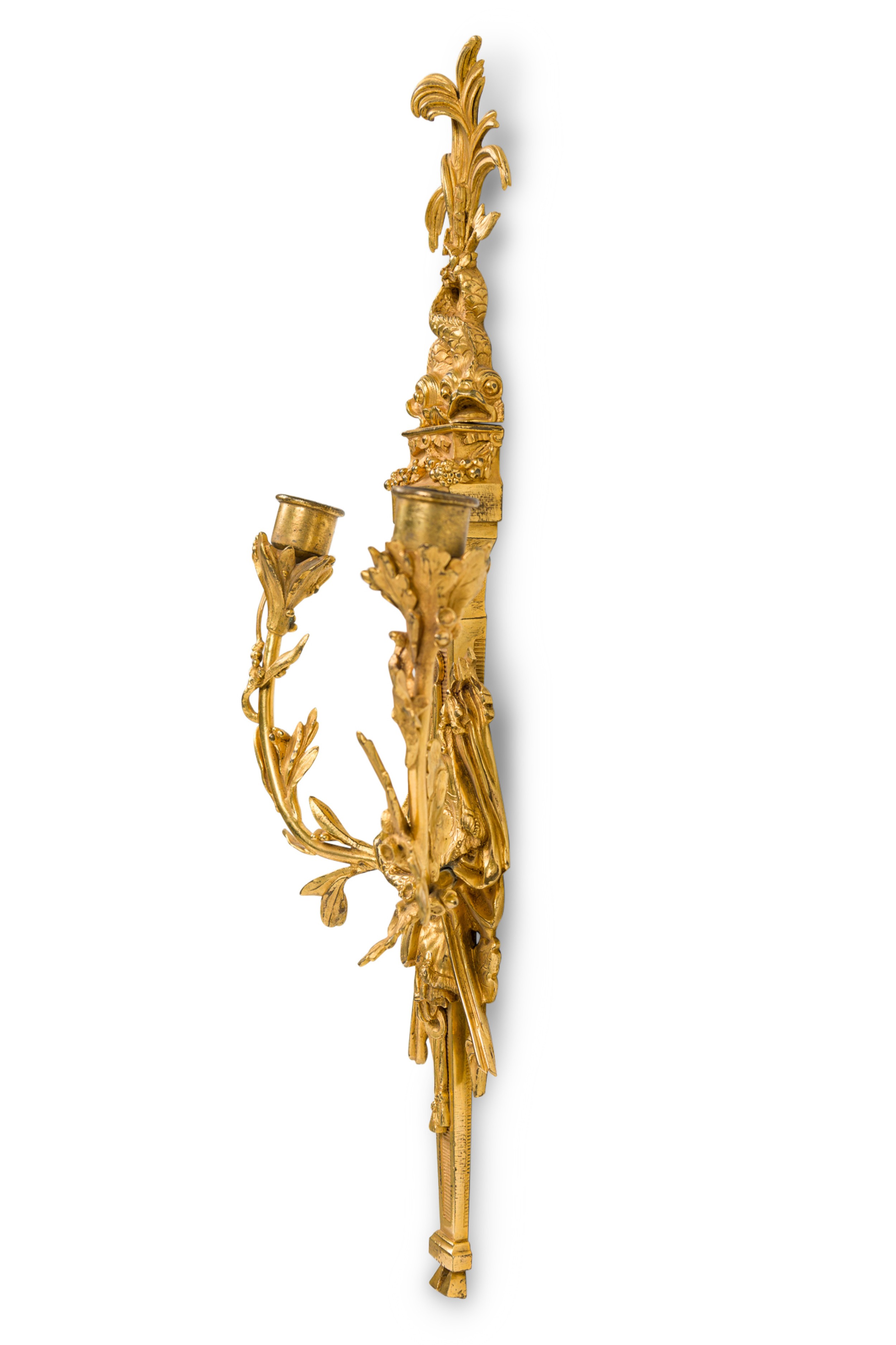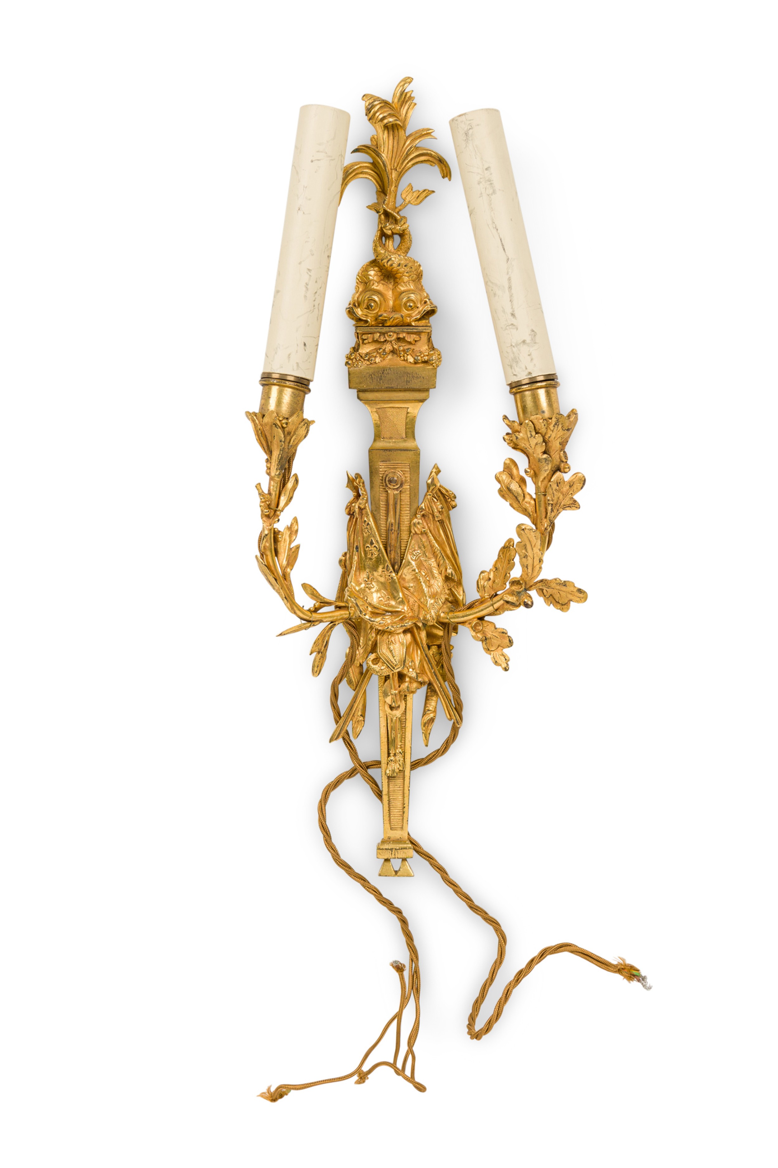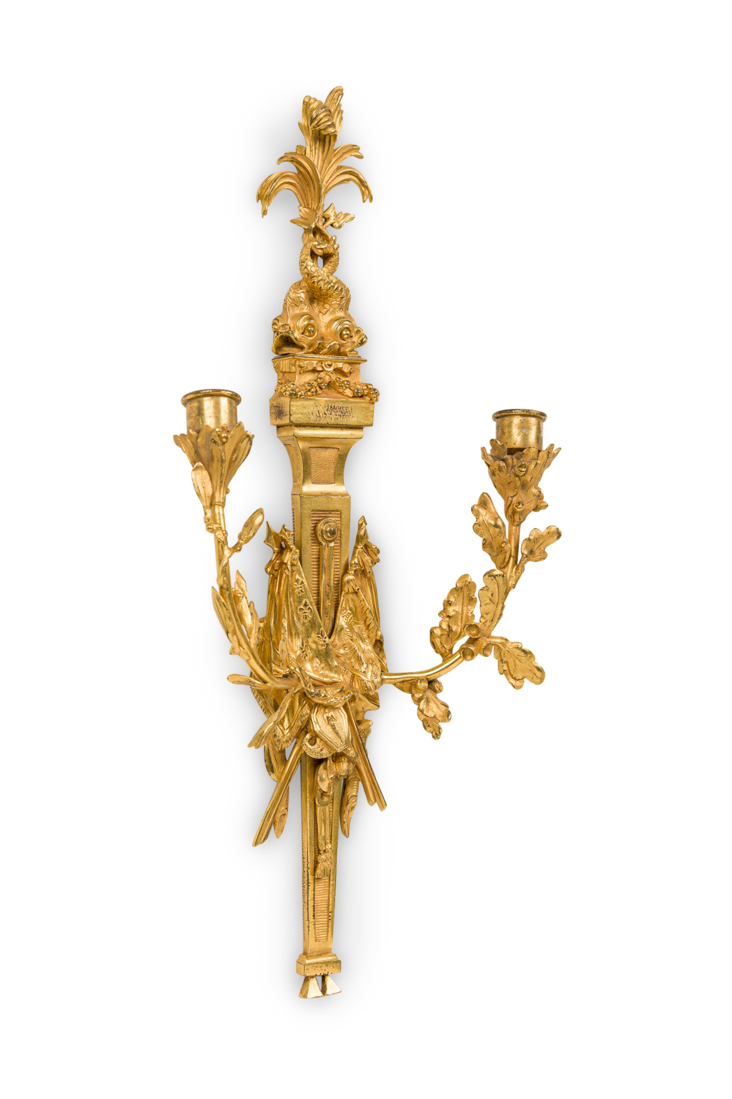 PAIR of French Louis XVI style (19th Century) gilt bronze 2 arm wall sconces with 2 dolphins at the top and a pair of centered crossed flags with 1 have a Fleur de Lis design (PRICED AS PAIR).