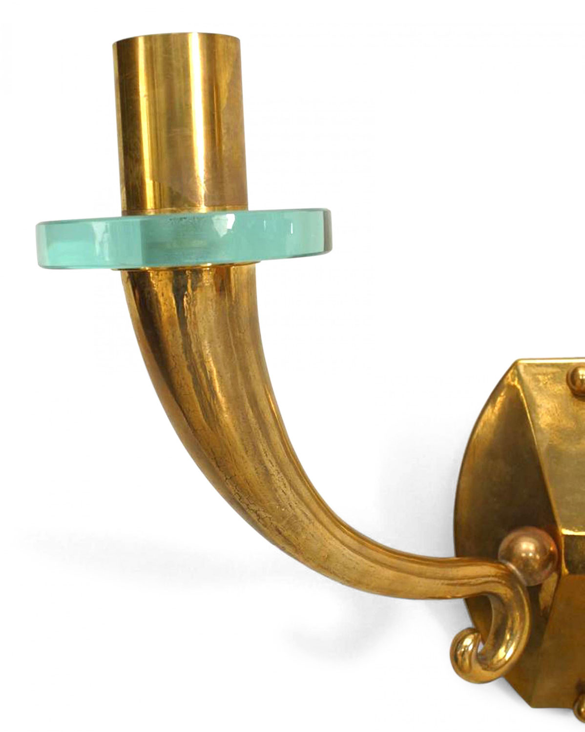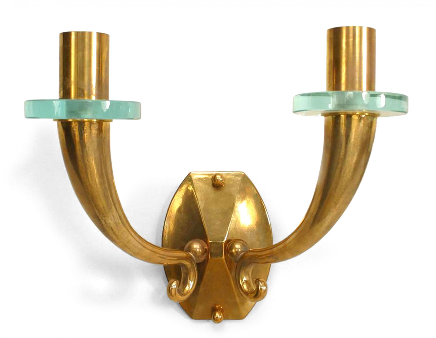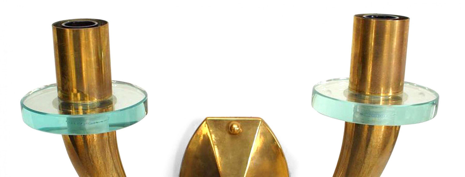 PAIR of French Mid-Century (1940's) bronze wall sconces with 2 scroll and cornucopia design arms with a round glass bobeche and supported by a shaped backplate. (PRICED AS PAIR)