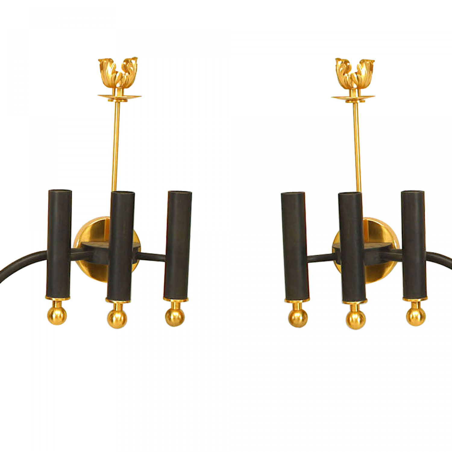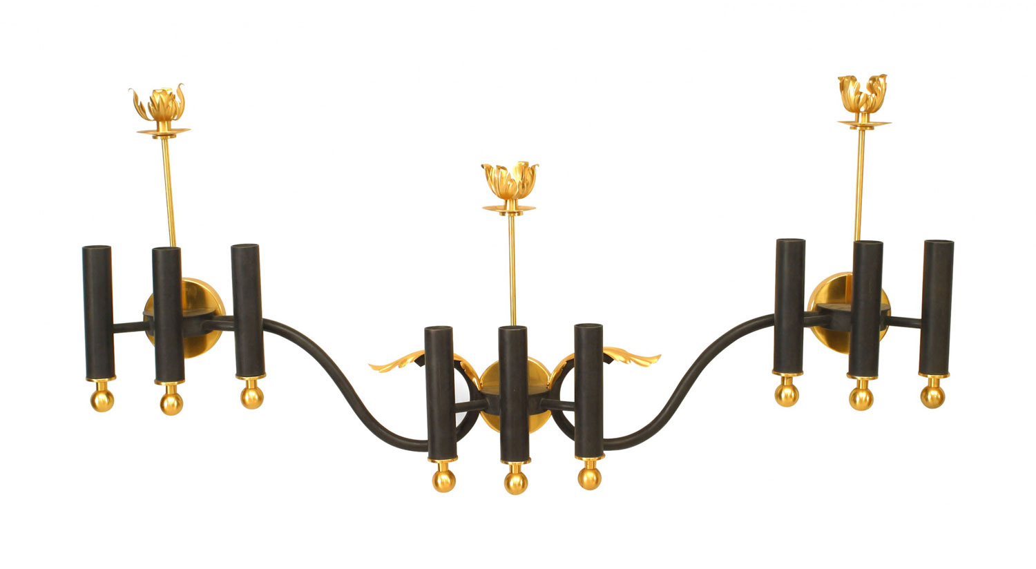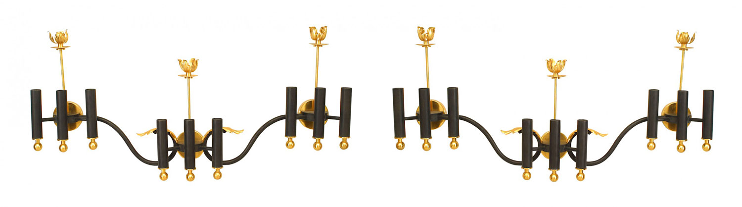 PAIR of French Mid-Century (1950's) iron & gilt brass nine light sconces consisting of three groups of three lights finished with brass ball base & single candlelight top and a foliate center. (PRICED AS PAIR).
