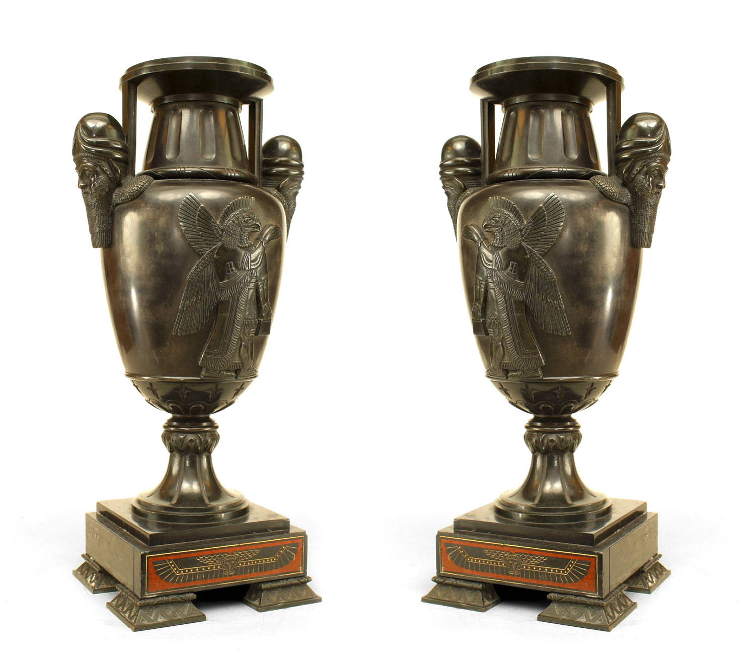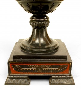 PAIR of French Victorian black marble and bronze urns with male mask handles and Egyptian motif relief and resting on a square base with square lattice design feet. (PRICED AS PAIR)