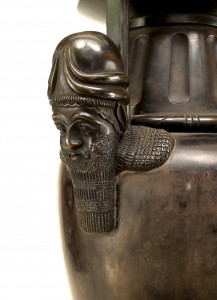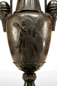 PAIR of French Victorian black marble and bronze urns with male mask handles and Egyptian motif relief and resting on a square base with square lattice design feet. (PRICED AS PAIR).