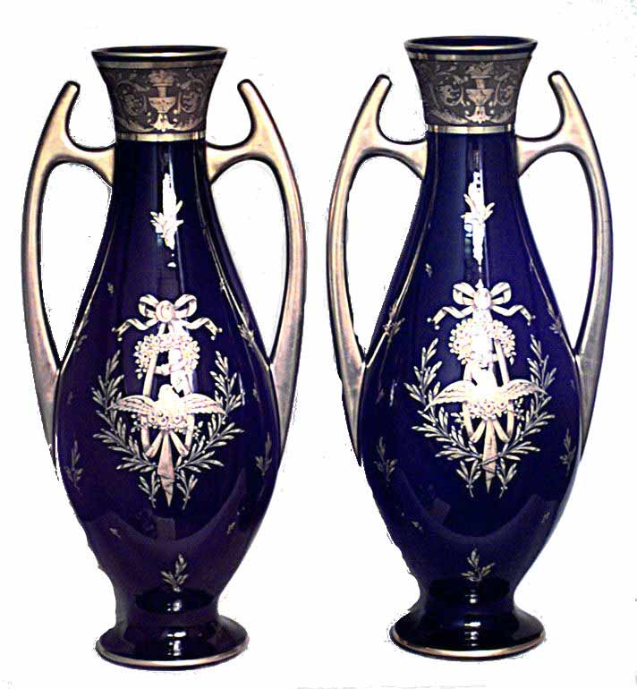 PAIR of French Victorian blue porcelain and gilt trimmed vases with open gilt handles and bird & wreath design. (PRICED AS PAIR).