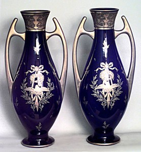 PAIR of French Victorian blue porcelain and gilt trimmed vases with open gilt handles and bird & wreath design. (PRICED AS PAIR)