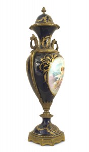 PAIR of French Victorian blue Sevres porcelain vases with bronze trim handles and cover and painting of two cupids. (PRICED AS PAIR).