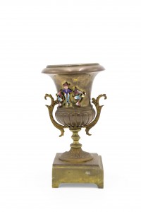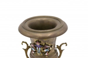 PAIR of French Victorian bronze urns with handles and enamel crest. (PRICED AS PAIR)