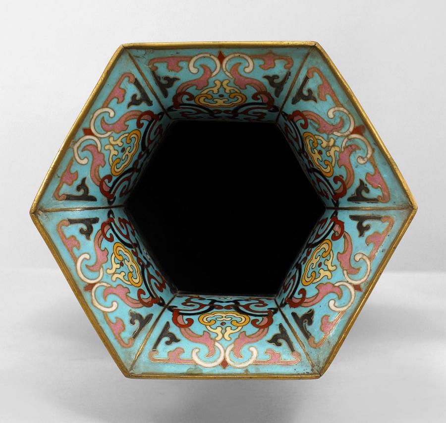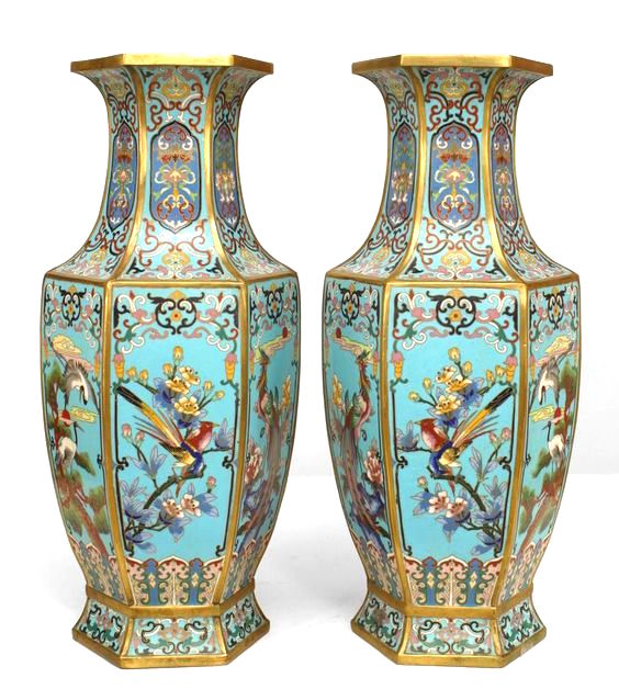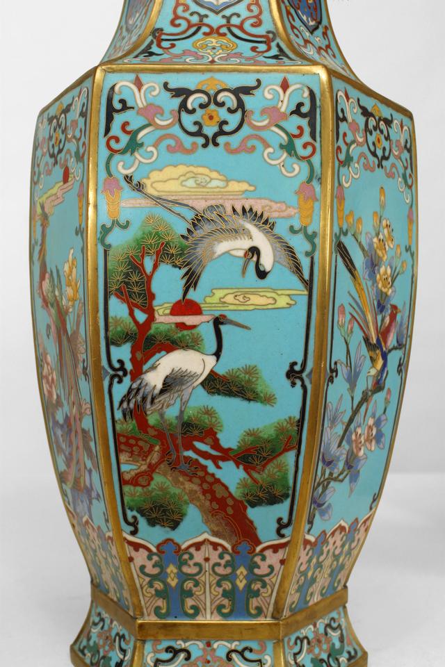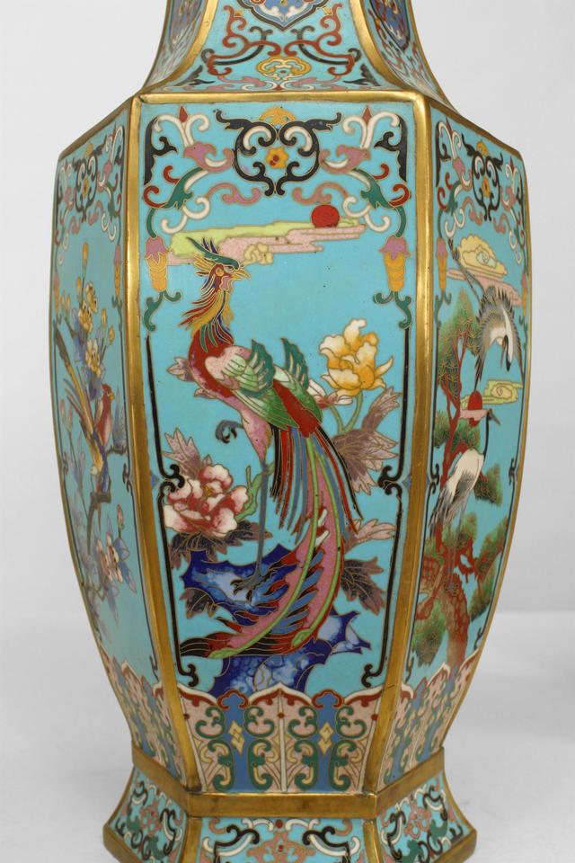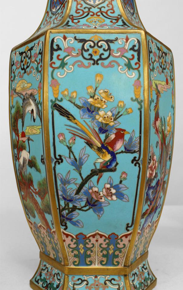 PAIR of French Victorian blue enamel and cloisonne hexagonal shaped Chinoiserie decorated vases. (PRICED AS PAIR)