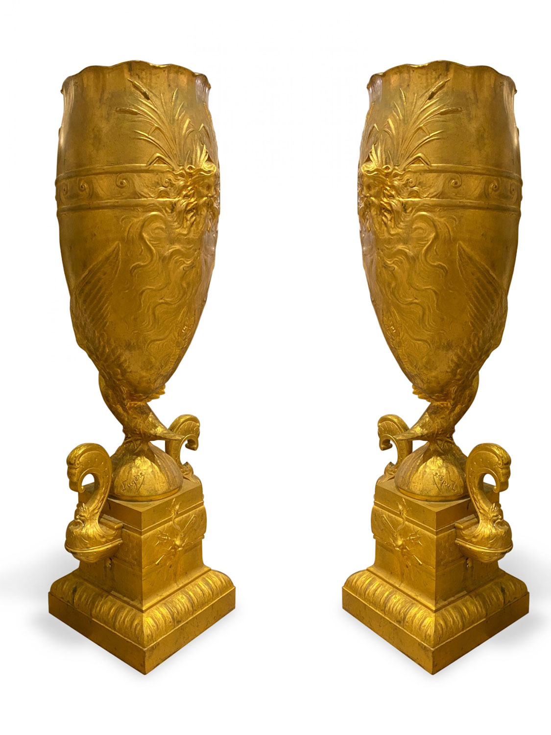 PAIR of French Victorian gilt bronze tall and narrow vases with swan on square base and handles with head in relief (signed J. FUGERE) (PRICED AS PAIR).