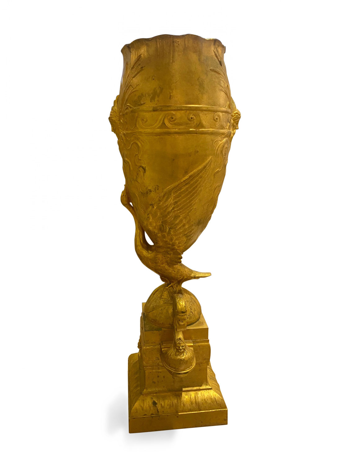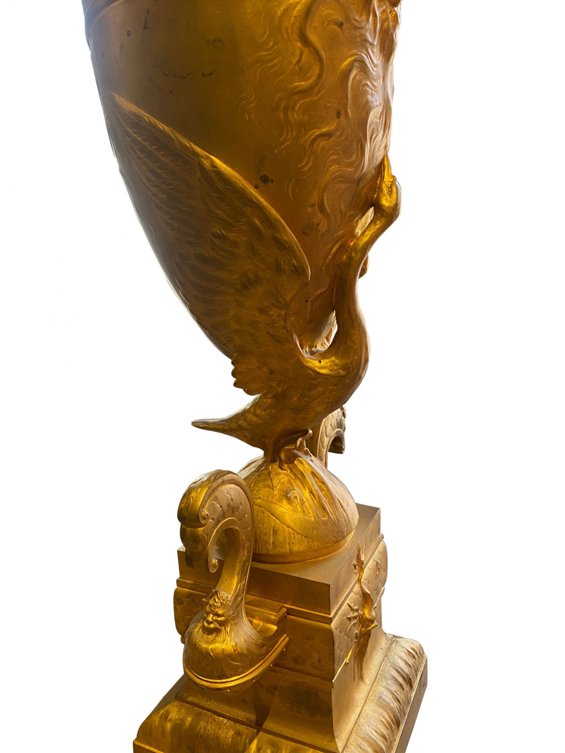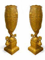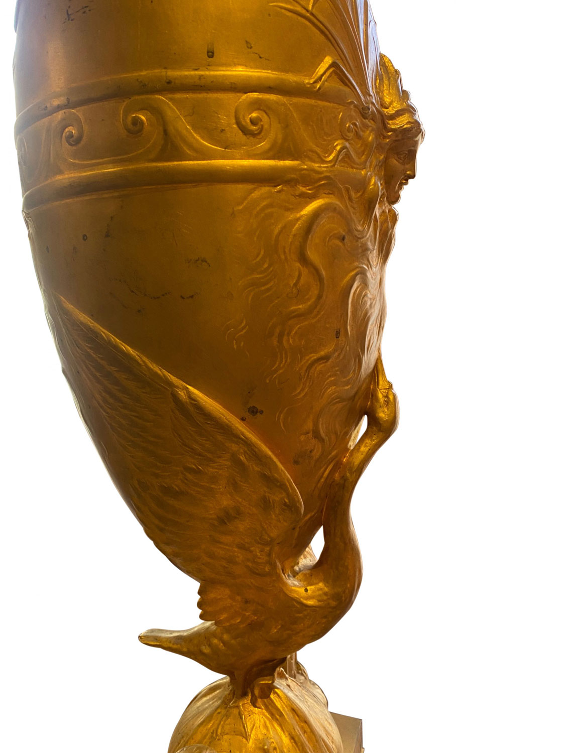 PAIR of French Victorian gilt bronze tall and narrow vases with swan on square base and handles with head in relief (signed J. FUGERE) (PRICED AS PAIR)