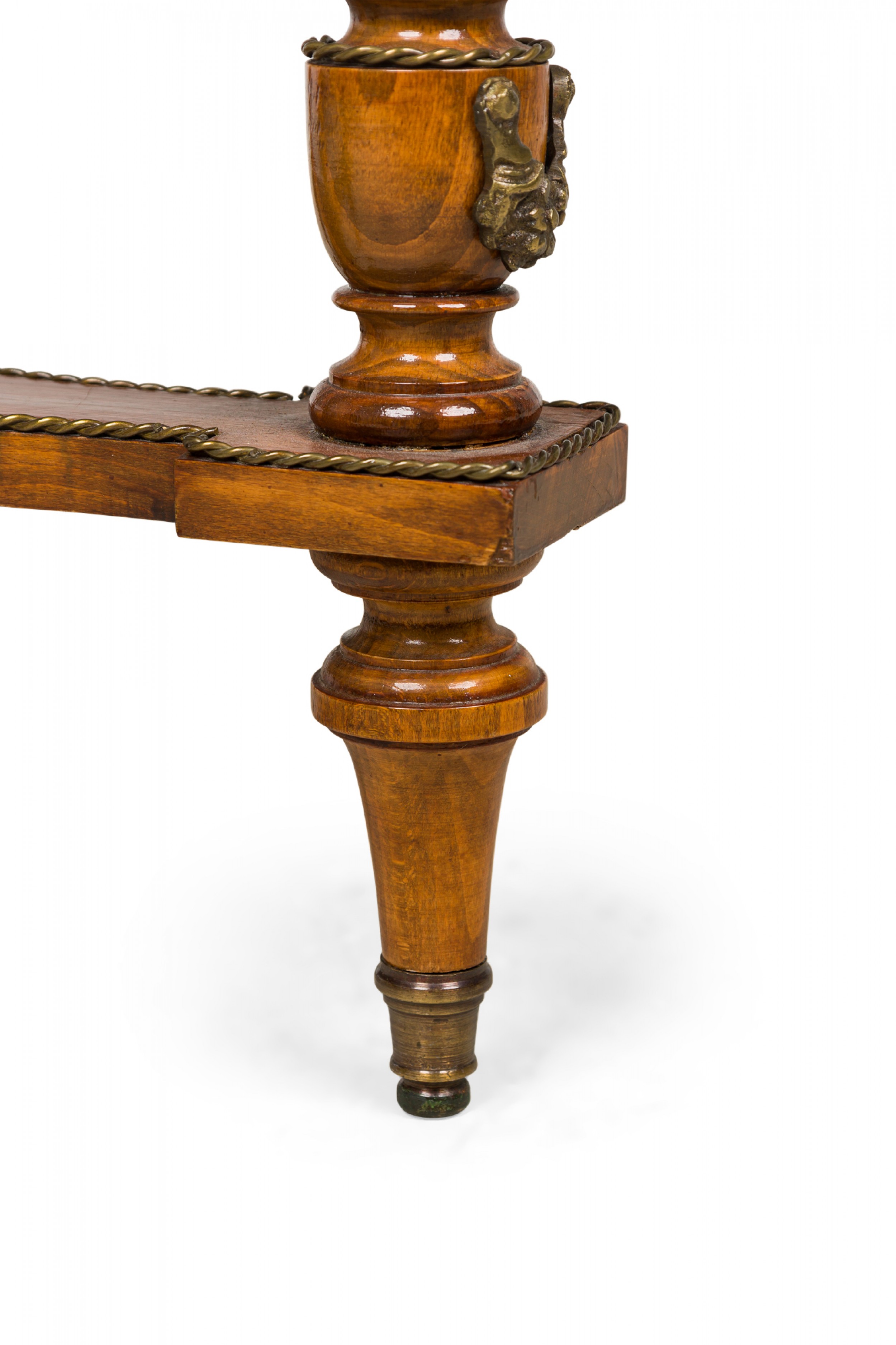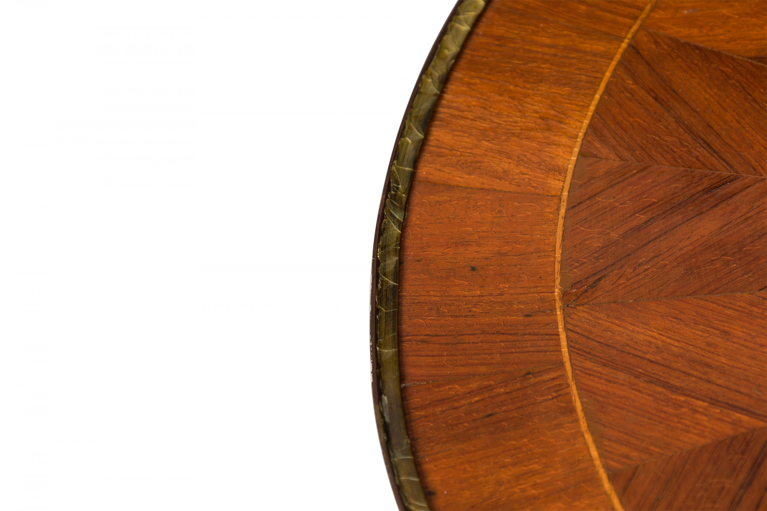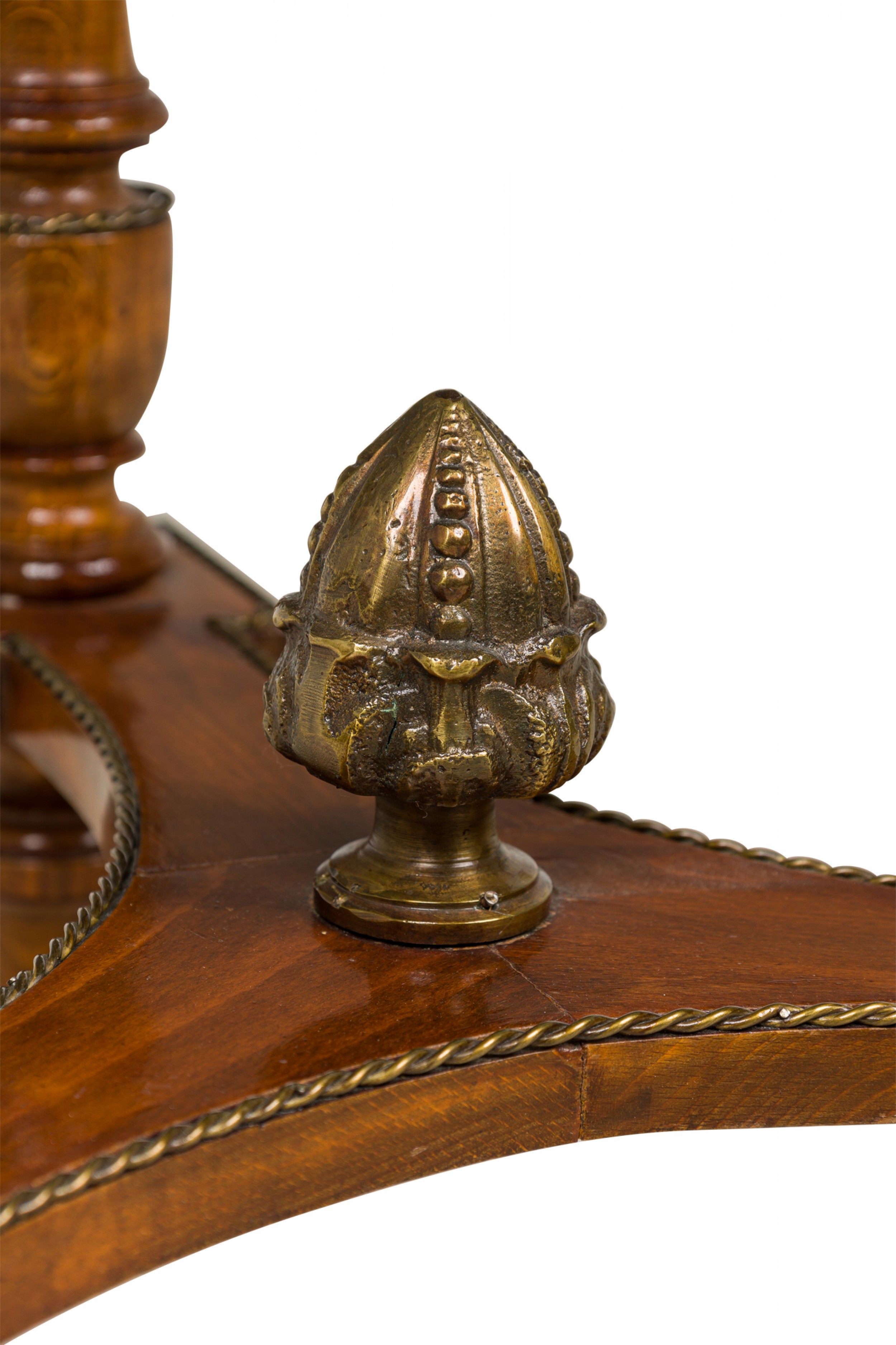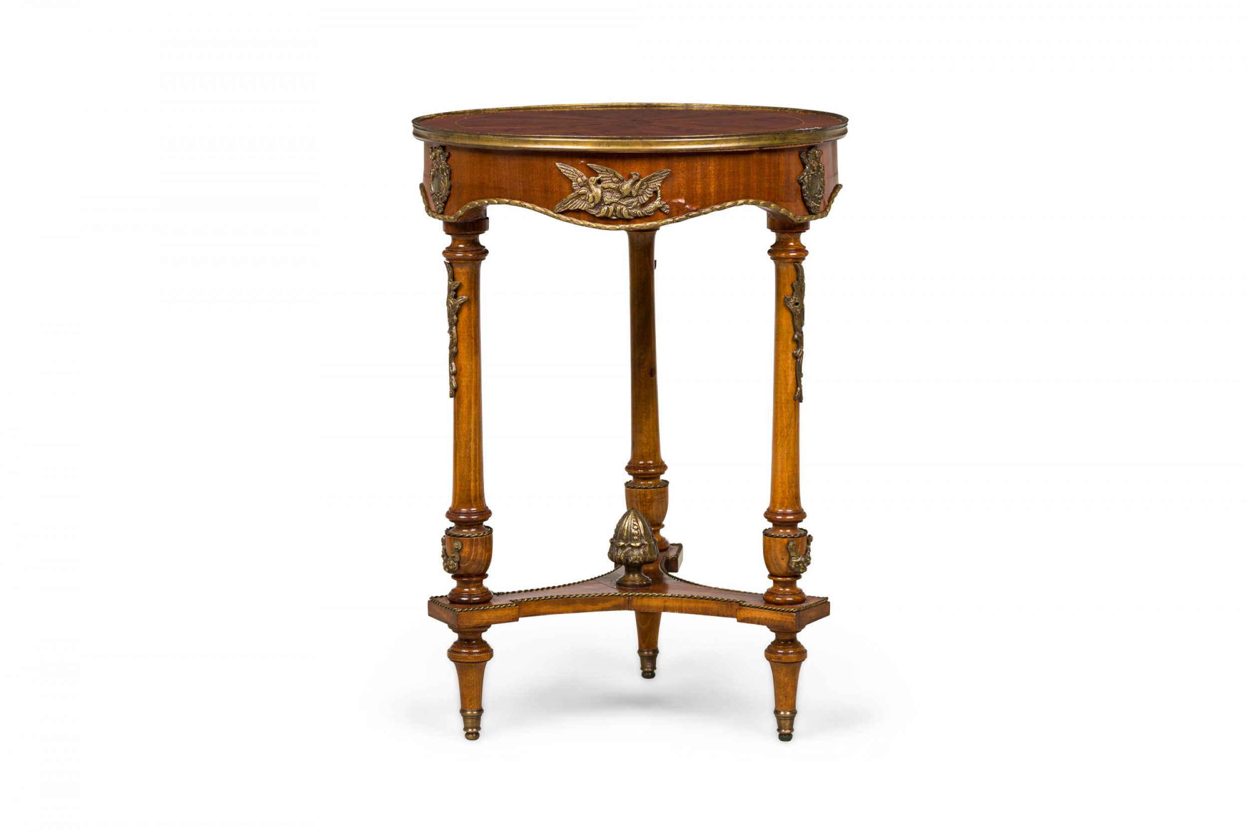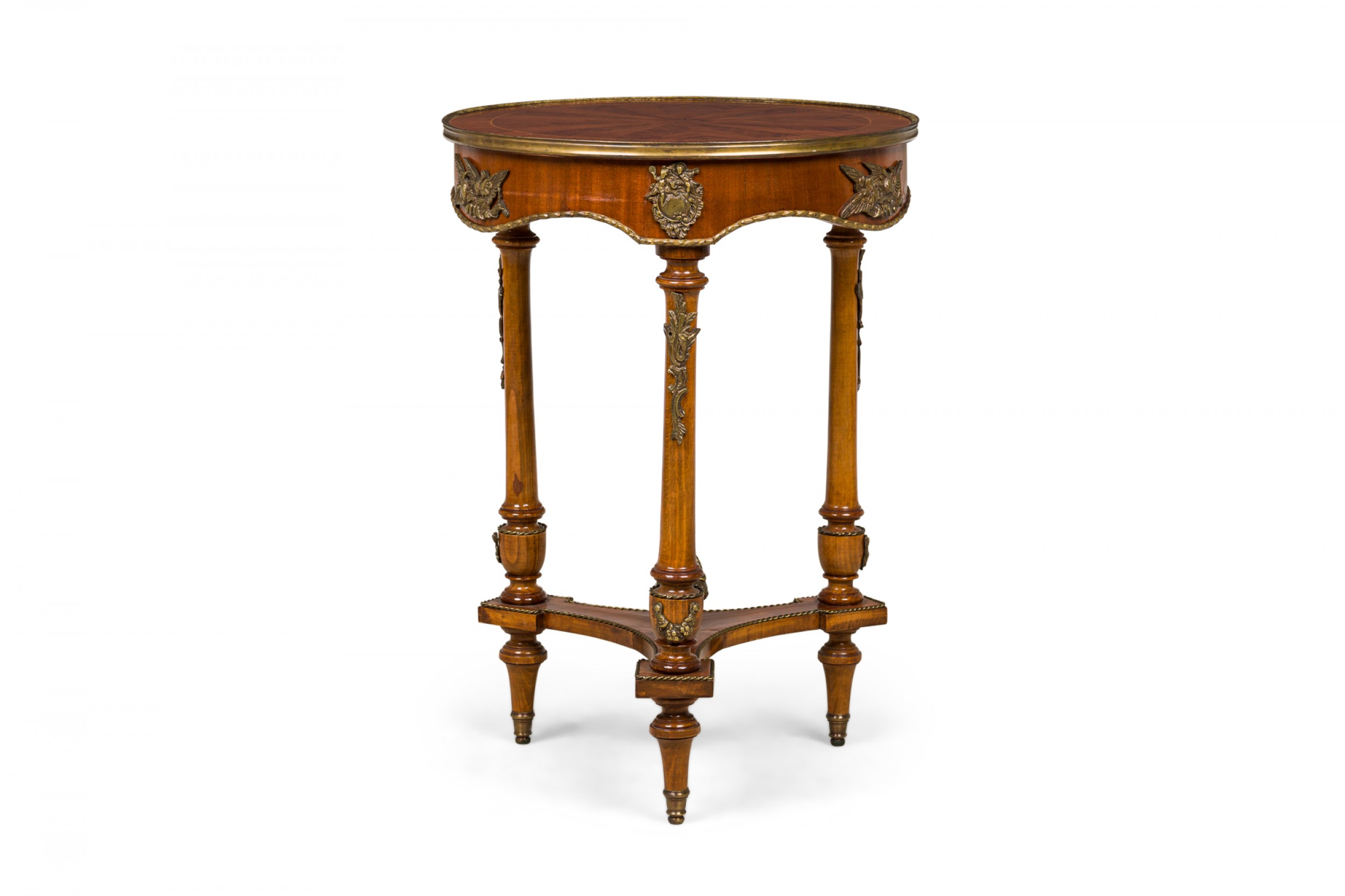 PAIR of French Victorian-style (20th Century) circular end / side tables featuring a starburst inlaid tops with applied faux rope brass trim border, eagle emblems and putti crests surrounding the shaped aprons, resting on 3 legs connected by a stretcher with pinecone finials with applied brass scroll & foliate embellishments. (PRICED AS PAIR)