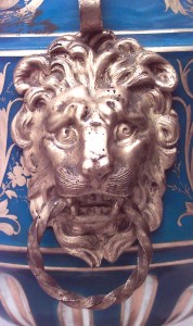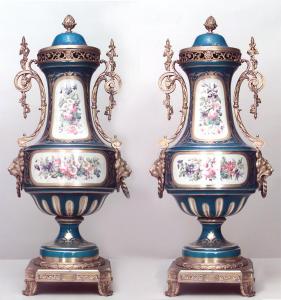 PAIR of French Victorian turquoise Sevres porcelain urns/vases with with cover and bronze trim handles with lion head sides. (PRICED AS PAIR)
