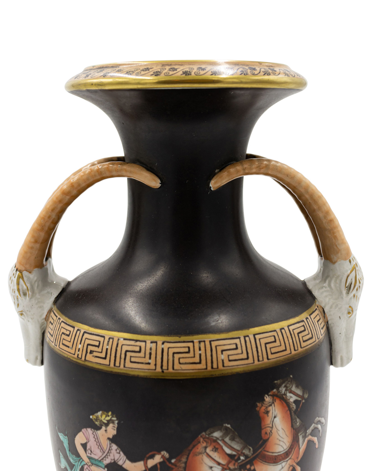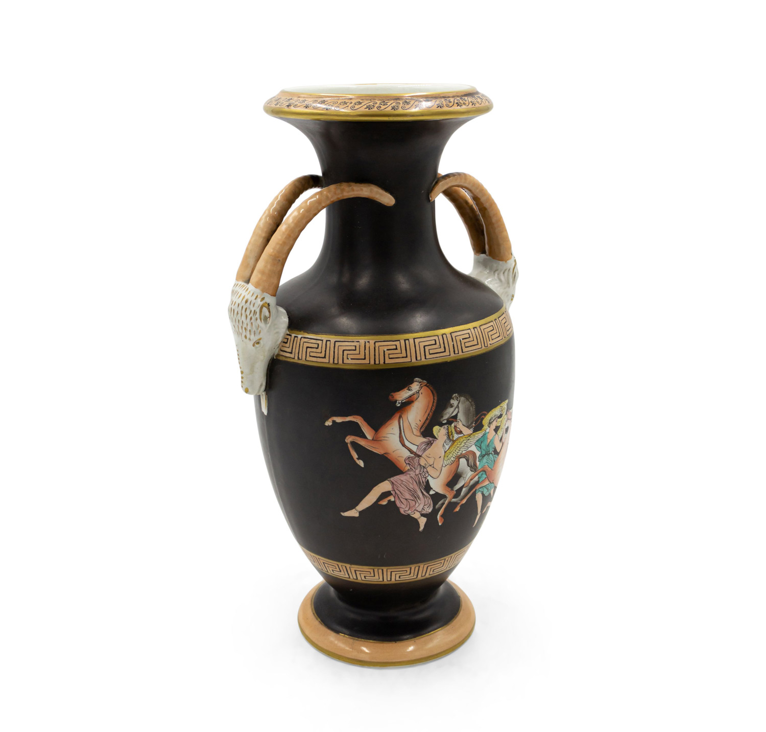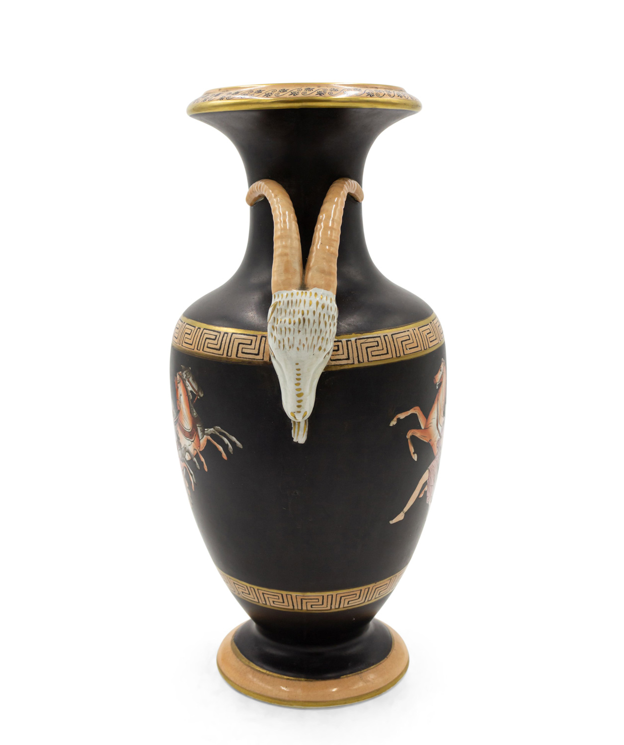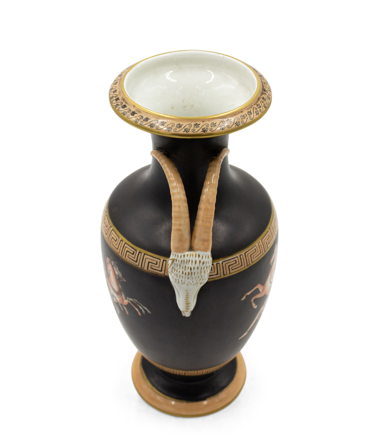 PAIR of Grecian style (19th Cent) orange and black porcelain vases with ram head handles (PRICED AS PAIR)