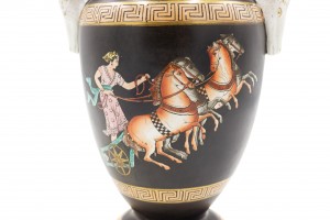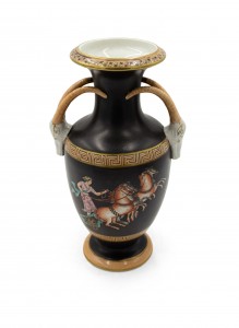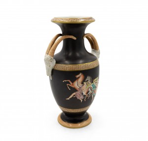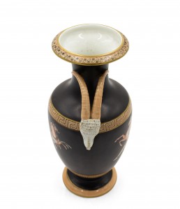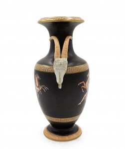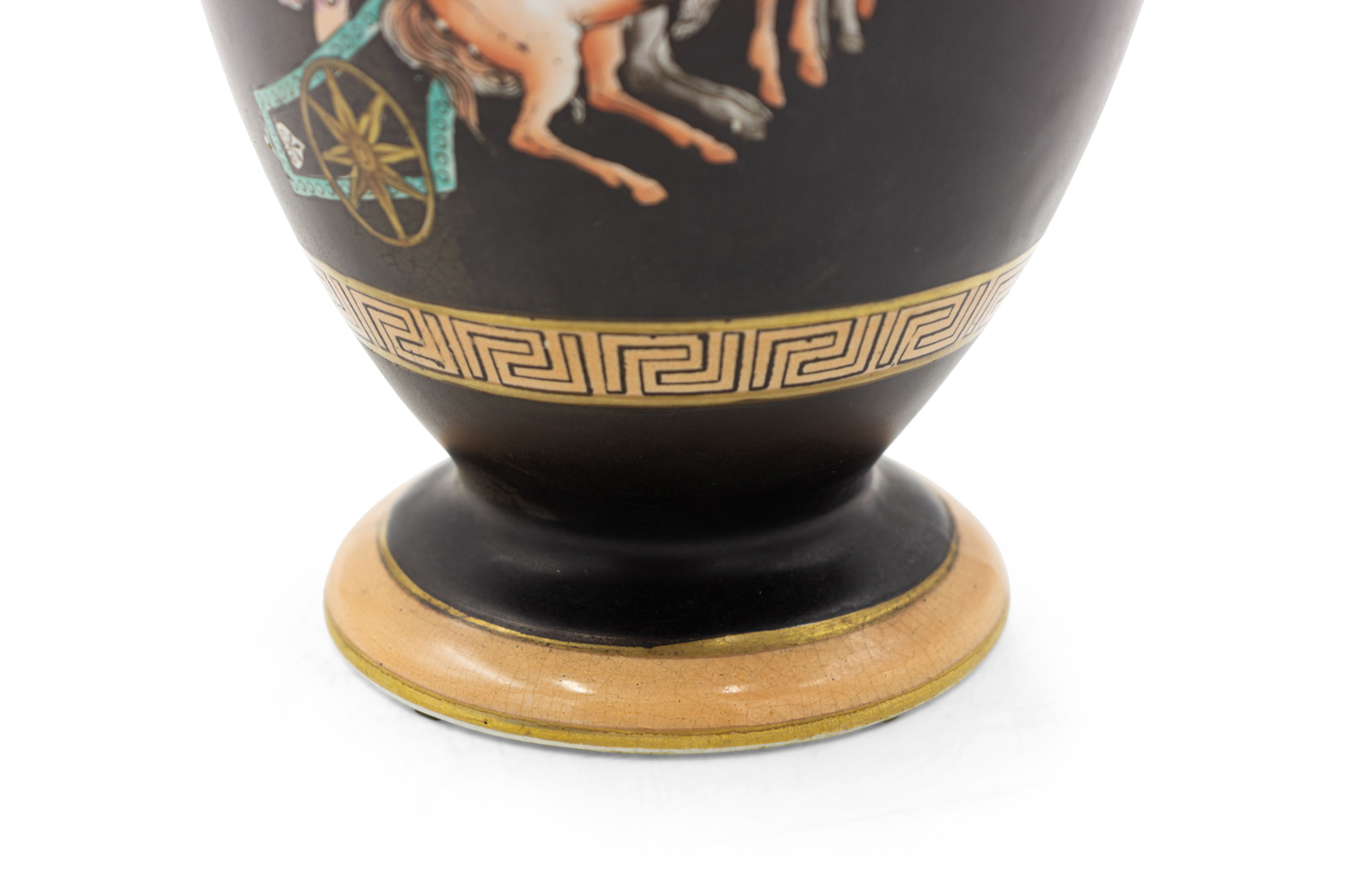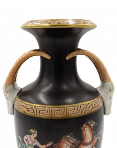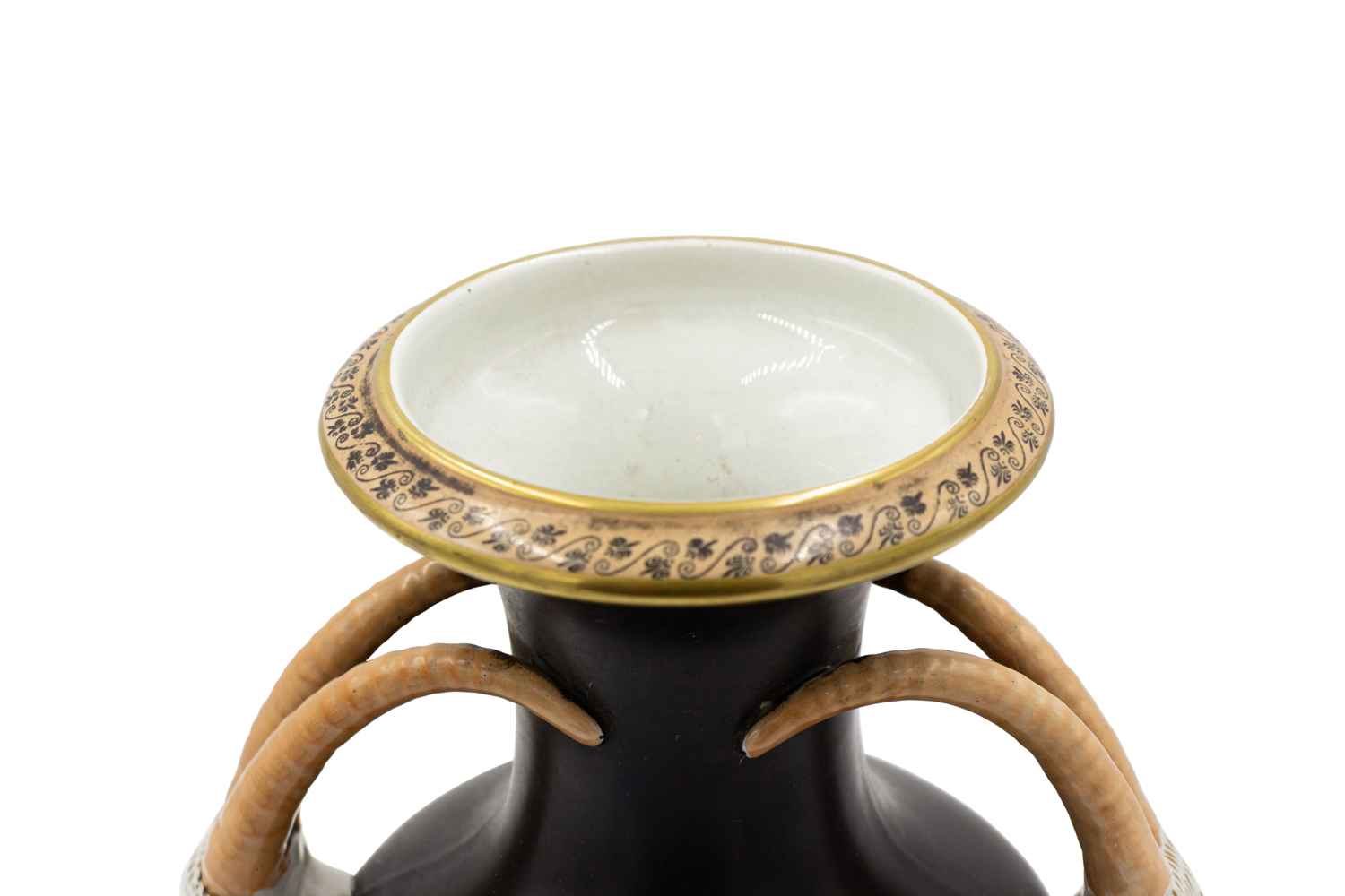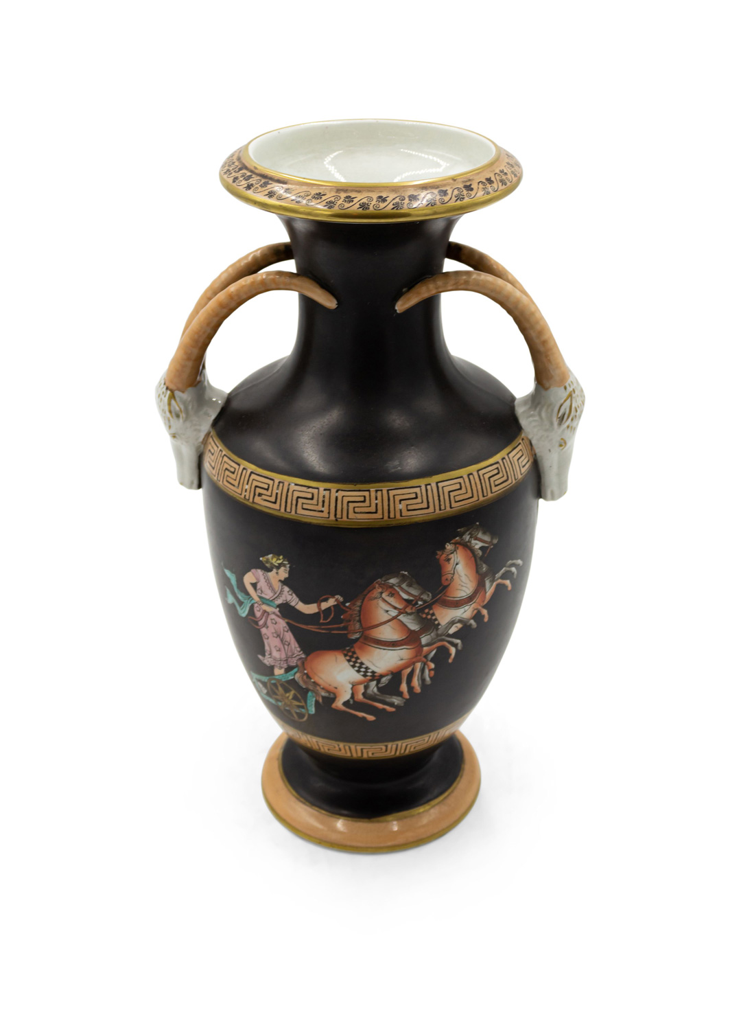 PAIR of Grecian style (19th Cent) orange and black porcelain vases with ram head handles (PRICED AS PAIR)