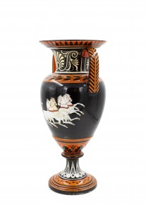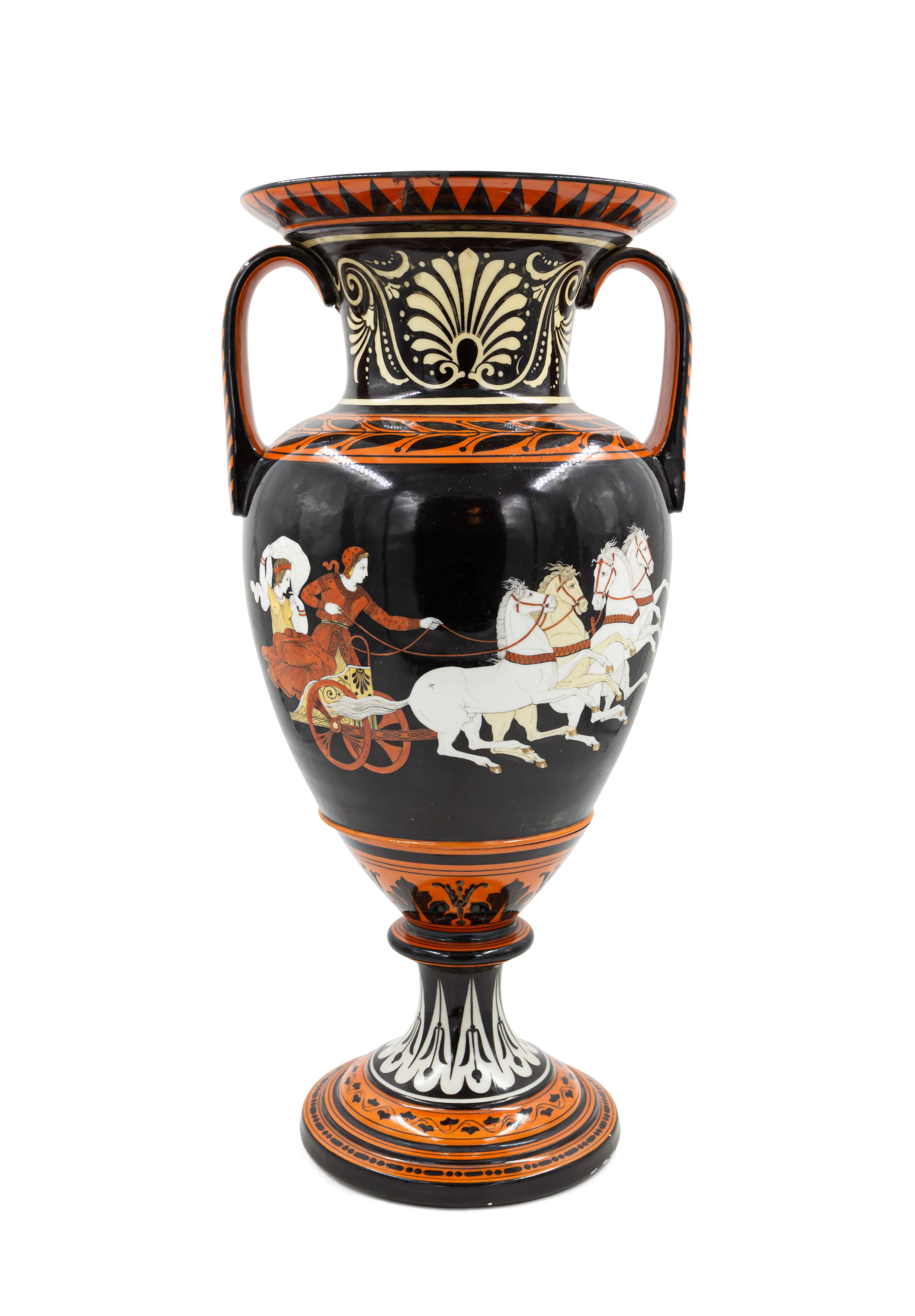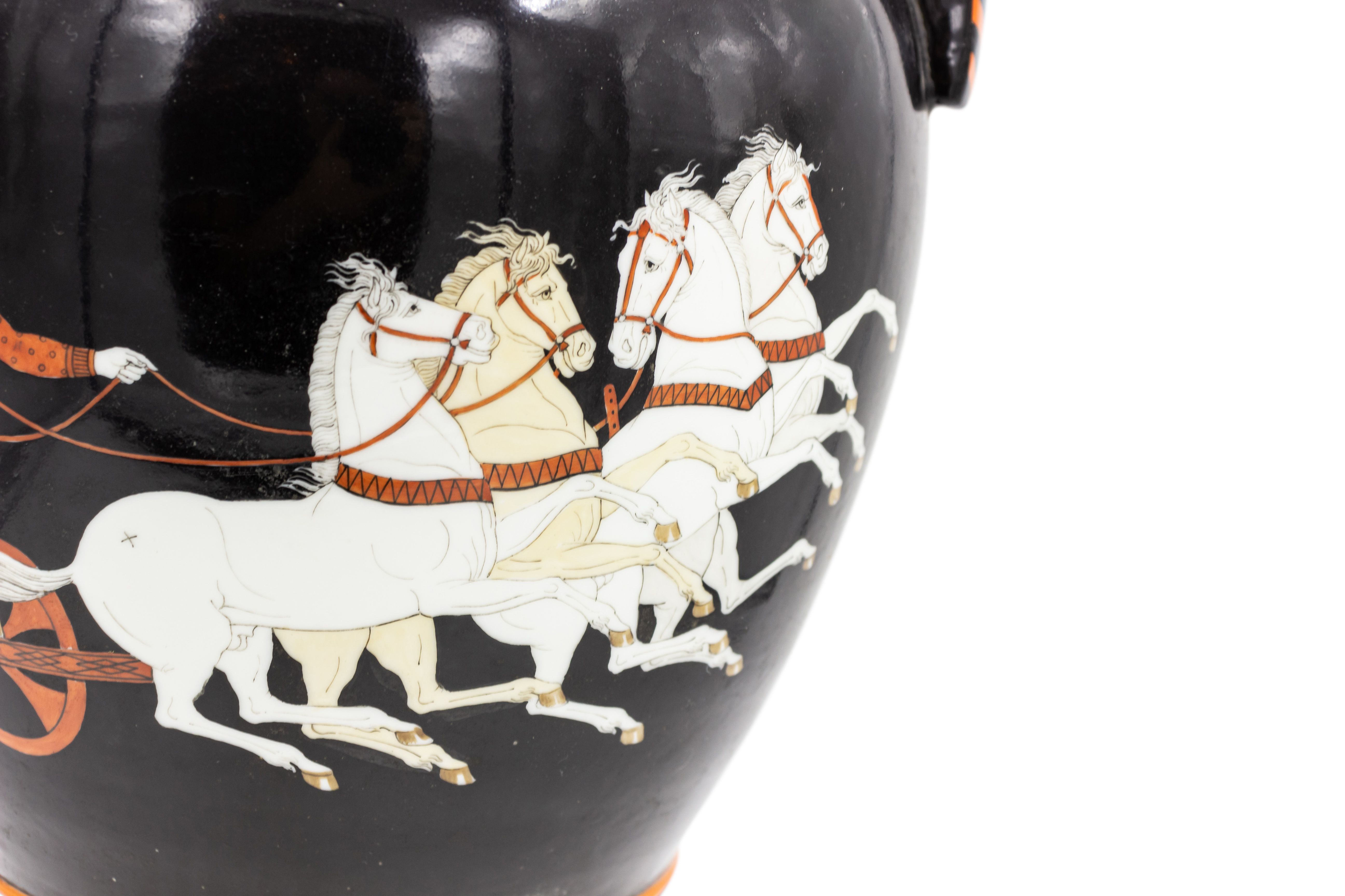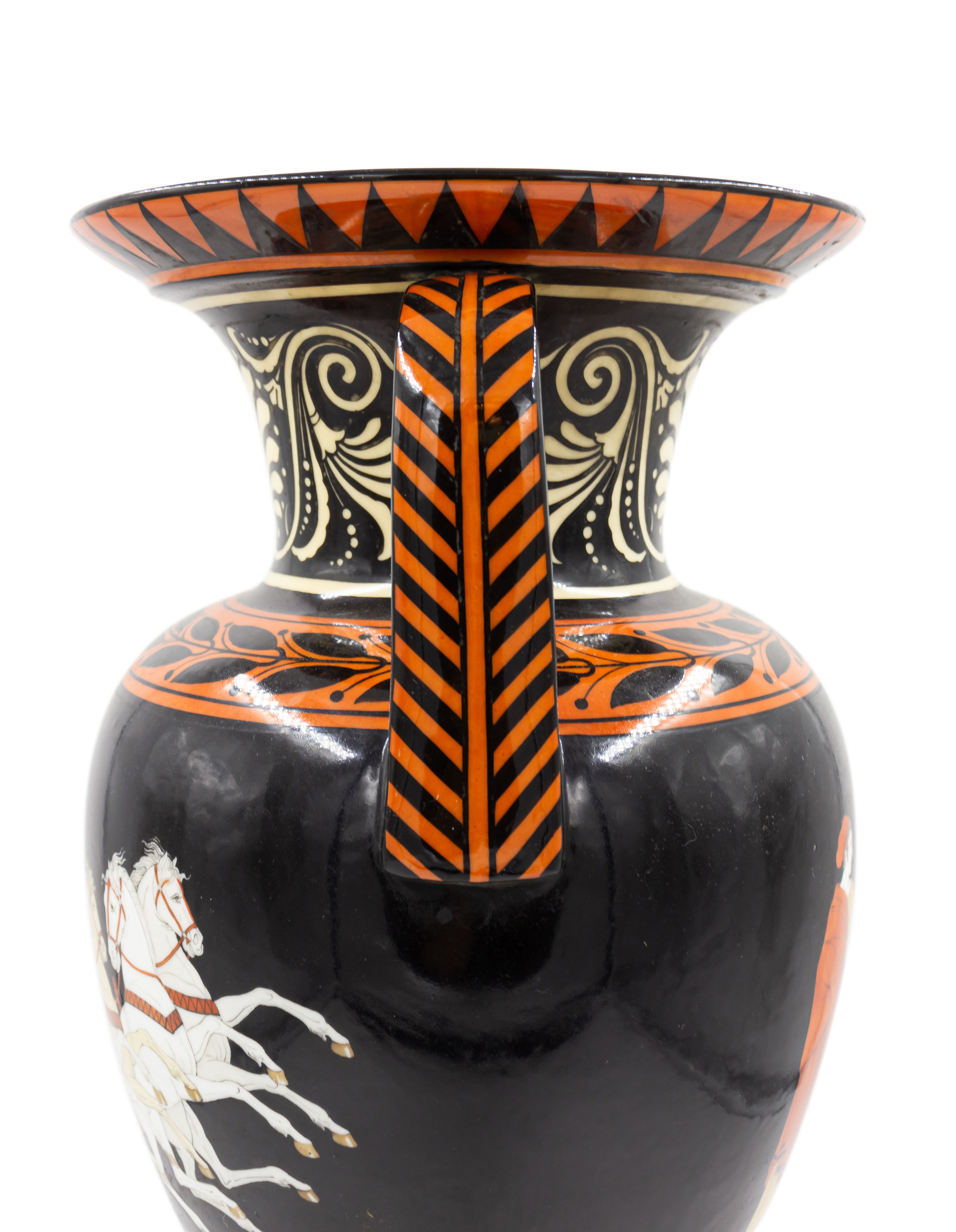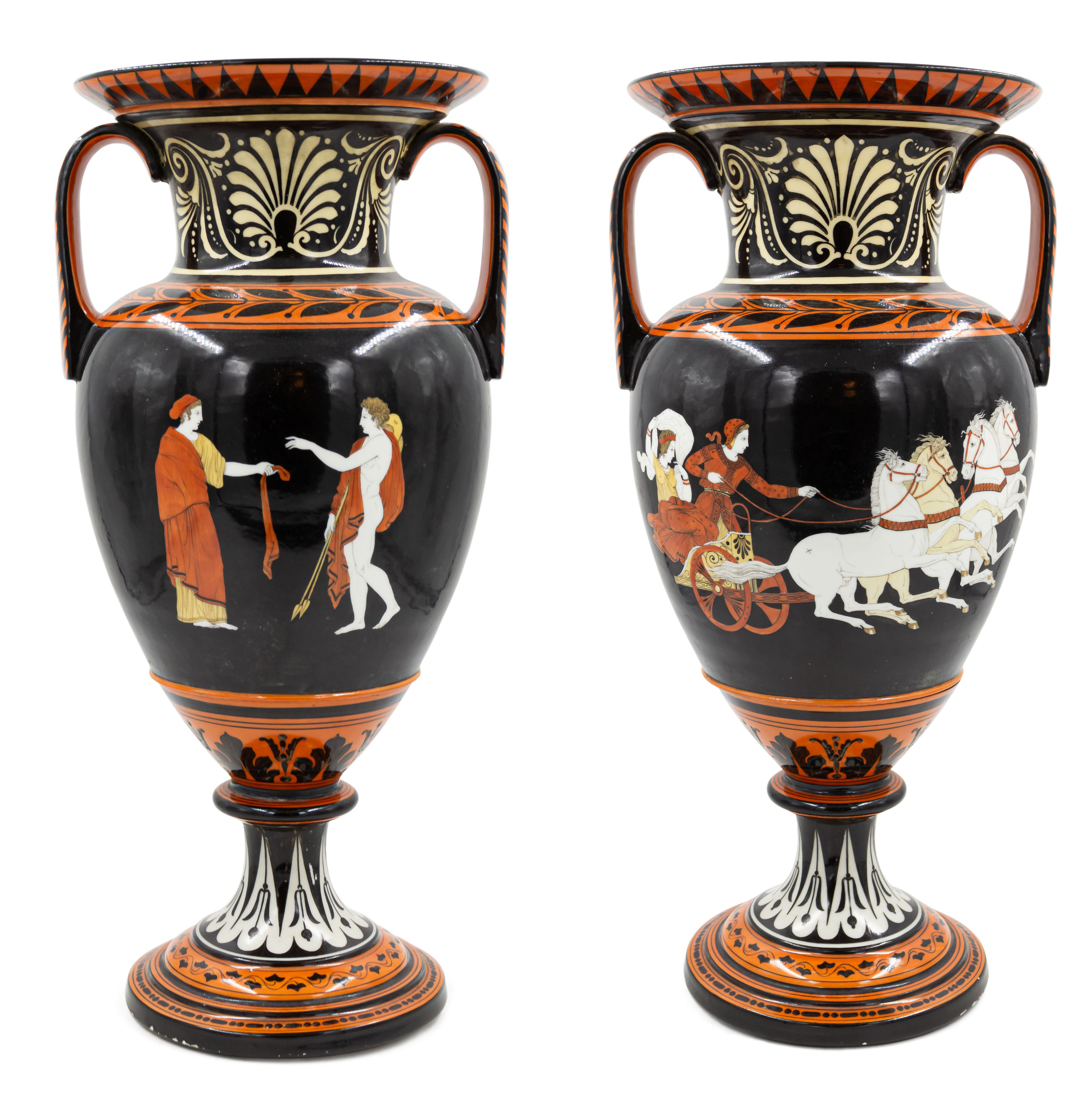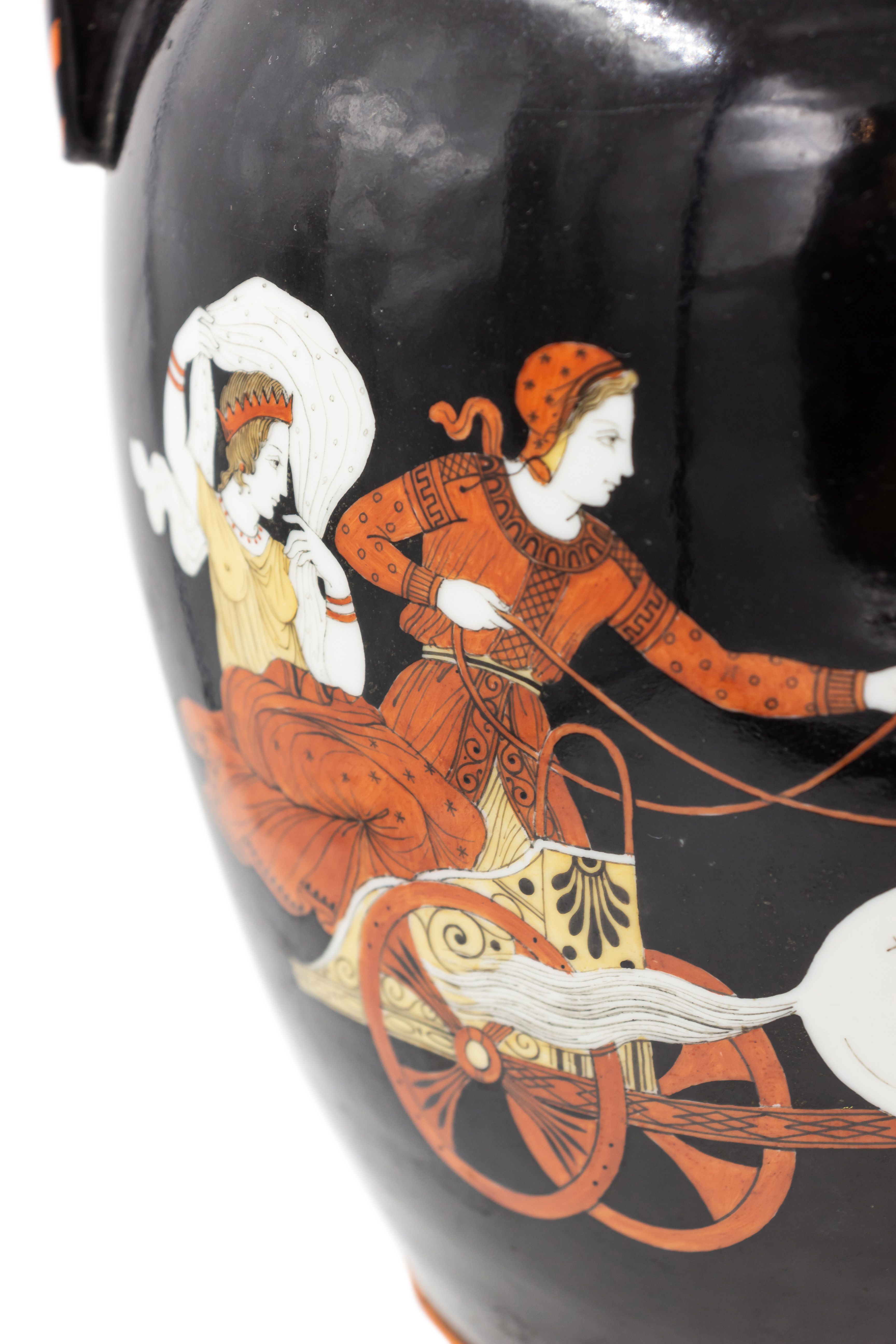 PAIR of Grecian style (19th Cent) black and orange porcelain vases with handles and chariot scene. (PRICED AS PAIR).