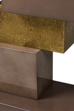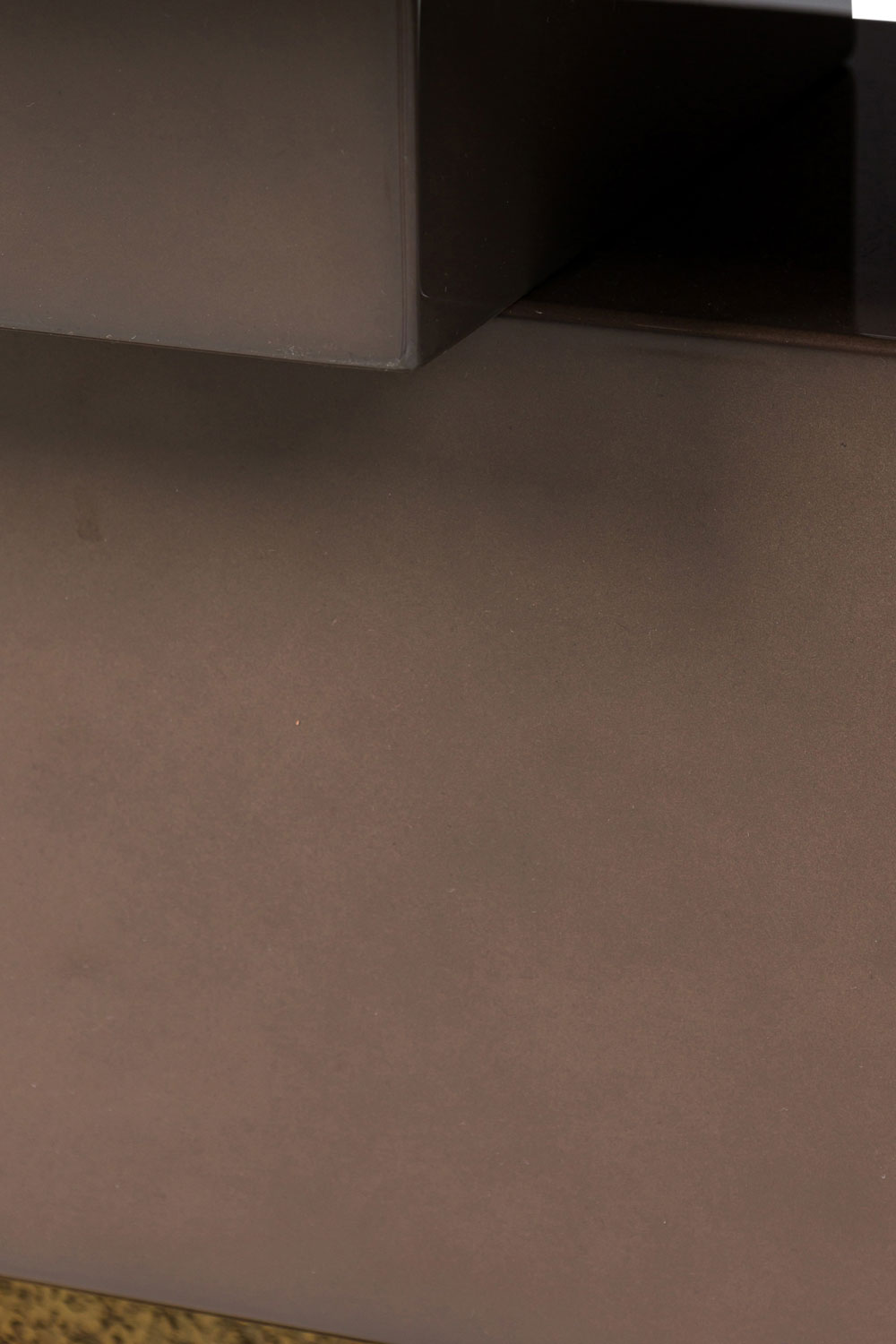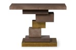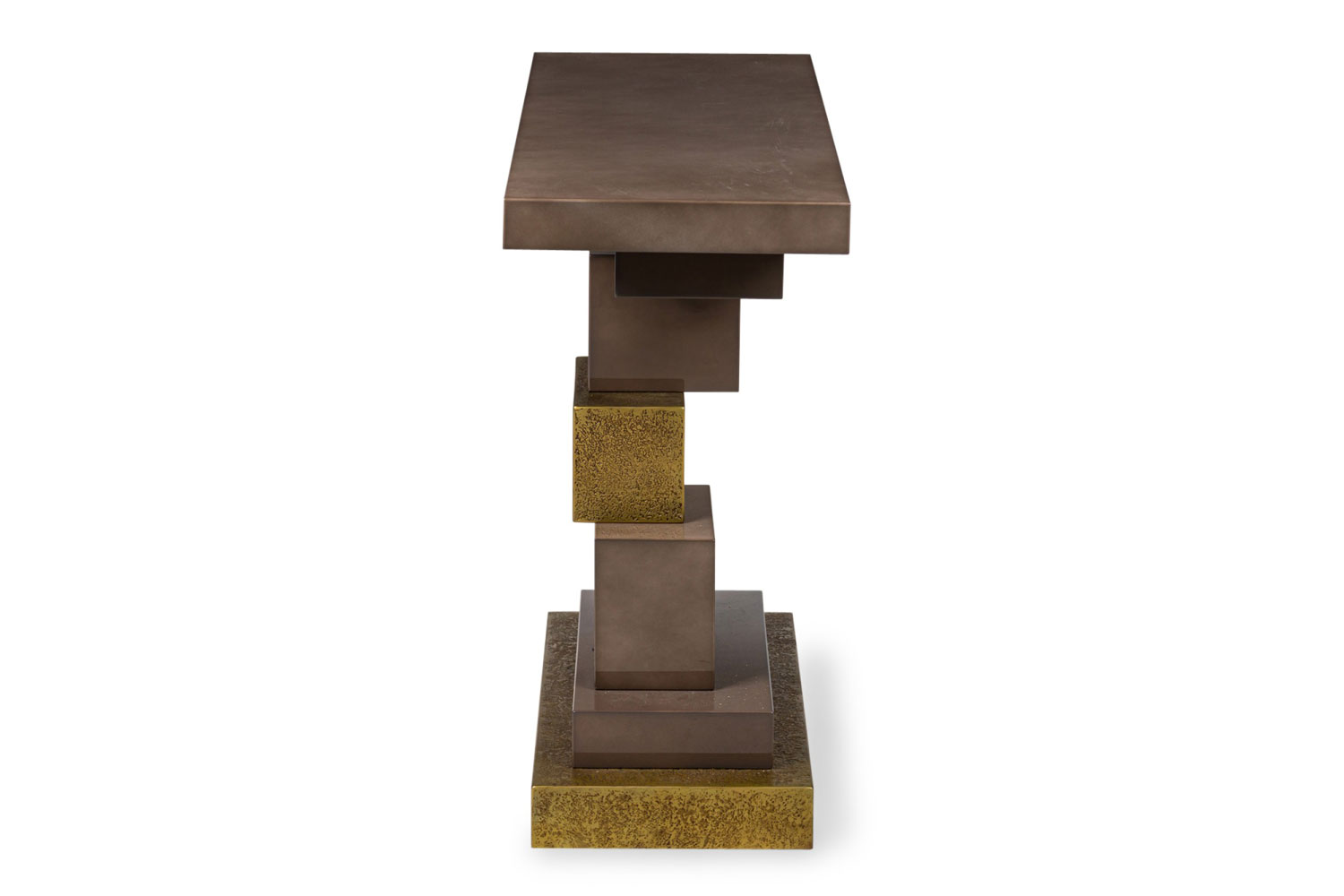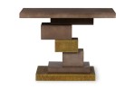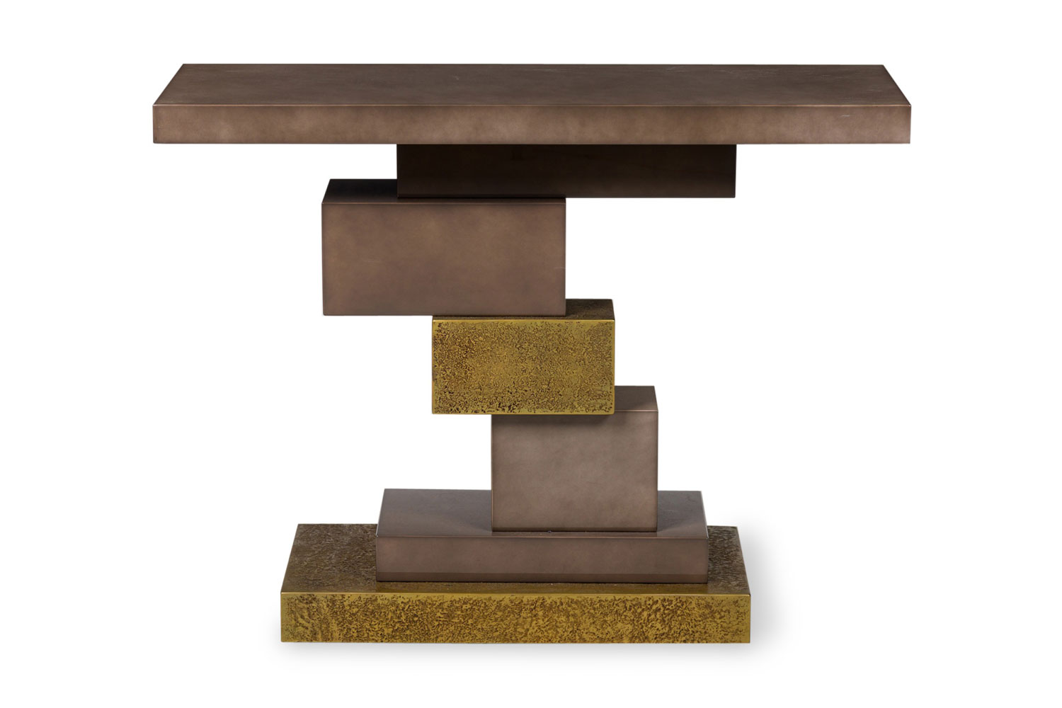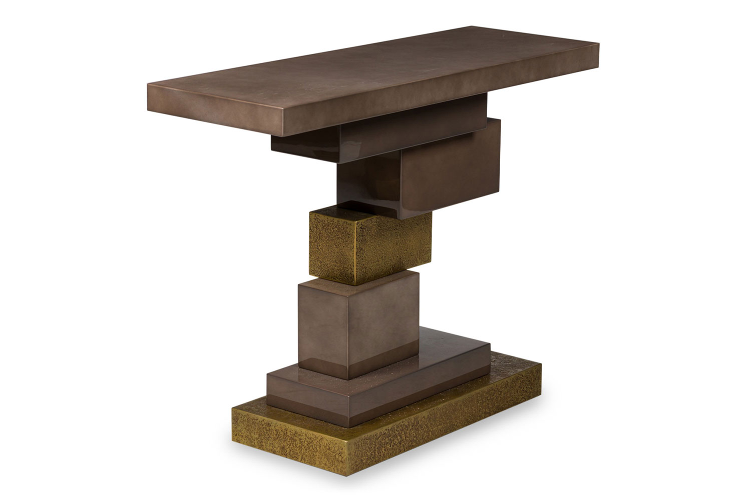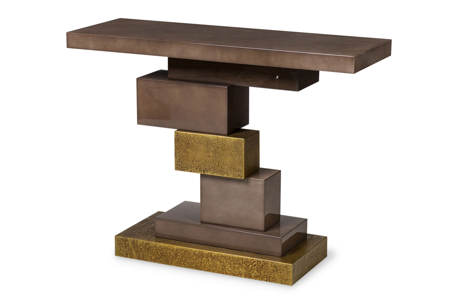 PAIR of French Contemporary "Kashmir" lacquered wood and bronze console tables featuring an asymmetrical stacked rectangle box design (signed: HERVE VAN DER STRAETEN) (PRICED AS PAIR)