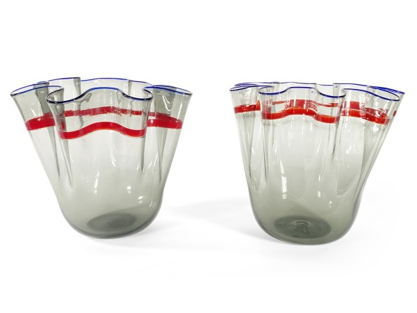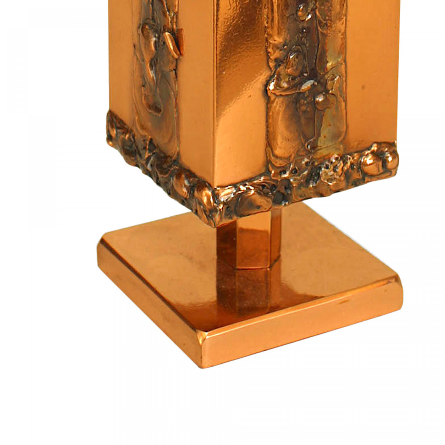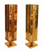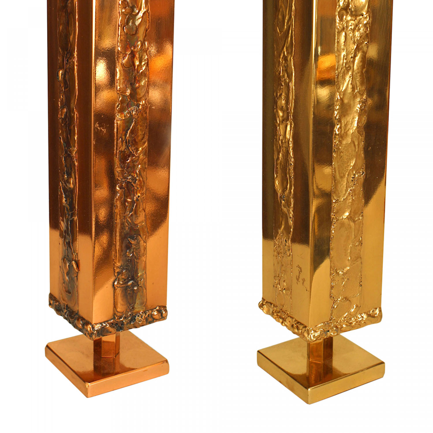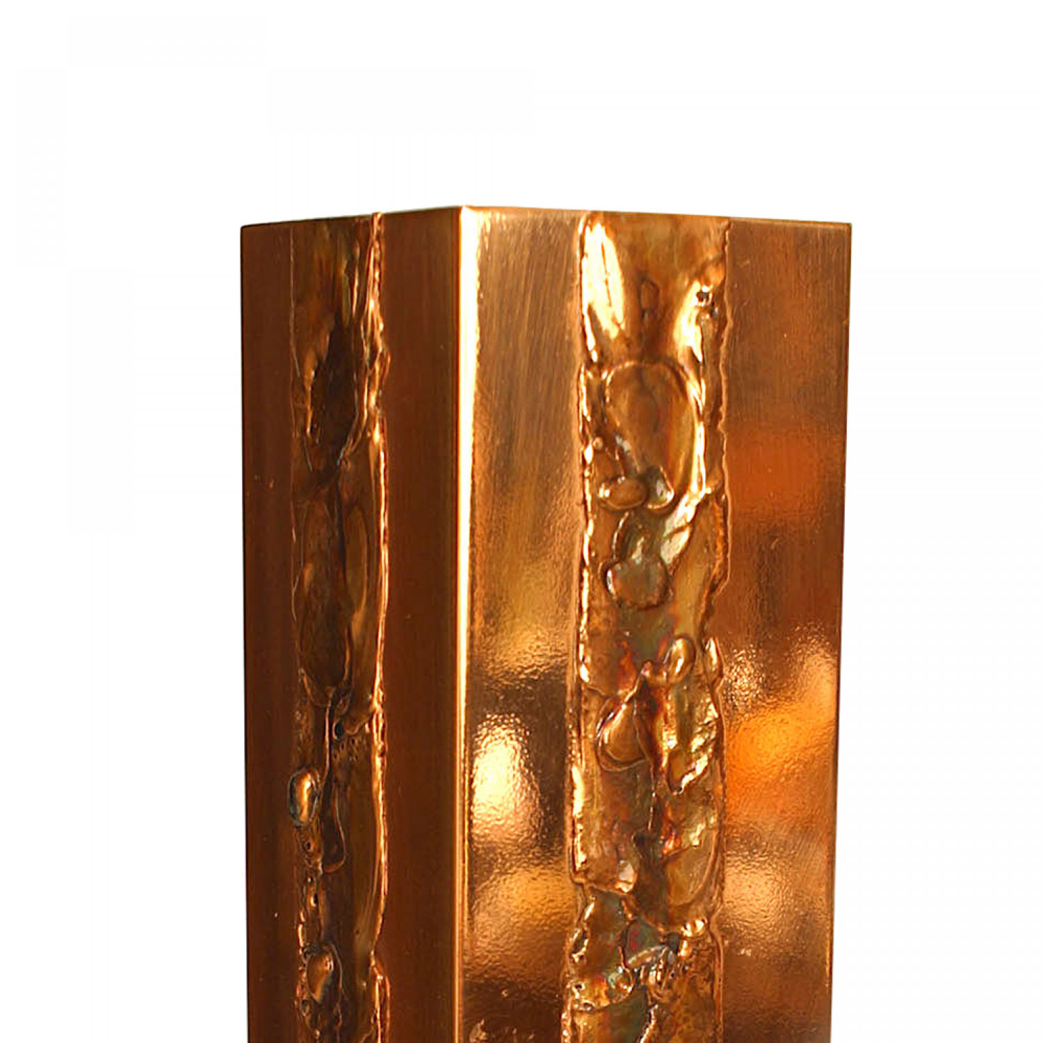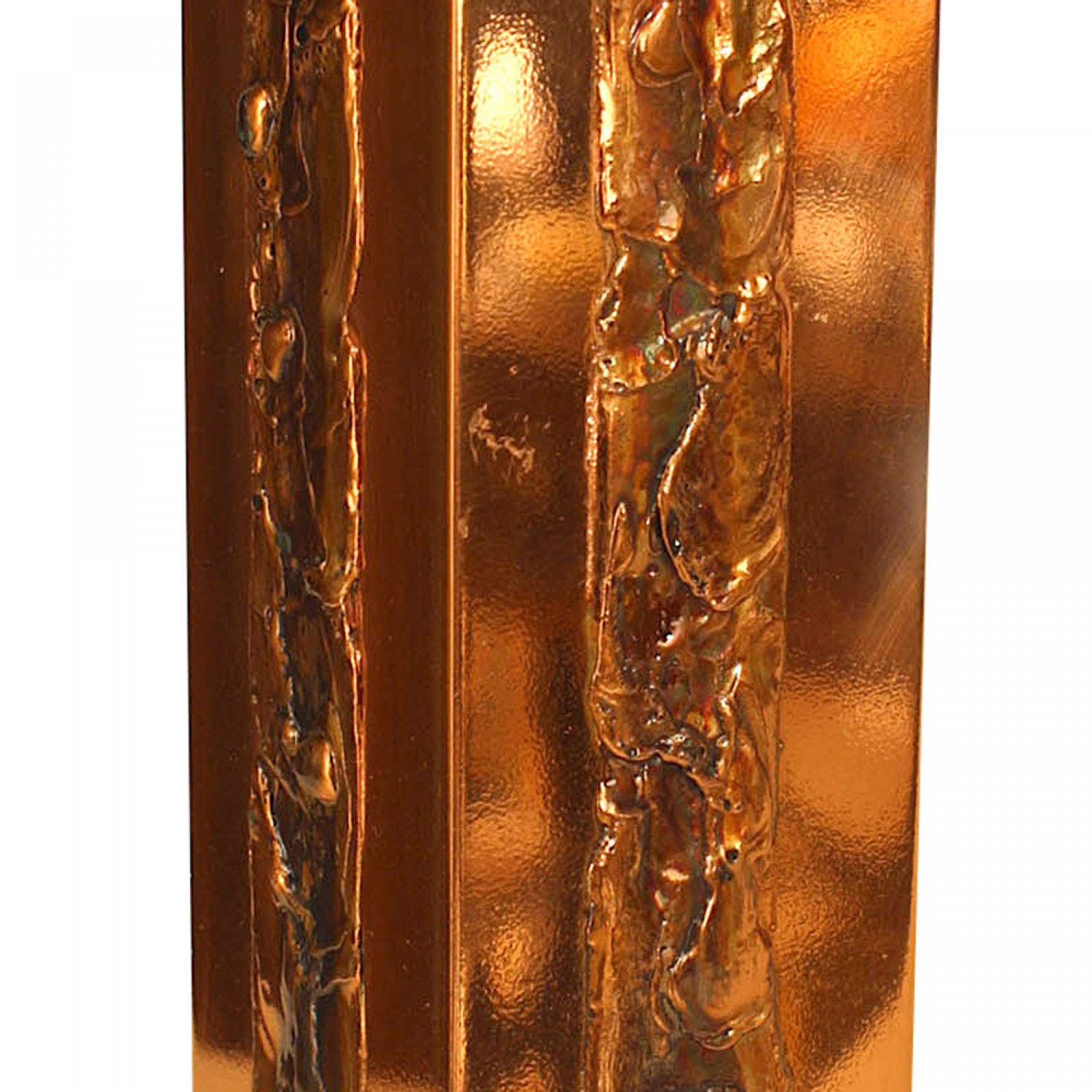 PAIR of Italian 1950s tall square vases (1 copper/1 brass) trimmed with a freeform relief and raised on a low pedestal over a square base. (PRICED AS PAIR).
