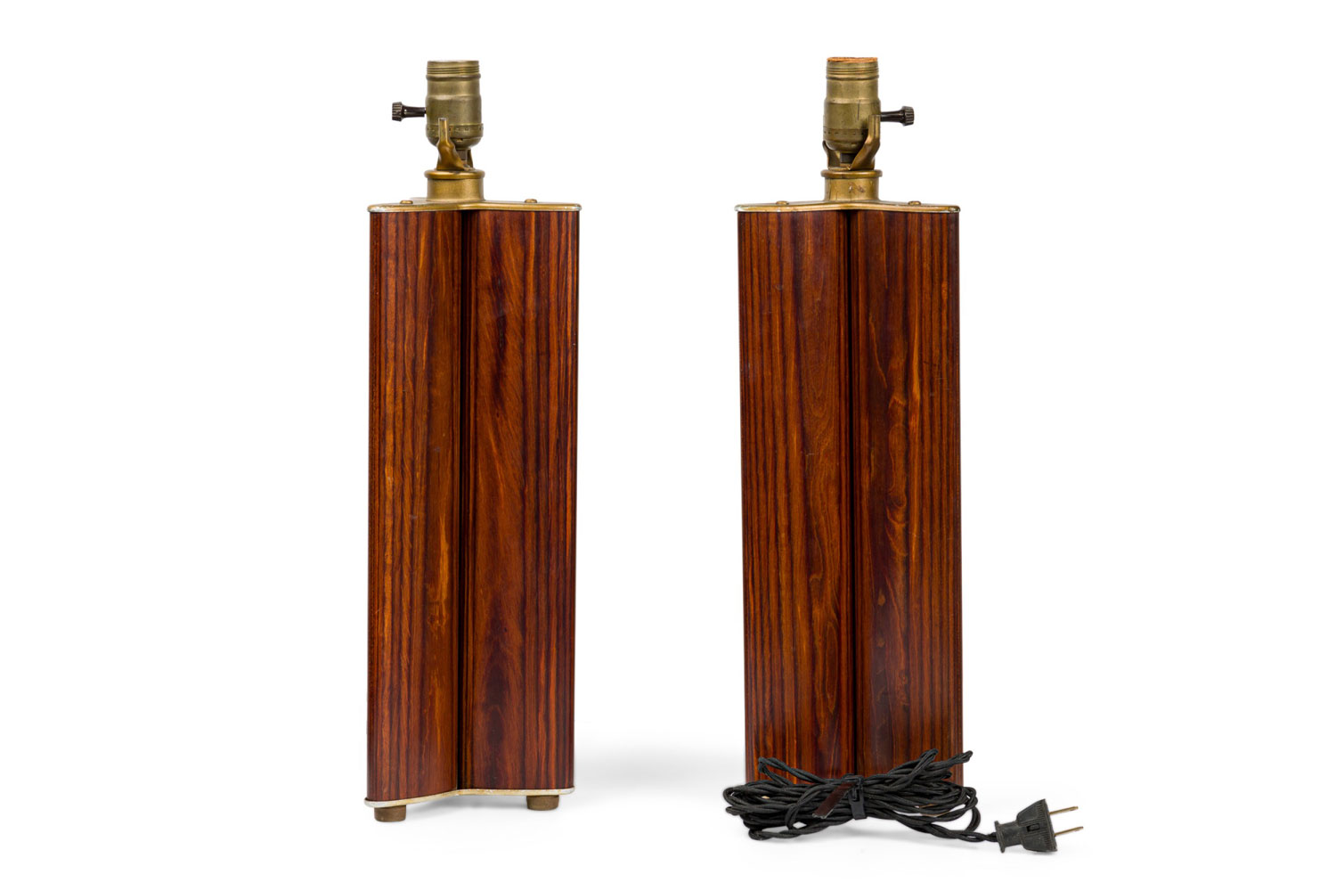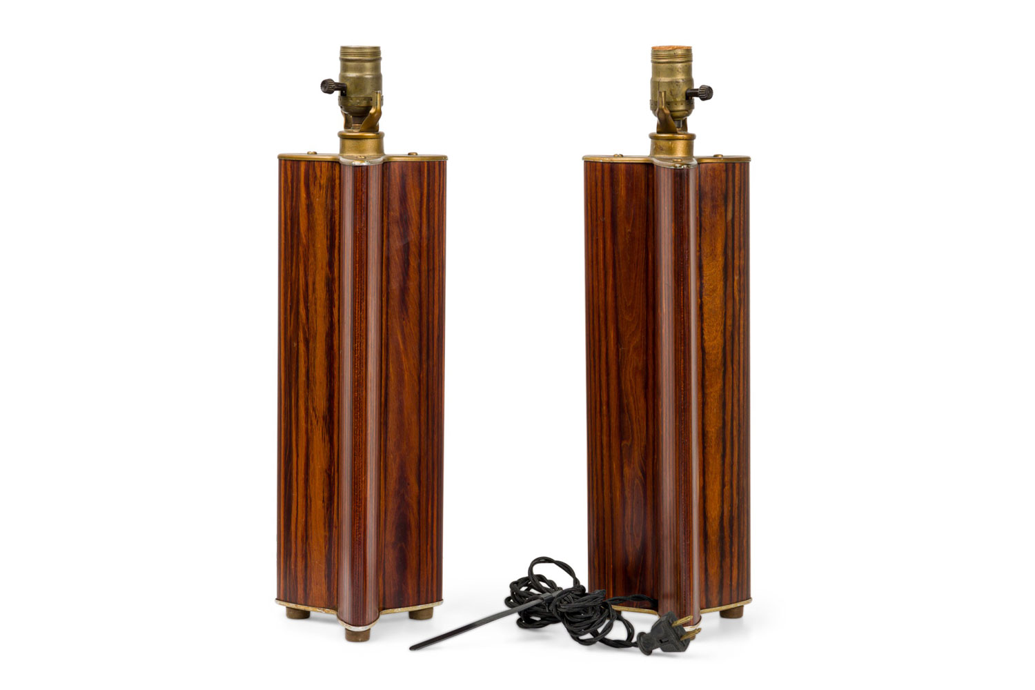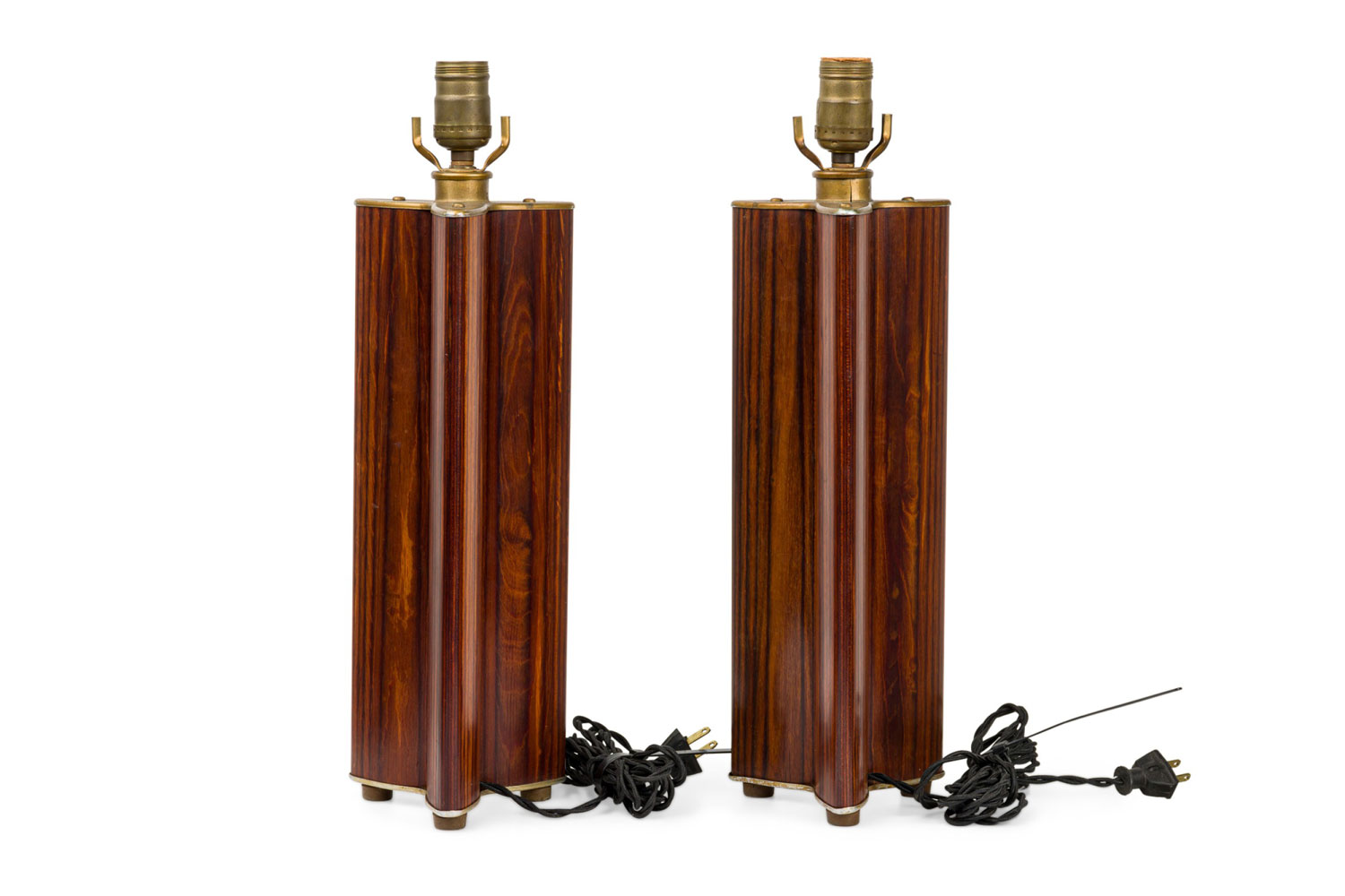 PAIR of Italian Mid-Century Solid Rosewood Column Table Lamps having a form of 3 concave connected panels (PRICED AS PAIR).