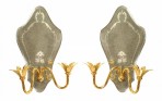 Style: Mid-Century Materials & Techniques: Brass, etched, glass Category: Lighting Condition: One sconce has a crack in the mirror glass. Good; Wear consistent with age and use