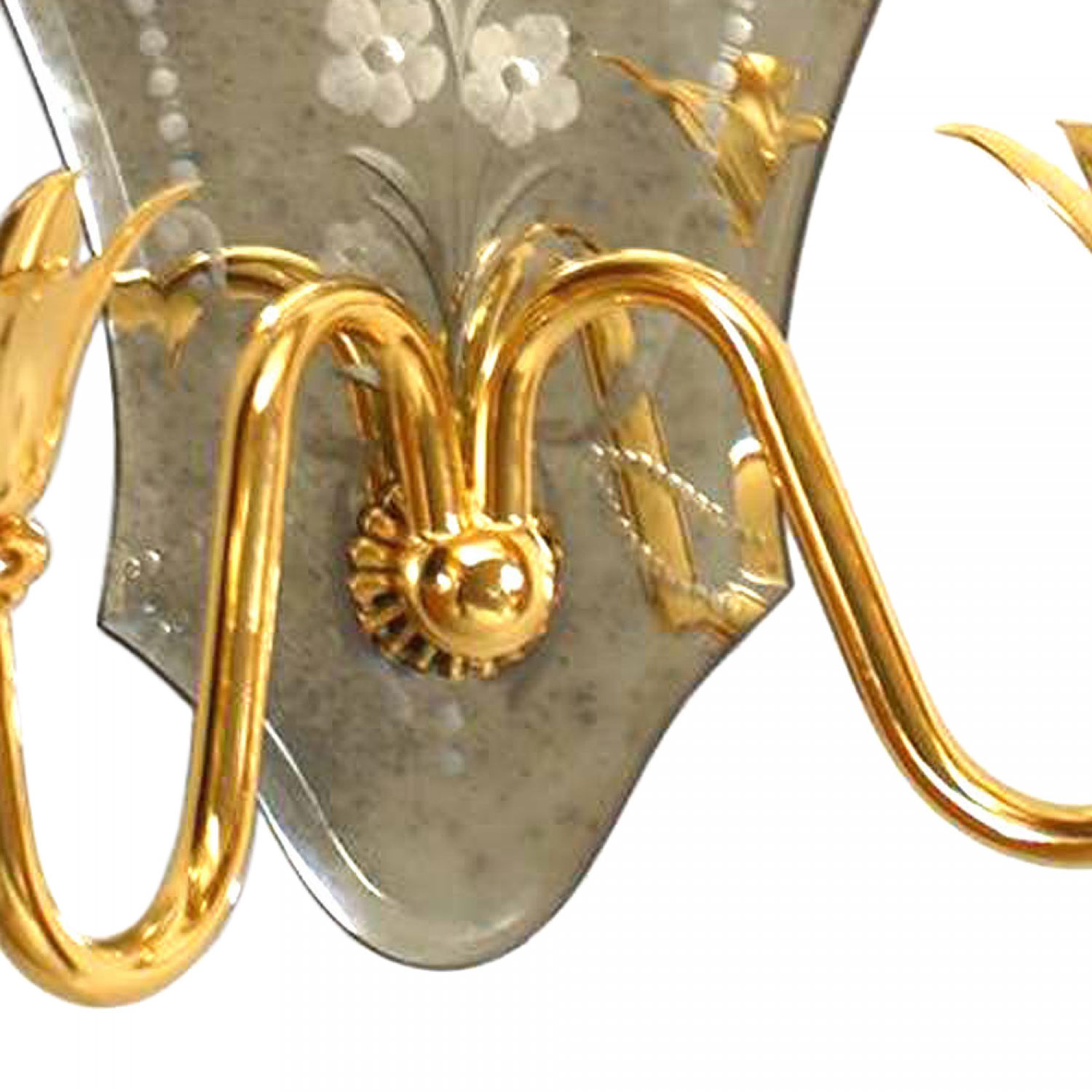 PAIR of Italian Murano sconces with shaped mirror back and etched with scroll & flower design with 2 brass scroll shaped arms with modern flower lights. (PRICED AS PAIR).