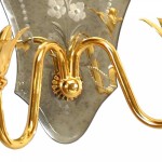 PAIR of Italian Murano sconces with shaped mirror back and etched with scroll & flower design with 2 brass scroll shaped arms with modern flower lights. (PRICED AS PAIR)