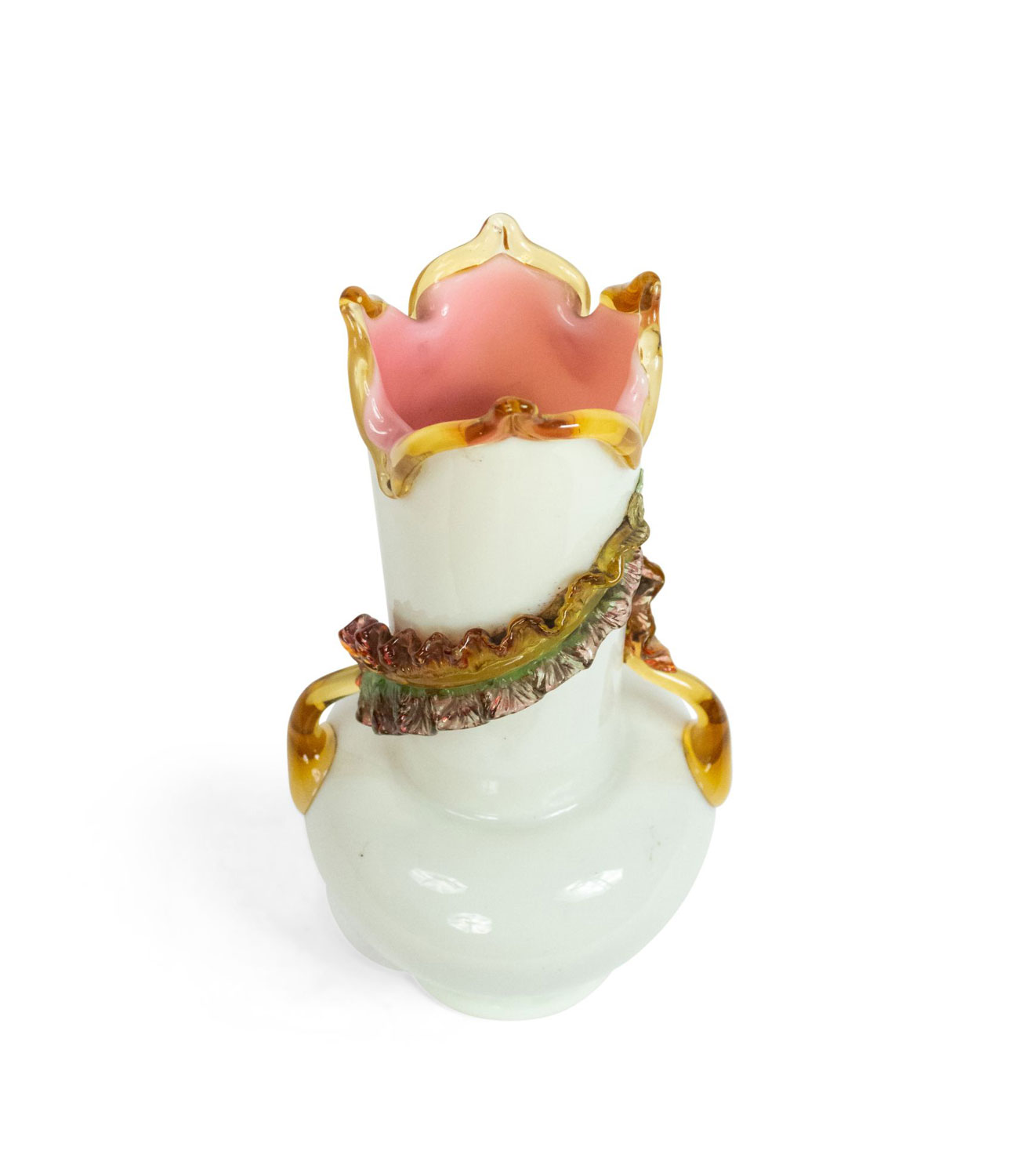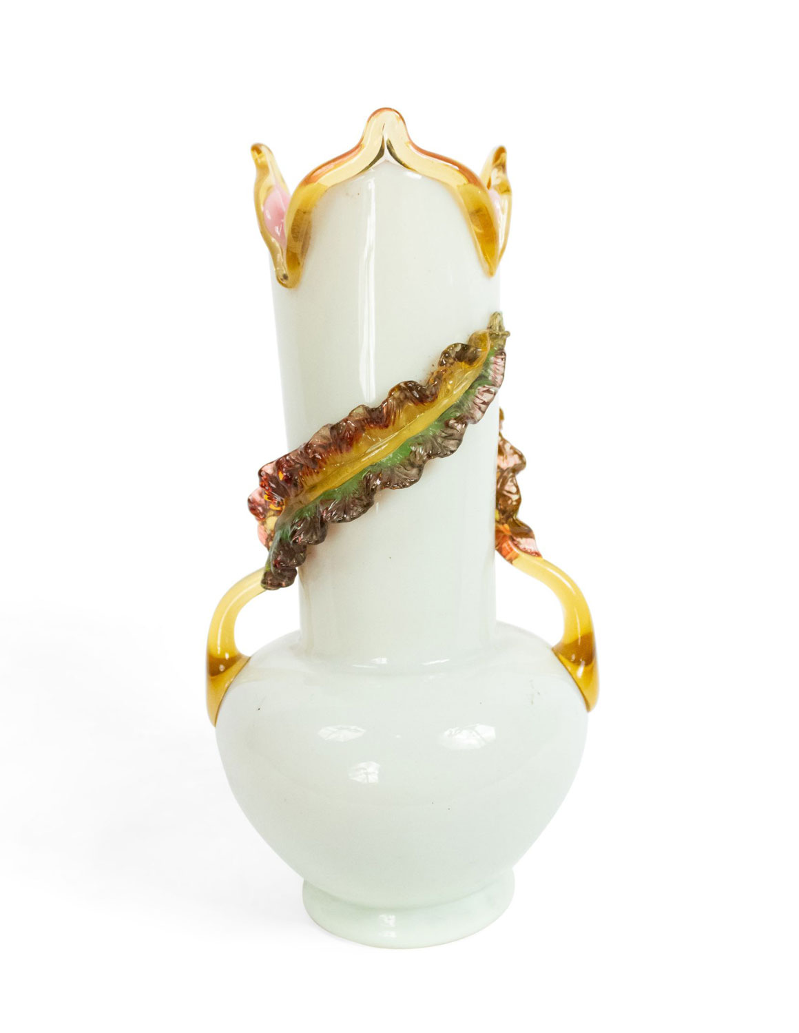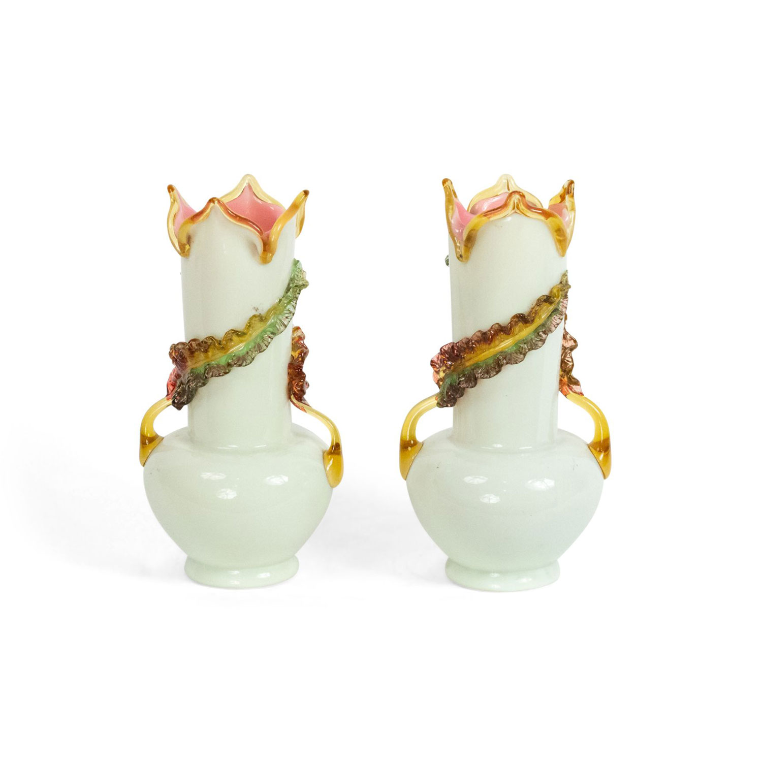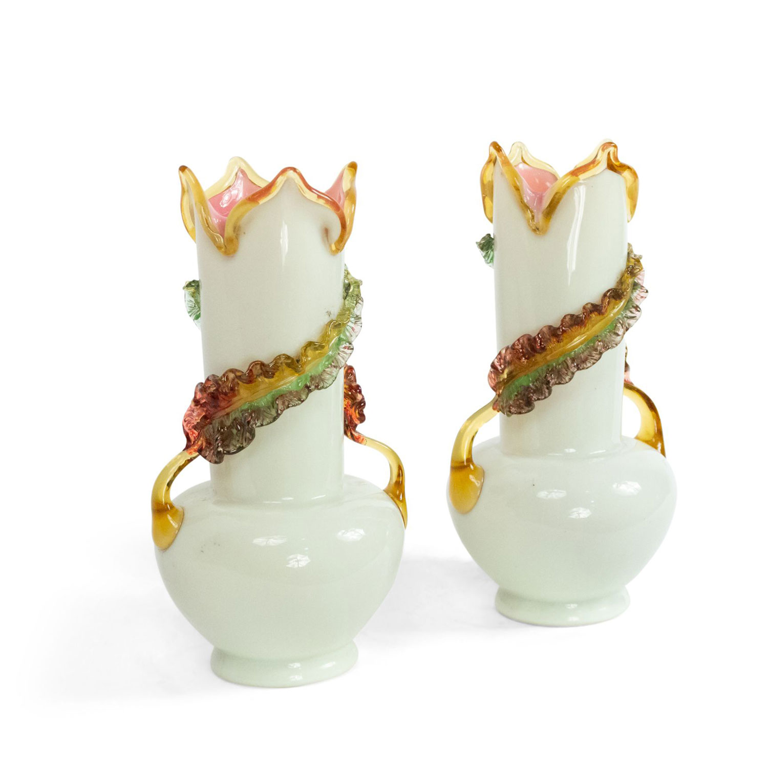 PAIR of Italian 1930's Murano white and pink glass vases with amber and colored leaf glass trim and shaped top. (PRICED AS PAIR).